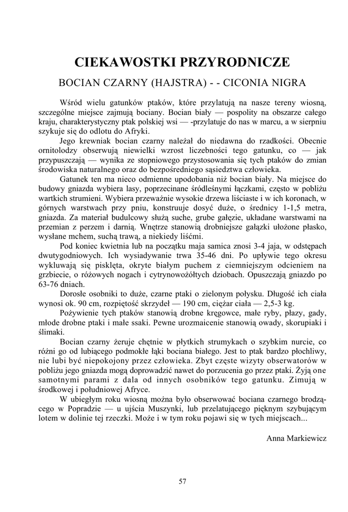 CIEKAWOSTKI PRZYRODNICZE BOCIAN CZARNY (HAJSTRA) - - CICONIA NIGRA Wśród wielu gatunków ptaków, które przylatują na nasze tereny wiosną, szczególne miejsce zajmują bociany. Bocian biały — pospolity na obszarze całego kraju, charakterystyczny ptak polskiej wsi — -przylatuje do nas w marcu, a w sierpniu szykuje się do odlotu do Afryki. Jego krewniak bocian czarny należał do niedawna do rzadkości. Obecnie ornitolodzy obserwują niewielki wzrost liczebności tego gatunku, co — jak przypuszczają — wynika ze stopniowego przystosowania się tych ptaków do zmian środowiska naturalnego oraz do bezpośredniego sąsiedztwa człowieka. Gatunek ten ma nieco odmienne upodobania niż bocian biały. Na miejsce do budowy gniazda wybiera lasy, poprzecinane śródleśnymi łączkami, często w pobliżu wartkich strumieni. Wybiera przeważnie wysokie drzewa liściaste i w ich koronach, w górnych warstwach przy pniu, konstruuje dosyć duże, o średnicy 1-1,5 metra, gniazda. Za materiał budulcowy służą suche, grube gałęzie, układane warstwami na przemian z perzem i darnią. Wnętrze stanowią drobniejsze gałązki ułożone płasko, wysłane mchem, suchą trawą, a niekiedy liśćmi. Pod koniec kwietnia lub na początku maja samica znosi 3-4 jaja, w odstępach dwutygodniowych. Ich wysiadywanie trwa 35-46 dni. Po upływie tego okresu wykluwają się pisklęta, okryte białym puchem z ciemniejszym odcieniem na grzbiecie, o różowych nogach i cytrynowożółtych dziobach. Opuszczają gniazdo po 63-76 dniach. Dorosłe osobniki to duże, czarne ptaki o zielonym połysku. Długość ich ciała wynosi ok. 90 cm, rozpiętość skrzydeł — 190 cm, ciężar ciała — 2,5-3 kg. Pożywienie tych ptaków stanowią drobne kręgowce, małe ryby, płazy, gady, młode drobne ptaki i małe ssaki. Pewne urozmaicenie stanowią owady, skorupiaki i ślimaki. Bocian czarny żeruje chętnie w płytkich strumykach o szybkim nurcie, co różni go od lubiącego podmokłe łąki bociana białego. Jest to ptak bardzo płochliwy, nie lubi być niepokojony przez człowieka. Zbyt częste wizyty obserwatorów w pobliżu jego gniazda mogą doprowadzić nawet do porzucenia go przez ptaki. Żyją one samotnymi parami z dala od innych osobników tego gatunku. Zimują w środkowej i południowej Afryce. W ubiegłym roku wiosną można było obserwować bociana czarnego brodzącego w Popradzie — u ujścia Muszynki, lub przelatującego pięknym szybującym lotem w dolinie tej rzeczki. Może i w tym roku pojawi się w tych miejscach... Anna Markiewicz 57