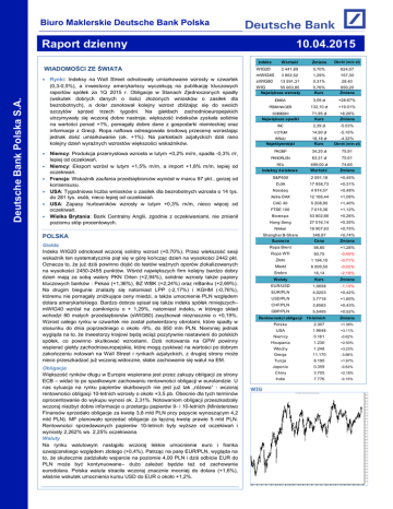 Biuro Maklerskie Deutsche Bank Polska Raport dzienny 10.04.2015 Deutsche Bank Polska S.A. WIADOMOŚCI ZE ŚWIATA Rynki: Indeksy na Wall Street odnotowały umiarkowane wzrosty w czwartek (0,3-0,5%), a inwestorzy amerykańscy wyczekują na publikację kluczowych raportów spółek za 1Q 2015 r. Obligacje w Stanach Zjednoczonych spadły (wskutek dobrych danych o ilości złożonych wniosków o zasiłek dla bezrobotnych), a dolar zanotował kolejny wzrost zbliżając się do swoich szczytów sprzed trzech tygodni. Na giełdach zachodnioeuropejskich utrzymywały się wczoraj dobre nastroje, większość indeksów zyskała solidnie na wartości ponad +1%, pomagały dobre dane z gospodarki niemieckiej oraz informacje z Grecji. Ropa naftowa odreagowała środową przecenę wzrastając jednak dość umiarkowanie (ok. +1%). Na parkietach azjatyckich dziś rano kolejny dzień wyraźnych wzrostów większości wskaźników. Indeks Wartość Zmiana Obrót (m ln zł) WIG20 mWIG40 sWIG80 WIG 2 441,89 0,70% 624,57 3 802,52 1,29% 157,30 13 591,31 0,31% 28,40 55 063,85 Największe wzrosty 0,76% Kurs 850,20 Zmiana 3,59 zł +28.67% 132,10 zł +19.01% SOBIESKI 71,95 zł Kurs +8.26% Zmiana Największe spadki Niemcy: Produkcja przemysłowa wzrosła w lutym +0,2% m/m, spadła -0,3% r/r, lepiej od oczekiwań. Niemcy: Eksport wzrósł w lutym +1,5% m/m, a import +1,8% m/m, lepiej od oczekiwań. Francja: Wskaźnik zaufania przedsiębiorców wyniósł w marcu 97 pkt., gorzej od konsensusu. USA: Tygodniowa liczba wniosków o zasiłek dla bezrobotnych wzrosła o 14 tys. do 281 tys. osób, nieco lepiej od oczekiwiań. USA: Zapasy hurtowników wzrosły w lutym +0,3% m/m, nieco więcej od oczekiwań. Wielka Brytania: Bank Centralny Anglii, zgodnie z oczekiwaniami, nie zmienił poziomu stóp procentowych. INC 2,39 zł -5.53% VOTUM 14,90 zł -5.10% BRIJU Najaktywniejsi 18,18 zł Kurs Obrót (m ln zł) PKOBP 34,20 zł 75,91 63,31 zł 75,01 PZU 499,00 zł Wartość 74,65 Zmiana S&P500 2 091,18 +0,45% DJIA 17 958,73 +0,31% Nasdaq 4 974,57 +0,48% Xetra DAX 12 166,44 +1,08% CAC 40 5 208,95 +1,40% FTSE 100 7 015,36 +1,12% Bovespa 53 802,66 +0,26% Hang Seng 27 016,14 +0,30% Nikkei 19 907,63 +0,75% Shanghai B-Share 346,87 +0,74% Surowce Cena Zmiana Ropa Brent 56,80 +1,28% Ropa WTI 50,75 -0,45% Złoto 1 194,10 -0,71% Miedź 6 000,50 -0,02% Srebro 16,14 -2,18% Waluty Kurs Zmiana EUR/USD 1,0658 -1,15% EUR/PLN 4,0203 +0,42% USD/PLN 3,7718 +1,60% CHF/PLN 3,8583 +0,43% GBP/PLN 5,5495 +0,52% Rentowności obligacji 10-letnich Zmiana Indeksy światowe Giełda Indeks WIG20 odnotował wczoraj solidny wzrost (+0,70%). Przez wiekszość sesji wskaźnik ten systematycznie piął się w górę kończąc dzień na wysokości 2442 pkt. Oznacza to, że już dziś powinno dojść do testów ważnych oporów zlokalizowanych na wysokości 2450-2455 punktów. Wśród największych firm kolejny bardzo dobry dzień mają za sobą walory PKN Orlen (+2,94%), solidnie wzrosły także papiery kluczowych banków : Pekao (+1,36%), BZ WBK (+2,24%) oraz mBanku (+2,69%). Na drugim biegunie znalazły się natomiast LPP (-2,17%) i KGHM (-0,76%), któremu nie pomagały zniżkujące ceny miedzi, a także umocnienie PLN względem dolara amerykańskiego. Bardzo dobrze spisał się także indeks spółek mniejszych– mWIG40 wzrósł na zamknięciu o + 1,29%, natomiast indeks, w którego skład wchodzi 80 małych przedsiębiorstw (sWIG80) zwyżkował nieznacznie o +0,19%. Wzrost całego rynku w czwartek nie został potwierdzony obrotami, które spadły w stosunku do dnia poprzedniego o około -9%, do 850 mln PLN. Niemniej jednak wygląda na to, że inwestorzy krajowi będą wciąż pozytywnie nastawieni do polskich spółek, co powinno skutkować wzrostami. Dziś notowania na GPW powinny wspierać giełdy zachodnioeuropejskie, które mogą zyskiwać na wartości po dobrym zakończeniu notowań na Wall Street i rynkach azjatyckich, z drugiej strony może nieco przeszkadzać już wczoraj widoczne, słabe zachowanie się walut na EM. -4.32% PKNORLEN a POLSKA Obligacje Większość rynków długu w Europie wspierana jest przez zakupy obligacji ze strony ECB – widać to po spadkowym zachowaniu rentowności obligacji w eurolandzie. U nas sytuacja na rynku papierów skarbowych nie jest już tak „różowa” - wczoraj rentowności obligacji 10-letnich wzrosły o około +3,5 pb. Obecnie dla tych terminów oprocentowanie do wykupu wynosi ok. 2,31%. Notowaniom obligacji przeszkadzały wczoraj niezbyt dobre informacje o przetargu papierów 9- i 10-letnich (Ministerstwo Finansów sprzedało obligacje za kwotę 3,8 mld PLN przy popycie wynoszącym 4,2 mld PLN). MF planowało sprzedać obligacje za łączną kwotę prawie 5 mld PLN. Rentowności sprzedawanych papierów 10-letnich były wyższe od oczekiwań i wyniosły 2,262% ws. 2,25% oczekiwana. Waluty Na rynku walutowym nastąpiło wczoraj lekkie umocnienie euro i franka szwajcarskiego względem złotego (+0,4%). Patrząc na parę EUR/PLN, wygląda na to, że skutecznie zadziałało wsparcie na poziomie 4,00 PLN i dziś odbicie EUR do PLN może być kontynuowane– dużo zależeć będzie też od zachowania eurodolara. Polska waluta straciła wczoraj znacznie mocniej do dolara (+1,6%), właśnie wskutek umocnienia kursu USD do EUR o około +1,2%. IDMSA PEMANAGER Polska 2.307 +1.36% USA 1.9648 +3.11% Niemcy 0.161 -0.62% Hiszpania 1.230 +2.50% Włochy 1.248 +3.23% Grecja 11.170 -3.66% Turcja 8.190 +1.87% Japonia 0.359 -0.83% Chiny 3.705 +2.18% Indie 7.776 -0.15% WIG W IG (53,885.92, 53,948.38, 53, 546. 29, 53,649.90, -488.441) 56500 56000 55500 55000 54500 54000 53500 53000 52500 52000 51500 51000 50500 50000 49500 49000 48500 48000 47500 47000 46500 46000 45500 45000 44500 44000 43500 43000 42500 42000 2013 May June July August September October Nov ember December2014 February March April May June July August September October Nov emberDecember 2015 February March April INFORMACJE Z POLSKICH SPÓŁEK Idea Bank– w ofercie publ