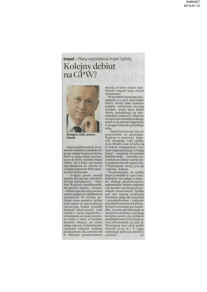 PARKIET 2013-07-12 Impel > Plany wydzielenia Impel Safety. Kolejny debiut na GPW? Grzegorz Dzik, prezes Impela Impel poinformował, że za mierza wydzielić z działalności grupy usługi bezpieczeństwa, które t o mają zostać przenie sione do firmy zależnej Impel Safety. Ta z kolei ma zostać wprowadzona do o b r o t u na Giełdzie Papierów Wartościo wych w Warszawie. - Podjęta p r z e z z a r z ą d Impela decyzja ma charakter decyzji kierunkowej - wyja śnia Wojciech Rembikowski, wiceprezes Impela, i dodaje: - Ostateczna decyzja powinna zostać podjęta w najbliższych miesiącach. W wyniku po działu nowy p o d m i o t będzie miał szanse na optymalizację operacyjną, będzie posiadał większą elastyczność, jeśli chodzi o ruchy kapitałowe i wchodzenie na wyżej rentow ne rynki, a także w bardziej niszowe obszary n a rynku usług ochrony. Podział będzie oznaczał r ó w n i e ż większą przejrzystość dla inwestorów w zakresie p o d e j m o w a n i a decyzji, w który obszar dzia łalności Impela będą chcieli inwestować. Wtej chwili I m p e l j e s t w p o siadaniu 100 proc. akcji Impel Safety. Kiedy tylko zostanie podjęta o s t a t e c z n a decyzja zarządu, wtedy akcje Impel Safety zadebiutują n a war szawskim parkiecie. Zdaniem wiceprezesa Rembikowskiego może t o się zdarzyć najpóźniej w drugim kwartale przyszłego roku. - Impel kontynuuje wzrost p r z y c h o d ó w ze sprzedaży. Kupione w czwartym kwar tale ubiegłego roku spółki, m.in. Brink's oraz Ad Acta, są w trakcie reorganizacji i sca lania organizacyjnego z Grupą Impel - zaznacza wiceprezes Rembikowski. - Jesteśmy na stawieni na dalszy rozwój ryn ku poprzez wzrost organiczny. Utrzymujemy swoją pozycję rynkową - kończy. Przypomnijmy, że spółka Impel powstała w 1990 roku. Świadczy ona usługi w zakre sie obsługi n i e r u c h o m o ś c i , zapewniania bezpieczeństwa czy szeroko rozumianych roz wiązań biznesowych. Spółka j e s t tym samym czołowym dostawcą usług dla instytucji i przedsiębiorstw i jedynym przedsiębiorstwem w tej bran ży, które notowane jest na gieł dzie. Łącznie jak informuje na swojej stronie firma, z jej usług korzysta nawet 4 tys. polskich przedsiębiorstw. Przychody za 2012 rok wyniosły 1,41 mld zl. Wczorajszy kurs akcji spółki wynosił 32,09 zł i w ciągu ostatniego półrocza wzrósł o 3,26 proc. SOB