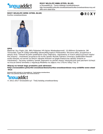 ROXY WILDLIFE WMN (STEEL BLUE) w Snowaddict.pl - Twoim katalogu snowboardowym http://snowaddict.pl/kurtki-snowboardowe/kurtka-snowboardowa-roxy-wil dlife-wmn-steel-blue ROXY WILDLIFE WMN (STEEL BLUE) Kurtka snowboardowa OPIS Materiał: Dry Flight 15K, 96% Poliester/ 4% Nylon Wodoodporność: 15.000mm Ocieplenie: 3M Thinsulate Type M (100g tułów/80g rękawy/60g kaptur) Podszewka: tłoczona tafta, przyjemna w dotyku Krój: Tailored W pełni podklejone szwy Odpinany, regulowany w trzech płaszczyznach kaptur Pas śnieżny - możliwość przypięcia do kurtki spodni Wysoki kołnierz chroniący podbródek Kieszeń audio Kieszeń na karnet na lewym rękawie Kieszeń na gogle Elastyczne rękawy śnieżne w mankietach Tęczowy ozdobny zamek Zapinane na zamek otwory wentylacyjne pod pachami Uchwyt na klucze Dolna lamówka z regulacją Modelka na zdjęciu ma 175cm/ 55kg i roz. S Więcej na temat tego produktu pod adresem: http://snowaddict.pl/kurtki-snowboardowe/kurtka-snowboardowa-roxy-wildlife-wmn-steel -blue Dokument PDF pochodzi ze Snowaddict.pl - Twój katalog snowboardowy Data i czas pobrania dokumentu: 2017-03-04 04:40:13 © 2011-2017 Snowaddict.pl - Twój katalog snowboardowy strona 1 / 1 Powered by TCPDF (www.tcpdf.org)