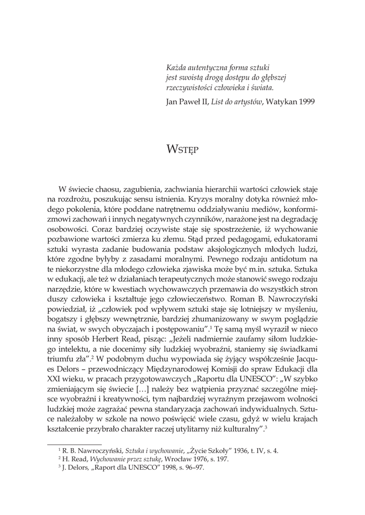 Każda autentyczna forma sztuki jest swoistą drogą dostępu do głębszej rzeczywistości człowieka i świata. Jan Paweł II, List do artystów, Watykan 1999 Wstęp W świecie chaosu, zagubienia, zachwiania hierarchii wartości człowiek staje na rozdrożu, poszukując sensu istnienia. Kryzys moralny dotyka również młodego pokolenia, które poddane natrętnemu oddziaływaniu mediów, konformizmowi zachowań i innych negatywnych czynników, narażone jest na degradację osobowości. Coraz bardziej oczywiste staje się spostrzeżenie, iż wychowanie pozbawione wartości zmierza ku złemu. Stąd przed pedagogami, edukatorami sztuki wyrasta zadanie budowania podstaw aksjologicznych młodych ludzi, które zgodne byłyby z zasadami moralnymi. Pewnego rodzaju antidotum na te niekorzystne dla młodego człowieka zjawiska może być m.in. sztuka. Sztuka w edukacji, ale też w działaniach terapeutycznych może stanowić swego rodzaju narzędzie, które w kwestiach wychowawczych przemawia do wszystkich stron duszy człowieka i kształtuje jego człowieczeństwo. Roman B. Nawroczyński powiedział, iż „człowiek pod wpływem sztuki staje się lotniejszy w myśleniu, bogatszy i głębszy wewnętrznie, bardziej zhumanizowany w swym poglądzie na świat, w swych obyczajach i postępowaniu”.1 Tę samą myśl wyraził w nieco inny sposób Herbert Read, pisząc: „Jeżeli nadmiernie zaufamy siłom ludzkiego intelektu, a nie docenimy siły ludzkiej wyobraźni, staniemy się świadkami triumfu zła”.2 W podobnym duchu wypowiada się żyjący współcześnie Jacques Delors – przewodniczący Międzynarodowej Komisji do spraw Edukacji dla XXI wieku, w pracach przygotowawczych „Raportu dla UNESCO”: „W szybko zmieniającym się świecie […] należy bez wątpienia przyznać szczególne miejsce wyobraźni i kreatywności, tym najbardziej wyraźnym przejawom wolności ludzkiej może zagrażać pewna standaryzacja zachowań indywidualnych. Sztuce należałoby w szkole na nowo poświęcić wiele czasu, gdyż w wielu krajach kształcenie przybrało charakter raczej utylitarny niż kulturalny”.3 R. B. Nawroczyński, Sztuka i wychowanie, „Życie Szkoły” 1936, t. IV, s. 4. H. Read, Wychowanie przez sztukę, Wrocław 1976, s. 197. 3 J. Delors, „Raport dla UNESCO” 1998, s. 96–97. 1 2 8 Wstęp Również w terapii przypada sztuce rola szczególna. Terapia przez sztukę jest obecnie uznaną formą pomocy psychologicznej wspomagającą proces leczenia, rehabilitacji, znajdującą zastosowanie w rewalidacji i resocjalizacji. Techniki pracy stosowane w arteterapii służą zarówno osobom, które ujawniają trudności w realizacji zadań życiowych, jak i tym, którzy pragną dos konalić jakość własnej egzystencji w relacjach z innymi, rozwijać zdolności twórcze i własną osobowość. Służy zatem leczeniu, wspieraniu rozwoju i profilaktyce. Działania z wykorzystaniem sztuki zmierzają ku temu: „ażeby człowiek stawał się coraz bardziej człowiekiem, ażeby bardziej był, a nie tylko więcej miał; aby więc poprzez wszystko, co ma, co posiada, umiał bardziej i pełniej być człowiekiem, to znaczy, ażeby również umiał bardziej być nie tylko z drugimi, ale i dla drugich”.4 I wreszcie – sztuka doskonale integruje ludzi i przełamuje bariery w kontakcie z osobami niepełnosprawnymi, toteż działania o charakterze artystycznym mogą stać się doskonałym narzędziem w procesie aktywizacji oraz rehabilitacji społecznej i zawodowej. Przekazany do rąk czytelników tom jest zbiorem artykułów traktujących o wartości edukacyjnej i terapeutycznej sztuki. Prezentowane teksty zawierają zarówno rozważania natury teoretycznej, jak i refleksje wynikające z praktyki szkolnej oraz doświadczeń wyniesionych z pracy z osobami niepełnosprawnymi. Autorami artykułów są pracownicy naukowo-dydaktyczni różnej proweniencji; związani zarówno z lubelskim środowiskiem uniwersyteckim – Wydziałem Pedagogiki i Psychologii oraz Wydziałem Artystycznym UMCS, jak i innymi ośrodkami naukowymi: Uniwersytetem Śląskim w Katowicach, Uniwersytetem Jagiellońskim w Krakowie, Uniwersytetem Mikołaja Kopernika w Toruniu, Akademią Pedagogiki Specjalnej w Warszawie i Państwową Wyższą Szkołą Zawodową w Płocku. Niezależnie od specjalistycznego profilu zainteresowań badawczych poszczególnych autorów publikacji punktem wspólnym dla wszystkich jest zainteresowanie sztuką jako wartością i jej oddziaływaniem na osobowość podopiecznego – wychowanka, ucznia, uczestnika warsztatów artystycznych. Spośród pierwszej grupy opracowań stanowiących podbudowę teoretyczną na uwagę zasługują interesujące teksty: Urszuli Szuścik Twórczość dziecka w świetle wybranych koncepcji psychologii i pedagogiki twórczości oraz bliskie pod względem problematyki opracowanie Agnieszki Weiner Rozwój muzyczny człowieka – wybrane ujęcia. W obydwu przypadkach Autorki analizują złożoność natury procesu twórczego, ukazują wpływ ekspresji na rozwój potencjalnych możliwości i zdolności człowieka, dzięki którym osiągnie on pozytywne reBł. Jan Paweł II, Przemówienie w siedzibie Organizacji Narodów Zjednoczonych do spraw Oświaty, Nauki i Kultury (UNESCO), twrsk.nazwa.pl/www/images/2012/1.pdt, (12-02-2012). 4 Wstęp 9 zultaty dla swojego ogólnego rozwoju. Marek Mariusz Tytko, jeden ze swoich tekstów poświęca aksjologicznej koncepcji pedagogiki kultury w ujęciu Stefana Szumana, jak dotąd mało znanej i mało spopularyzowanej. Drugi artykuł tego samego Autora, Kultura słowa wobec kultury plastycznej, zawiera istotny w edukacji plastycznej zasób słownictwa odnoszący się do takich miejsc realizacji aktywności plastycznej, jak: pracownie artystów i zbiory sztuki. Mieszczący się w tej części tomu tekst Małgorzaty Stępnik przedstawia wzajemne przenikanie różnych światów artystycznych jako swoiste signum temporis mogące dziś stanowić dla socjolog