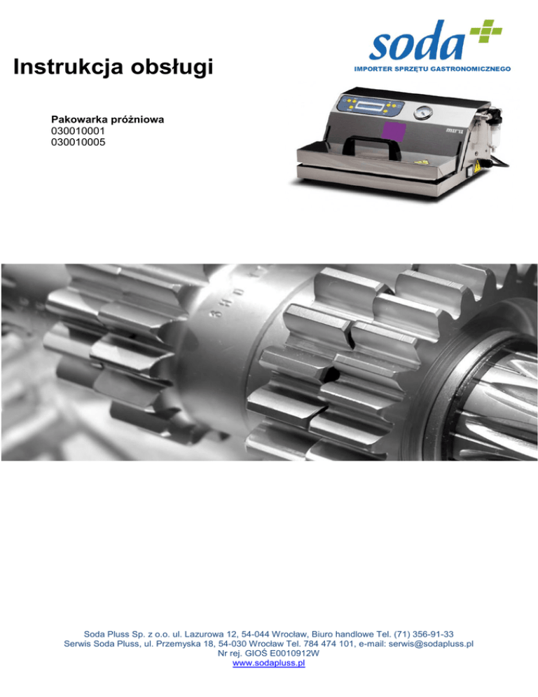Instrukcja obsługi Pakowarka próżniowa 030010001 030010005 Soda Pluss Sp. z o.o. ul. Lazurowa 12, 54-044 Wrocław, Biuro handlowe Tel. (71) 356-91-33 Serwis Soda Pluss, ul. Przemyska 18, 54-030 Wrocław Tel. 784 474 101, e-mail: [email protected] Nr rej. GIOŚ E0010912W www.sodapluss.pl Instrukcja obsługi 1. 2. 3. 4. 5. 6. Główny przełącznik Przycisk wyboru programów (mode key) Przycisk programowania urządzenia Przycisk regulujący (+) Przycisk regulujący (-) Przycisk uruchamianie pompy próżniowej Urządzenie zostało zaprojektowane dla celów próżniowego pakowania żywności. Nie zaleca się wykorzystania innego niż wyszczególnione w niniejszej instrukcji. Nieprawidłowe, lub różne od przeznaczonego wykorzystanie unieważnia gwarancję i może spowodować uszkodzenie komponentów pakowarki, co w efekcie uniemożliwi spełnianie właściwych funkcji urządzenia. WAŻNE Instrukcję należy uważnie przeczytać przed rozpoczęciem pracy z urządzeniem i przechowywać ją łącznie z nim, aby mieć możliwość skorzystania z zawartych w niej wskazówek w przyszłości. Środowisko pracy urządzenia musi być suche i czyste. Urządzenie należy użytkować i przechowywać z dala od dzieci. Pakowarkę należy wykorzystywać wyłącznie w celu do jakiego została przeznaczona. Użytkowanie niezgodne z przeznaczeniem skutkuje utratą gwarancji i może być niebezpieczne. Urządzenia nie należy przeciążać, należy obchodzić się z nim ostrożnie. Urządzenie powinno stać na stabilnej, bezpiecznej powierzchni. Upadek może spowodować poważne uszkodzenia. Nie wolno pakować do woreczków płynnej żywności lub substancji – mogłoby to być niebezpieczne i spowodować nie dające się naprawić uszkodzenie urządzenia. Aby zapakować produkty zawierające dużą ilość płynów, należy delikatnie usunąć nadmiar płynów za pomocą ściereczki bądź papieru do żywności; alternatywnie można wykorzystać do pakowania sztywnych pojemników, lub słoi z pokrywą w różnych rozmiarach oferowanych przez producenta. Przed rozpoczęciem pracy z urządzeniem należy upewnić się, że w pobliżu listwy zgrzewającej nie ma żadnych obcych obiektów (noży, ostrzy, narzędzi). Przed rozpoczęciem jakichkolwiek operacji związanych z czyszczeniem urządzenia, sprawdzaniem zapakowanych produktów, regulowaniem itp. należy maszynę wyłączyć i odłączyć od źródła zasilania, aby uniknąć niespodziewanego uruchomienia. Takie środki ostrożności muszą być także przedsięwzięte na okres, kiedy urządzenie nie pracuje. Należy sprawdzić czy napięcie sieci zasilania i częstotliwość są zgodne z wyświetlanymi przez maszynę, i że wtyczka jest dostosowana do pobieranego zasilania. Należy używać wyłącznie oryginalnych części zamiennych i akcesoriów. Jest to urządzenie elektryczne. Pod żadnym pozorem nie wolno zanurzać go w wodzie. Nie wolno wystawiać urządzenia pod strumień wody. Nigdy, w celu wyłączenia urządzenia, nie wolno ciągnąć za kabel. Używane podłączenie musi bezwzględnie posiadać uziemienie a instalacja elektryczna musi posiadać automatyczny bezpiecznik. Soda Pluss Sp. z o.o. ul. Lazurowa 12, 54-044 Wrocław, Biuro handlowe Tel. (71) 356-91-33 Serwis Soda Pluss, ul. Przemyska 18, 54-030 Wrocław Tel. 784 474 101, e-mail: [email protected] Nr rej. GIOŚ E0010912W www.sodapluss.pl Instrukcja obsługi Wymiana przewodu bądź napraw elektrycznych musi być powierzona wyłącznie wyspecjalizowanemu personelowi. INSTRUKCJA OBSŁUGI I KONSERWACJI WAŻNE Urządzenie musi być instalowane i użytkowane jednocześnie wyłącznie przez jednego użytkownika. Nie jest przeznaczone do użytkowania przez kilka osób w tym samym czasie. OPIS URZĄDZENIA Urządzenie składa się z głównego korpusu zbudowanego całkowicie z AISI 304 stali nierdzewnej, wewnątrz znajduje się elektryczny panel i generator próżni . W jednostkach „pracujących” nie jest wymagana żadna interwencja użytkownika. Zaleca się by użytkownik nie ingerował w żaden sposób w pracę urządzenia, poza specjalnymi operacjami opisanymi w niniejszej instrukcji. Listwa zgrzewająca, która zamyka woreczek na zakończenie procesu pakowania jest umieszczona na zewnątrz komory próżniowej, na dolnym brzegu przodu urządzenia. Komorę dekompresyjną, do której wkłada się otwarty brzeg torebki ogranicza uszczelka. Górną część komory dekompresyjnej stanowi ruchoma pokrywa połączona z całością za pomocą dwóch zawiasów, tak by można było wsunąć pod nią otwarty brzeg woreczka podczas procesu pakowania. WŁĄCZANIE PAKOWARKI Wyjąć urządzenie z opakowania, ustawić na płaskiej i stabilnej powierzchni. Ważnym jest, aby cztery stopki urządzenia spoczywały na równej powierzchni – tylko wtedy ruchoma pokrywa i dolna część maszyny będą działać prawidłowo. Takie ustawienie gwarantuje prawidłowe wytwarzanie próżni. Należy zachować opakowanie urządzenia na wypadek, gdyby zaistniała potrzeba wysłania go do naprawy. Przed włączeniem urządzenia należy je delikatnie oczyścić. Aby oczyścić zewnętrzny korpus, należy przetrzeć go najpierw wilgotną, a następnie suchą ściereczką . Do oczyszczenia panelu kontrolnego należy używać wyłącznie suchej ściereczki. Pod żadnym pozorem nie wolno używać kwaśnych, bądź żrących środków. Należy nacisnąć i przytrzymać przez ok. 2 s główny przełącznik (1) . Po chwili od włączenia urządzenie jest gotowe do pracy w trybie i czasie zgrzewania wybranym podczas ostatnio używanych ustawień. Należy wybrać potrzebny tryb pracy poprzez naciśnięcie przycisku „mode key” (2). → Patrz ustęp „TRYB DZIAŁANIA” USTAWIANIE JĘZYKA Aby ustawić język na wyświetlaczu należy: Włączyć urządzenie – przycisk 1 W ciągu 3 sekund, na wyświetlaczu pojawi się komunikat, W ciągu tych trzech sekund należy nacisnąć przycisk ustawiania programowania „SET” (3). J