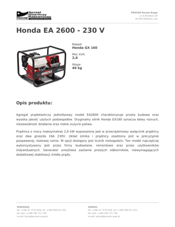 PROCOM Renata Bugaj ul. 6 Września 39 05-504 Złotokłos, Łoś Honda EA 2600 - 230 V Napęd: Honda GX 160 Moc kVA: 2,6 Waga: 40 kg Opis produktu: Agregat prądotwórczy jednofazowy model EA2600 charakteryzuje prosta budowa oraz wysoka jakość użytych podzespołów. Oryginalny silnik Honda GX160 oznacza łatwy rozruch, niezawodność działania oraz niskie zużycie paliwa. Prądnica o mocy maksymalnej 2,6 kW wyposażona jest w przeciążeniowy wyłącznik prądnicy oraz dwa gniazda 16A 230V. Układ silnika i prądnicy osadzony jest w precyzyjnie pospawanej, stalowej ramie. W opcji dostępny jest licznik motogodzin. Ten model najczęściej wykorzystywany jest przez firmy budowlane, remontowe oraz przez użytkowników indywidualnych. Generator umożliwia zasilanie prostych odbiorników, niewymagających dodatkowej stabilizacji źródła prądu. SPRZEDAŻ: tel. (+48) 22 73 63 816, tel. (+48) 509 011 421, SERWIS: tel. (+48) 22 73 63 816, tel. (+48) 509 011 421, tel. kom. (+48) 530 711 730, tel. kom. (+48) 530 711 730, e-mail: [email protected] e-mail: [email protected]