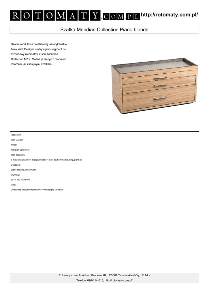 http://rotomaty.com.pl/ Szafka Meridian Collection Piano blonde Szafka modułowa prestiżowej, amerykańskiej firmy Wolf Designs służąca jako segment do rozbudowy rotomatów z serii Meridian Collection M2.7. Można ją łączyć z modułem rotomatu jak i kolejnymi szafkami. Producent: Wolf Designs Model: Meridian Collection Ilość zegarków: 5 miejsc na zegarki w dużej szufladzie + dwie szuflady na biżuterię, pióra itp. Obudowa: Jasne drewno, lakierowane Wymiary: 394 x 152 x 203 mm Inne: Dodatkowy moduł do rotomatów Wolf Designs Meridian Rotomaty.com.pl - Adres: Grabowa 62, 42-609 Tarnowskie Góry, Polska Telefon: 696-114-513, http://rotomaty.com.pl/ http://rotomaty.com.pl/ Rotomaty.com.pl - Adres: Grabowa 62, 42-609 Tarnowskie Góry, Polska Telefon: 696-114-513, http://rotomaty.com.pl/