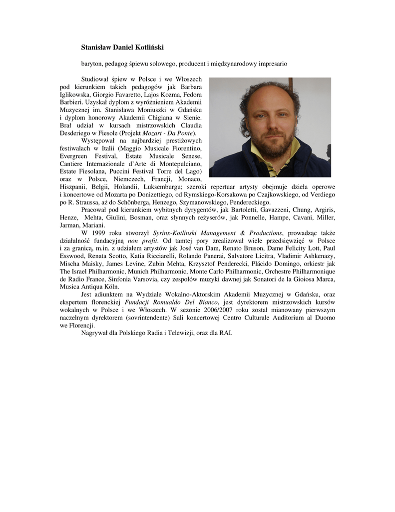 Stanisław Daniel Kotliński baryton, pedagog śpiewu solowego, producent i międzynarodowy impresario Studiował śpiew w Polsce i we Włoszech pod kierunkiem takich pedagogów jak Barbara Iglikowska, Giorgio Favaretto, Lajos Kozma, Fedora Barbieri. Uzyskał dyplom z wyróżnieniem Akademii Muzycznej im. Stanisława Moniuszki w Gdańsku i dyplom honorowy Akademii Chigiana w Sienie. Brał udział w kursach mistrzowskich Claudia Desderiego w Fiesole (Projekt Mozart - Da Ponte). Występował na najbardziej prestiżowych festiwalach w Italii (Maggio Musicale Fiorentino, Evergreen Festival, Estate Musicale Senese, Cantiere Internazionale d’Arte di Montepulciano, Estate Fiesolana, Puccini Festival Torre del Lago) oraz w Polsce, Niemczech, Francji, Monaco, Hiszpanii, Belgii, Holandii, Luksemburgu; szeroki repertuar artysty obejmuje dzieła operowe i koncertowe od Mozarta po Donizettiego, od Rymskiego-Korsakowa po Czajkowskiego, od Verdiego po R. Straussa, aż do Schönberga, Henzego, Szymanowskiego, Pendereckiego. Pracował pod kierunkiem wybitnych dyrygentów, jak Bartoletti, Gavazzeni, Chung, Argiris, Henze, Mehta, Giulini, Bosman, oraz słynnych reżyserów, jak Ponnelle, Hampe, Cavani, Miller, Jarman, Mariani. W 1999 roku stworzył Syrinx-Kotlinski Management & Productions, prowadząc także działalność fundacyjną non profit. Od tamtej pory zrealizował wiele przedsięwzięć w Polsce i za granicą, m.in. z udziałem artystów jak José van Dam, Renato Bruson, Dame Felicity Lott, Paul Esswood, Renata Scotto, Katia Ricciarelli, Rolando Panerai, Salvatore Licitra, Vladimir Ashkenazy, Mischa Maisky, James Levine, Zubin Mehta, Krzysztof Penderecki, Plácido Domingo, orkiestr jak The Israel Philharmonic, Munich Philharmonic, Monte Carlo Philharmonic, Orchestre Philharmonique de Radio France, Sinfonia Varsovia, czy zespołów muzyki dawnej jak Sonatori de la Gioiosa Marca, Musica Antiqua Köln. Jest adiunktem na Wydziale Wokalno-Aktorskim Akademii Muzycznej w Gdańsku, oraz ekspertem florenckiej Fundacji Romualdo Del Bianco, jest dyrektorem mistrzowskich kursów wokalnych w Polsce i we Włoszech. W sezonie 2006/2007 roku został mianowany pierwszym naczelnym dyrektorem (sovrintendente) Sali koncertowej Centro Culturale Auditorium al Duomo we Florencji. Nagrywał dla Polskiego Radia i Telewizji, oraz dla RAI.