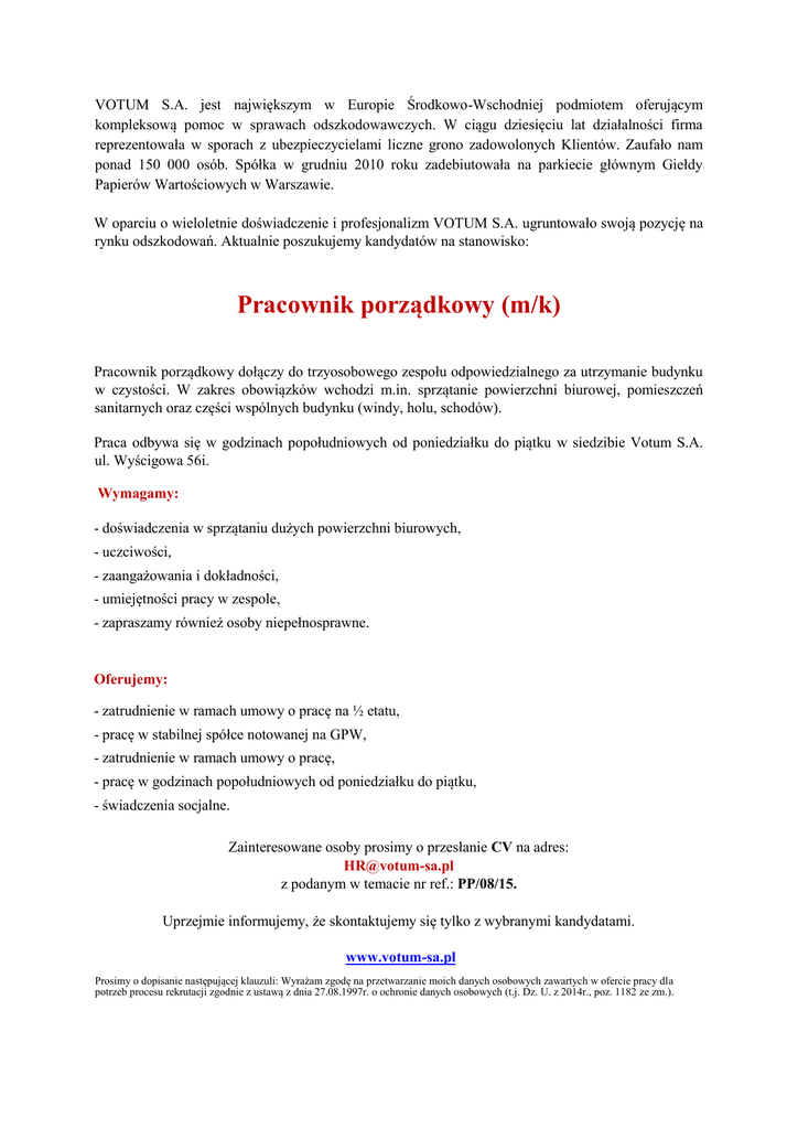 VOTUM S.A. jest największym w Europie Środkowo-Wschodniej podmiotem oferującym kompleksową pomoc w sprawach odszkodowawczych. W ciągu dziesięciu lat działalności firma reprezentowała w sporach z ubezpieczycielami liczne grono zadowolonych Klientów. Zaufało nam ponad 150 000 osób. Spółka w grudniu 2010 roku zadebiutowała na parkiecie głównym Giełdy Papierów Wartościowych w Warszawie. W oparciu o wieloletnie doświadczenie i profesjonalizm VOTUM S.A. ugruntowało swoją pozycję na rynku odszkodowań. Aktualnie poszukujemy kandydatów na stanowisko: Pracownik porządkowy (m/k) Pracownik porządkowy dołączy do trzyosobowego zespołu odpowiedzialnego za utrzymanie budynku w czystości. W zakres obowiązków wchodzi m.in. sprzątanie powierzchni biurowej, pomieszczeń sanitarnych oraz części wspólnych budynku (windy, holu, schodów). Praca odbywa się w godzinach popołudniowych od poniedziałku do piątku w siedzibie Votum S.A. ul. Wyścigowa 56i. Wymagamy: - doświadczenia w sprzątaniu dużych powierzchni biurowych, - uczciwości, - zaangażowania i dokładności, - umiejętności pracy w zespole, - zapraszamy również osoby niepełnosprawne. Oferujemy: - zatrudnienie w ramach umowy o pracę na ½ etatu, - pracę w stabilnej spółce notowanej na GPW, - zatrudnienie w ramach umowy o pracę, - pracę w godzinach popołudniowych od poniedziałku do piątku, - świadczenia socjalne. Zainteresowane osoby prosimy o przesłanie CV na adres: [email protected] z podanym w temacie nr ref.: PP/08/15. Uprzejmie informujemy, że skontaktujemy się tylko z wybranymi kandydatami. www.votum-sa.pl Prosimy o dopisanie następującej klauzuli: Wyrażam zgodę na przetwarzanie moich danych osobowych zawartych w ofercie pracy dla potrzeb procesu rekrutacji zgodnie z ustawą z dnia 27.08.1997r. o ochronie danych osobowych (t.j. Dz. U. z 2014r., poz. 1182 ze zm.).