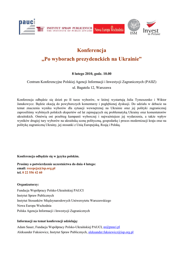 Konferencja „Po wyborach prezydenckich na Ukrainie” 8 lutego 2010, godz. 10.00 Centrum Konferencyjne Polskiej Agencji Informacji i Inwestycji Zagranicznych (PAIIZ) ul. Bagatela 12, Warszawa Konferencja odbędzie się dzień po II turze wyborów, w której wystartują Julia Tymoszenko i Wiktor Janukowycz. Będzie okazją do powyborczych komentarzy i pogłębionej dyskusji. Do udziału w debacie na temat znaczenia wyniku wyborów dla sytuacji wewnętrznej na Ukrainie oraz jej polityki zagranicznej zaprosiliśmy wybitnych polskich ekspertów od lat zajmujących się problematyką Ukrainy oraz komentatorów ukraińskich. Omówią oni przebieg kampanii wyborczej i najwaŜniejsze jej wydarzenia, a takŜe wpływ wyników drugiej tury wyborów na ukraińską scenę polityczną, gospodarkę i proces modernizacji kraju oraz na politykę zagraniczną Ukrainy, jej stosunki z Unią Europejską, Rosją i Polską. Konferencja odbędzie się w języku polskim. Prosimy o potwierdzenie uczestnictwa do dnia 4 lutego: email: [email protected] tel. 0 22 556 42 60 Organizatorzy: Fundacja Współpracy Polsko-Ukraińskiej PAUCI Instytut Spraw Publicznych Instytut Stosunków Międzynarodowych Uniwersytetu Warszawskiego Nowa Europa Wschodnia Polska Agencja Informacji i Inwestycji Zagranicznych Informacji na temat konferencji udzielają: Adam Sauer, Fundacja Współpracy Polsko-Ukraińskiej PAUCI, [email protected] Aleksander Fuksiewicz, Instytut Spraw Publicznych, [email protected] PROGRAM 9.30 – 10. 00 Rejestracja uczestników 10.00 – 10.30 Powitanie Krzysztof Bobiński, Fundacja Współpracy Polsko-Ukraińskiej PAUCI Prof. dr hab. Edward HaliŜak, dyrektor Instytutu Stosunków Międzynarodowych UW dr Jacek Kucharczyk, Instytut Spraw Publicznych. Powitanie + komentarz na temat wyników badań exit-poll i najnowszych danych z Centralnej Komisji Wyborczej 10.30 – 12.00 Panel I – Znaczenie wyniku wyborów dla wewnętrznej sytuacji Ukrainy Długotrwała walka o władzę prezydencką na Ukrainie destabilizująco wpłynęła na sytuację wewnętrzną. Główni kandydaci walczyli ze sobą zaciekle, ale trudno było dostrzec między nimi zasadnicze róŜnice programowe. Jakie znaczenie wynik wyborów będzie miał dla sytuacji wewnątrzpolitycznej na Ukrainie? Czy wpłynie on w sposób znaczący na jej gospodarkę i proces modernizacji państwa? Jakich reform moŜna się spodziewać po nowym prezydencie? Jak zareaguje na nie społeczeństwo? Łukasz Adamski – Polski Instytut Spraw Międzynarodowych Anna Górska – Ośrodek Studiów Wschodnich Marcin Święcicki – UNDP-Ukraina Mykoła Riabczuk (tbc) / Svyatoslav Pavlyuk – Komentarz z Kijowa Moderacja: Małgorzata Nocuń – Nowa Europa Wschodnia 12.00 – 12.15 Przerwa kawowa 12.15 – 13.30 Panel II – Polityka zagraniczna nowego prezydenta – ile zmian, ile kontynuacji? Czy objęcie władzy przez nowego prezydenta będzie oznaczało zmiany w polityce zagranicznej Ukrainy? Jak wpłynie ono na relację z Unią Europejską i Rosją? Jakie będzie znaczenie Ukrainy w polityce regionalnej wobec Mołdowy, Naddniestrza, Białorusi i Gruzji? Jak zachowa się Rosja? Czy UE swą politykę wobec Ukrainy? Jakie znaczenie będą miały kampania wyborcza i wyniki wyborów dla stosunków polsko-ukraińskich? Jan Piekło – Fundacja Współpracy Polsko-Ukraińskiej PAUCI dr Andrzej Szeptycki – Instytut Stosunków Międzynarodowych, Uniwersytet Warszawski Vitaly Portnikov – Radio Swoboda – Komentarz z Kijowa Moderacja: dr Agnieszka Łada – Instytut Spraw Publicznych 13.30 – 13.45 Połączenie z Kijowem Andrzej Brzeziecki – Nowa Europa Wschodnia Komentarz na temat najnowszych wyników wyborów oraz sytuacji w Kijowie. 13.45 Zakończenie konferencji