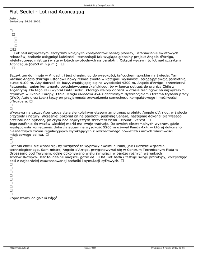 AutoRok.PL / DesignForum.PL Fiat Sedici - Lot nad Aconcaguą Autor: Zmieniony 24.08.2006. Lot nad najwyższymi szczytami kolejnych kontynentów naszej planety, ustanawianie światowych rekordów, badanie osiągnięć ludzkości i technologii tak wygląda globalny projekt Angelo d'Arrigo, wielokrotnego mistrza świata w lotach swobodnych na paralotni. Ostatni wyczyn, to lot nad szczytem Aconcagua (6963 m n.p.m.). Szczyt ten dominuje w Andach, i jest drugim, co do wysokości, łańcuchem górskim na świecie. Tam właśnie Angelo d'Arrigo ustanowił nowy rekord świata w kategorii wysokości, osiągając swoją paralotnią pułap 9100 m. Aby dotrzeć do bazy, znajdującej się na wysokości 4300 m, Angelo d'Arrigo, przemierzył Patagonię, region kontynentu południowoamerykańskiego, by w końcu dotrzeć do granicy Chile z Argentyną. Do tego celu wybrał Fiata Sedici, którego walory docenił w czasie treningów na najwyższym, czynnym wulkanie Europy, Etnie. Dzięki układowi 4x4 z centralnym dyferencjałem i trzema trybami pracy (2WD, Auto oraz Lock) łączy on przyjemność prowadzenia samochodu kompaktowego i możliwości offroadera. Wyprawa na szczyt Aconcagua stała się kolejnym etapem ambitnego projektu Angelo d'Arrigo, w świecie przygody i natury. Wcześniej pokonał on na paralotni pustynię Sahara, następnie dokonał pierwszego przelotu nad Syberią, po czym nad najwyższym szczytem ziemi - Mount Everest. Jego zaufanie do wozów włoskiej marki ma swoje tradycje. Do swoich ekstremalnych wypraw, gdzie występowała konieczność dotarcia autem na wysokość 5200 m używał Pandy 4x4, w której dokonano nieznacznych zmian regulacyjnych wynikających z rozrzedzonego powietrza i innych właściwości miejscowego paliwa. Fiat ani chwili nie wahał się, by wesprzeć te wyprawy swoimi autami, jak i udzielić wsparcia technologicznego. Sam mistrz, Angelo d'Arrigo, przygotowywał się w Centrum Technicznym Fiata w Orbassano pod Turynem, gdzie dokonywano wielu symulacji w bardzo różnych warunkach środowiskowych. Jest to idealne miejsce, gdzie od 30 lat Fiat bada i testuje swoje prototypy, korzystając dziś z najbardziej zaawansowanej techniki i symulacji cyfrowych. Zapraszamy do galerii zdjęć http://mas.auto.pl Kreator PDF Utworzono 4 March, 2017, 05:05
