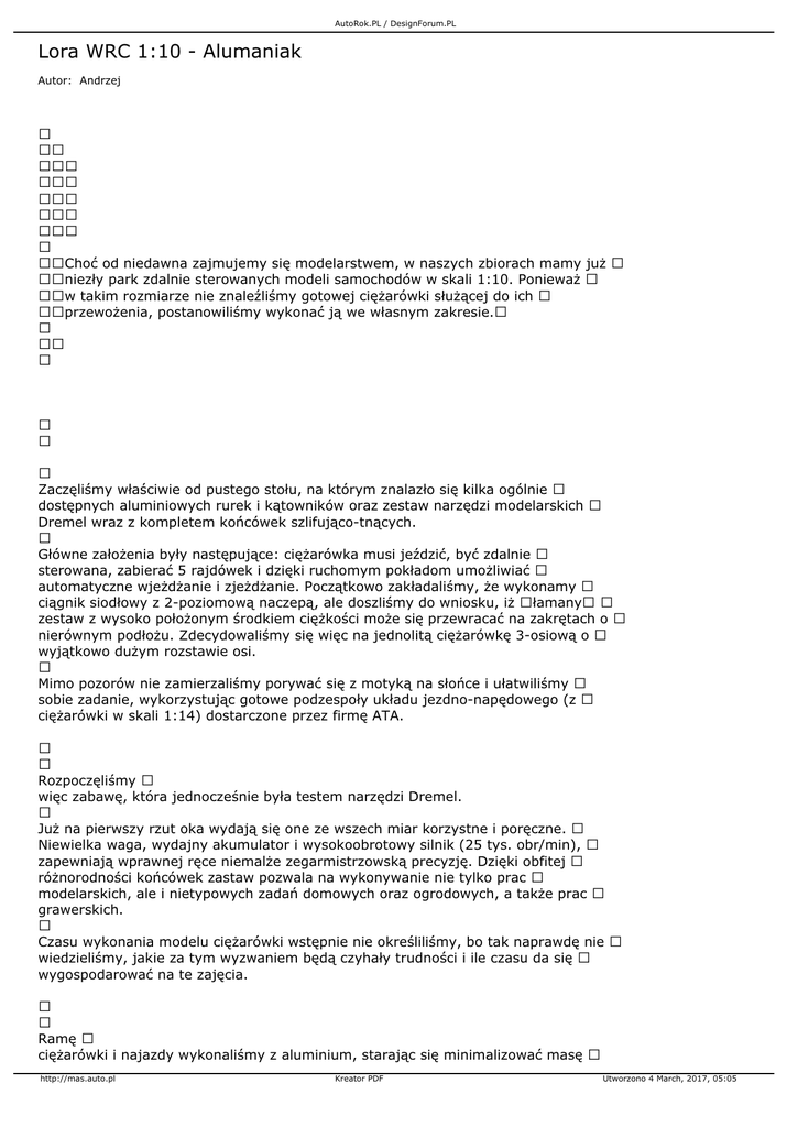AutoRok.PL / DesignForum.PL Lora WRC 1:10 - Alumaniak Autor: Andrzej Choć od niedawna zajmujemy się modelarstwem, w naszych zbiorach mamy już niezły park zdalnie sterowanych modeli samochodów w skali 1:10. Ponieważ w takim rozmiarze nie znaleźliśmy gotowej ciężarówki służącej do ich przewożenia, postanowiliśmy wykonać ją we własnym zakresie. Zaczęliśmy właściwie od pustego stołu, na którym znalazło się kilka ogólnie dostępnych aluminiowych rurek i kątowników oraz zestaw narzędzi modelarskich Dremel wraz z kompletem końcówek szlifująco-tnących. Główne założenia były następujące: ciężarówka musi jeździć, być zdalnie sterowana, zabierać 5 rajdówek i dzięki ruchomym pokładom umożliwiać automatyczne wjeżdżanie i zjeżdżanie. Początkowo zakładaliśmy, że wykonamy ciągnik siodłowy z 2-poziomową naczepą, ale doszliśmy do wniosku, iż łamany zestaw z wysoko położonym środkiem ciężkości może się przewracać na zakrętach o nierównym podłożu. Zdecydowaliśmy się więc na jednolitą ciężarówkę 3-osiową o wyjątkowo dużym rozstawie osi. Mimo pozorów nie zamierzaliśmy porywać się z motyką na słońce i ułatwiliśmy sobie zadanie, wykorzystując gotowe podzespoły układu jezdno-napędowego (z ciężarówki w skali 1:14) dostarczone przez firmę ATA. Rozpoczęliśmy więc zabawę, która jednocześnie była testem narzędzi Dremel. Już na pierwszy rzut oka wydają się one ze wszech miar korzystne i poręczne. Niewielka waga, wydajny akumulator i wysokoobrotowy silnik (25 tys. obr/min), zapewniają wprawnej ręce niemalże zegarmistrzowską precyzję. Dzięki obfitej różnorodności końcówek zastaw pozwala na wykonywanie nie tylko prac modelarskich, ale i nietypowych zadań domowych oraz ogrodowych, a także prac grawerskich. Czasu wykonania modelu ciężarówki wstępnie nie określiliśmy, bo tak naprawdę nie wiedzieliśmy, jakie za tym wyzwaniem będą czyhały trudności i ile czasu da się wygospodarować na te zajęcia. Ramę ciężarówki i najazdy wykonaliśmy z aluminium, starając się minimalizować masę http://mas.auto.pl Kreator PDF Utworzono 4 March, 2017, 05:05 AutoRok.PL / DesignForum.PL całego zestawu i w miarę możliwości uzyskać jak najniżej położony środek ciężkości. Oczywiście nie sprzyjała temu piętrowa zabudowa z trzema w rzędzie ustawionymi samochodami. To one narzuciły długość lory wynoszącą 125 cm. Tak, jak w prawdziwym pojeździe tego typu, dolny pokład wysuwany jest do tyłu, przez co długość całkowita w czasie załadunku lub rozładunku wzrasta do 195 cm. Dolny pokład narzuca pozycję pokładu górnego. Tak więc cały proces składania wymagał zastosowania tylko jednego silniczka. Drugi zblokowany z 3-biegową przekładnią napędza tylne koła. Autentyczność modelu zwiększa wiele dodatków, światła diodowe i moduł dźwiękowy imitujący pracę prawdziwej ciężarówki. Sterowanie autem odbywa się za pomocą 4-kanałowej aparatury. Nasza lora jest nie tylko jedynym takim modelem na świecie, ale po naklejkach widać, że również niezłą wizytówką AutoRoku i firm, które wsparły nasz projekt. A swoją drogą warto podkreślić olbrzymie znaczenie ciężarówek w sporcie rajdowym. To za ich sprawą w każdym nawet najbardziej dziewiczym zakątku świata jest w stanie powstać park serwisowy, w gruncie rzeczy będący małym niezwykle precyzyjnie zorganizowanym miasteczkiem rajdowym, w którym mieszkają i pracują mechanicy, posiłkują się i wypoczywają załogi rajdowe, rozkładane są stacje serwisowe, namioty kierownictwa teamów oraz pojazdy z najnowocześniejszym sprzętem zapewniającym łączność satelitarną z bazami stacjonarnymi i generalnie resztą świata. To te lory zainspirowały nas do stworzenia własnego takiego pojazdu. I nic nie szkodzi, że jest on 10-krotnie mniejszy wszak na tym właśnie polega modelarstwo. Zapraszamy do galerii zdjęć http://mas.auto.pl Kreator PDF Utworzono 4 March, 2017, 05:05