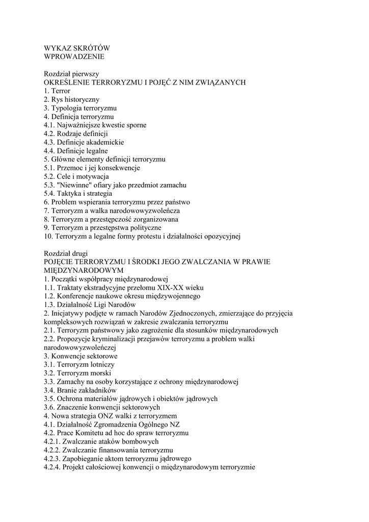 WYKAZ SKRÓTÓW WPROWADZENIE Rozdział pierwszy OKREŚLENIE TERRORYZMU I POJĘĆ Z NIM ZWIĄZANYCH 1. Terror 2. Rys historyczny 3. Typologia terroryzmu 4. Definicja terroryzmu 4.1. NajwaŜniejsze kwestie sporne 4.2. Rodzaje definicji 4.3. Definicje akademickie 4.4. Definicje legalne 5. Główne elementy definicji terroryzmu 5.1. Przemoc i jej konsekwencje 5.2. Cele i motywacja 5.3. "Niewinne" ofiary jako przedmiot zamachu 5.4. Taktyka i strategia 6. Problem wspierania terroryzmu przez państwo 7. Terroryzm a walka narodowowyzwoleńcza 8. Terroryzm a przestępczość zorganizowana 9. Terroryzm a przestępstwa polityczne 10. Terroryzm a legalne formy protestu i działalności opozycyjnej Rozdział drugi POJĘCIE TERRORYZMU I ŚRODKI JEGO ZWALCZANIA W PRAWIE MIĘDZYNARODOWYM 1. Początki współpracy międzynarodowej 1.1. Traktaty ekstradycyjne przełomu XIX-XX wieku 1.2. Konferencje naukowe okresu międzywojennego 1.3. Działalność Ligi Narodów 2. Inicjatywy podjęte w ramach Narodów Zjednoczonych, zmierzające do przyjęcia kompleksowych rozwiązań w zakresie zwalczania terroryzmu 2.1. Terroryzm państwowy jako zagroŜenie dla stosunków międzynarodowych 2.2. Propozycje kryminalizacji przejawów terroryzmu a problem walki narodowowyzwoleńczej 3. Konwencje sektorowe 3.1. Terroryzm lotniczy 3.2. Terroryzm morski 3.3. Zamachy na osoby korzystające z ochrony międzynarodowej 3.4. Branie zakładników 3.5. Ochrona materiałów jądrowych i obiektów jądrowych 3.6. Znaczenie konwencji sektorowych 4. Nowa strategia ONZ walki z terroryzmem 4.1. Działalność Zgromadzenia Ogólnego NZ 4.2. Prace Komitetu ad hoc do spraw terroryzmu 4.2.1. Zwalczanie ataków bombowych 4.2.2. Zwalczanie finansowania terroryzmu 4.2.3. Zapobieganie aktom terroryzmu jądrowego 4.2.4. Projekt całościowej konwencji o międzynarodowym terroryzmie 4.3. Rola Rady Bezpieczeństwa NZ 5. Problem jurysdykcji Międzynarodowego Trybunału Karnego 5.1. Kwestia terroryzmu w trakcie prac nad Statutem MTK 5.2. Akty terroryzmu jako zbrodnie przeciwko ludzkości 6. Kształtowanie się kategorii terroryzmu per se jako zbrodni w ramach zwyczajowego prawa międzynarodowego Rozdział trzeci ŚRODKI PRZECIWDZIAŁANIA TERRORYZMOWI PRZYJĘTE W RAMACH RADY EUROPY I UNII EUROPEJSKIEJ 1. Współpraca międzynarodowa w ramach organizacji regionalnych 2. Regulacje Rady Europy 2.1. Kształtowanie się modelu współpracy opartego na zobowiązaniu do ekstradycji sprawcy przestępstwa terrorystycznego 2.2. Standardy praw człowieka jako wyznaczniki ograniczeń walki z terroryzmem 2.3. Budowanie kompleksowej strategii zwalczania oraz zapobiegania przestępstwom terrorystycznym 3. Stanowisko Unii Europejskiej wobec terroryzmu 3.1. Kształtowanie się instytucjonalnych i normatywnych podstaw zwalczania terroryzmu 3.2. Strategia przeciwdziałania terroryzmowi w Unii Europejskiej 4. Środki zwalczania terroryzmu przyjęte w decyzji ramowej Rady z 13 czerwca 2002 r 4.1. Pojęcie przestępstwa terrorystycznego 4.2. Przestępstwa dotyczące grupy terrorystycznej oraz przestępstwa związane z terroryzmem 4.3. Prawnokarne konsekwencje popełnienia przestępstw określonych w decyzji ramowej z 13 czerwca 2002 r 4.4. Implementacja przepisów decyzji ramowej z 13 czerwca 2002 r. w ustawodawstwach krajowych Rozdział czwarty PRZESTĘPSTWO O CHARAKTERZE TERRORYSTYCZNYM W POLSKIM PRAWIE KARNYM 1. Terroryzm oraz jego przejawy na tle polskich kodyfikacji karnych XX wieku i poglądów nauki tego okresu 2. Realizacja zobowiązań wynikających z prawa Unii Europejskiej w polskim prawie karnym 3. Ustawowe znamiona przestępstwa o charakterze terrorystycznym 3.1. Katalog czynów zabronionych spełniających przesłanki kwalifikacji jako przestępstwa o charakterze terrorystycznym 3.2. Strona podmiotowa przestępstwa o charakterze terrorystycznym 4. Definicja przestępstwa o charakterze terrorystycznym a wewnętrzna spójność polskiego prawa karnego i harmonizacja rozwiązań w państwach Unii Europejskiej Rozdział piąty ŚRODKI ZWALCZANIA I ZAPOBIEGANIA PRZESTĘPSTWOM O CHARAKTERZE TERRORYSTYCZNYM 1. Prawnokarne konsekwencje popełnienia przestępstwa o charakterze terrorystycznym 1.1. Nadzwyczajne obostrzenie kary 1.2. Dopuszczalność stosowania środków probacyjnych 1.3. Czynny Ŝal i mały świadek koronny 1.4. Zakres stosowania polskiej ustawy karnej 1.5. Odpowiedzialność podmiotów zbiorowych 2. Kryminalizacja czynów "na przedpolu" przestępstwa o charakterze terrorystycznym 2.1. Prawnokarne środki zapobiegania przestępstwom o charakterze terrorystycznym 2.2. Udział w zorganizowanej grupie lub związku przestępnym o charakterze terrorystycznym 2.3. Kryminalizacja finansowania terroryzmu 2.4. Przestępstwa związane z działalnością terrorystyczną 3. Okoliczności wyłączające odpowiedzialność karną 3.1. Okoliczności uchylające bezprawność lub winę jako środki przeciwdziałania terroryzmowi 3.2. Kwestia dopuszczalności zniszczenia cywilnego statku powietrznego uŜytego jako środek ataku terrorystycznego 3.3. Problem legalizacji tortur jako metody przesłuchania w celu zapobieŜenia groźbie zamachu terrorystycznego ZAKOŃCZENIE BIBLIOGRAFIA