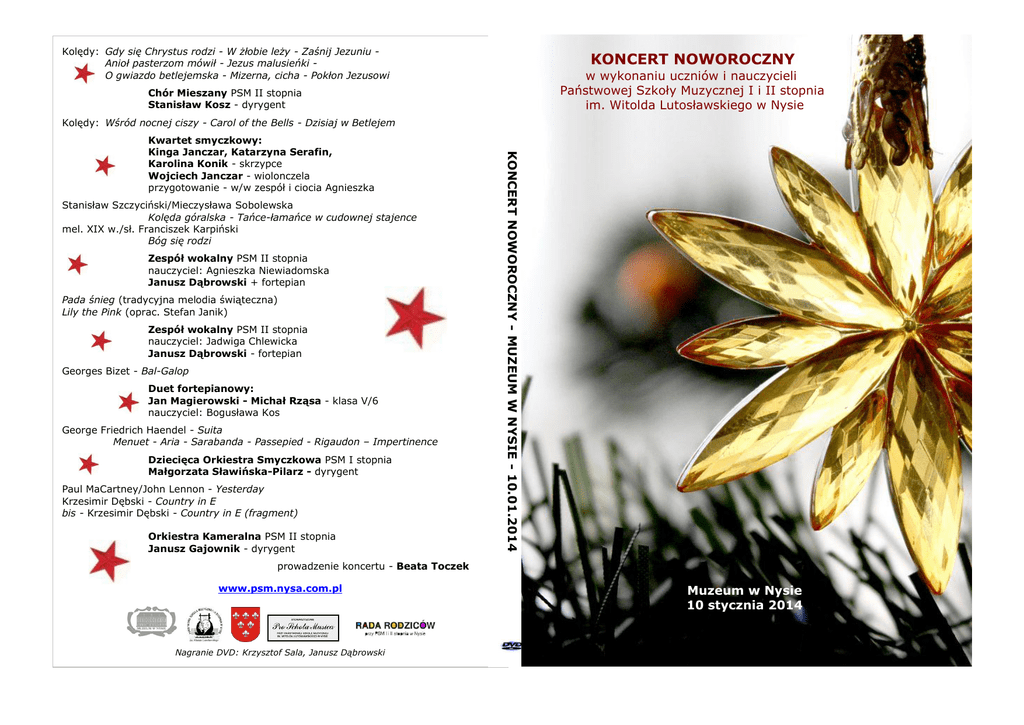 Kolędy: Gdy się Chrystus rodzi - W żłobie leży - Zaśnij Jezuniu Anioł pasterzom mówił - Jezus malusieńki O gwiazdo betlejemska - Mizerna, cicha - Pokłon Jezusowi KONCERT NOWOROCZNY w wykonaniu uczniów i nauczycieli Państwowej Szkoły Muzycznej I i II stopnia im. Witolda Lutosławskiego w Nysie Chór Mieszany PSM II stopnia Stanisław Kosz - dyrygent Kolędy: Wśród nocnej ciszy - Carol of the Bells - Dzisiaj w Betlejem Stanisław Szczyciński/Mieczysława Sobolewska Kolęda góralska - Tańce-łamańce w cudownej stajence mel. XIX w./sł. Franciszek Karpiński Bóg się rodzi Zespół wokalny PSM II stopnia nauczyciel: Agnieszka Niewiadomska Janusz Dąbrowski + fortepian Pada śnieg (tradycyjna melodia świąteczna) Lily the Pink (oprac. Stefan Janik) Zespół wokalny PSM II stopnia nauczyciel: Jadwiga Chlewicka Janusz Dąbrowski - fortepian Georges Bizet - Bal-Galop Duet fortepianowy: Jan Magierowski - Michał Rząsa - klasa V/6 nauczyciel: Bogusława Kos George Friedrich Haendel - Suita Menuet - Aria - Sarabanda - Passepied - Rigaudon – Impertinence Dziecięca Orkiestra Smyczkowa PSM I stopnia Małgorzata Sławińska-Pilarz - dyrygent Paul MaCartney/John Lennon - Yesterday Krzesimir Dębski - Country in E bis - Krzesimir Dębski - Country in E (fragment) Orkiestra Kameralna PSM II stopnia Janusz Gajownik - dyrygent KONCERT NOWOROCZNY - MUZEUM W NYSIE - 10.01.2014 Kwartet smyczkowy: Kinga Janczar, Katarzyna Serafin, Karolina Konik - skrzypce Wojciech Janczar - wiolonczela przygotowanie - w/w zespół i ciocia Agnieszka prowadzenie koncertu - Beata Toczek www.psm.nysa.com.pl Nagranie DVD: Krzysztof Sala, Janusz Dąbrowski Muzeum w Nysie 10 stycznia 2014