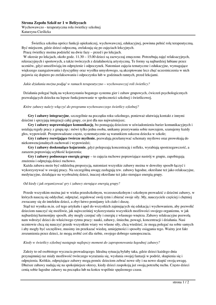 Strona Zepołu Szkół nr 1 w Bełżycach Wychowawczo - terapeutyczna rola świetlicy szkolnej Katarzyna Cieślicka Świetlica szkolna oprócz funkcji opiekuńczej, wychowawczej, edukacyjnej, powinna pełnić rolę terapeutyczną. Być miejscem, gdzie dzieci odpoczną, zrelaksują się po zajęciach lekcyjnych. Pracę świetlicy można podzielić na dwie fazy – przed i po lekcjach. W okresie po lekcjach, około godz. 11.30 – 15.00 dzieci są zazwyczaj zmęczone. Potrzebują zajęć relaksacyjnych, rekreacyjnych i sportowych, a także twórczych z działalnością artystyczną. Te formy są najbardziej lubiane przez uczniów, gdyż umożliwiają im odprężenie i odpoczynek. Natomiast zajęcia tematyczne i edukacyjne, wymagające większego zaangażowania i dyscypliny oraz wysiłku umysłowego, są akceptowane lecz chęć uczestniczenia w nich pojawia się dopiero po zrelaksowaniu i odpoczynku lub w godzinach rannych, przed lekcjami. Jakie działania można podjąć w ramach terapeutyczno – wychowawczej roli świetlicy? Działania polegać będą na wykorzystaniu bogatego systemu gier i zabaw grupowych, ćwiczeń psychologicznych pozwalających dziecku na lepsze funkcjonowanie w społeczności szkolnej i świetlicowej. Które zabawy należy włączyć do programu wychowawczego świetlicy szkolnej? Gry i zabawy integracyjne, szczególnie na początku roku szkolnego, ponieważ ułatwiają kontakt z innymi dziećmi i sprzyjają integracji całej grupy, co jest dla nas najważniejsze; Gry i zabawy usprawniające komunikację, bo pomagają dzieciom w uświadomieniu barier komunikacyjnych i ustalają reguły pracy z grupą np.: mówi tylko jedna osoba, unikamy przerywania sobie nawzajem, szanujemy każdy głos, wypowiedź. Przeprowadzane często, systematycznie są warunkiem sukcesu dziecka w szkole; Gry i zabawy rozwijające twórcze myślenie, pozwalają przełamywać schematy myślowe oraz prowokują do niekonwencjonalnych zachowań i wypowiedzi; Gry i zabawy doskonalące kojarzenie, gdyż polepszają koncentrację i refleks, wyrabiają spostrzegawczość, a zarazem poprawiają szybkość kojarzenia; Gry i zabawy podnoszące energię grupy – to zajęcia ruchowe poprawiające nastrój w grupie, zapobiegają znużeniu i odprężają dzieci ruchowo. Każda zabawa może być oddzielną propozycją, natomiast wszystkie zabawy można w dowolny sposób łączyć i wykorzystywać w swojej pracy. Na szczególną uwagę zasługują tzw. zabawy łagodne, określane też jako relaksacyjne, medytacyjne, działające na wyobraźnię dzieci, inaczej określane też jako sterujące energią grupy. Od kiedy i jak organizować gry i zabawy sterujące energią grupy? Przede wszystkim można już w wieku przedszkolnym, wczesnoszkolnym i szkolnym prowadzić z dziećmi zabawy, w których nauczą się oddychać, odprężać, regulować swój rytm i zbierać swoje siły. My, nauczyciele częściej i chętniej zwracamy się do intelektu dzieci, a zbyt łatwo pomijamy ich ciało i duszę. Stąd też wynika m.in. cel tego artykułu i apel do wszystkich zajmujących się edukacją i wychowaniem, aby pozwolić dzieciom nauczyć się możliwie, jak najwcześniej wykorzystania wszystkich możliwości swojego organizmu, w jak najbardziej harmonijny sposób, aby mogły czerpać siły i energię z własnego wnętrza. Zabawy relaksacyjne pozwolą nam wdrożyć dzieci do właściwego rytmu pracy: nauki, zabawy, śmiechu, powagi, koncentracji i działania. Nasi uczniowie chcą się nauczyć przede wszystkim wiary we własne siły, chcą wiedzieć, że mogą polegać na sobie samych i aby mogły być szczęśliwe, musimy im przekazać wiedzę, umiejętności i sposoby osiągania tego. Ważny jest fakt zrozumienia przez dzieci, że mogą zrobić coś dla siebie, swojego dobrego samopoczucia. Kiedy w świetlicy szkolnej następuje najlepszy moment do zaproponowania łagodnej zabawy? Zależy to od osobistego wyczucia prowadzącego. Idealną sytuacją byłaby taka, gdzie dzieci każdego dnia przynajmniej raz miały możliwość twórczego wyrażania się, wysłania swojej fantazji w podróż, skupienia się i odprężenia. Krótkie, odprężające zabawy mogą pomóc dzieciom zebrać nowe siły i na nowo skupić swoją uwagę. Dłuższe zabawy nadają się na spokojniejsze okresy, kiedy dzieci zaspokoją już swoją potrzebę ruchu. Często dzieci cenią sobie łagodne zabawy na początku lub na końcu wspólnie spędzonego czasu. strona 1 / 2 Strona Zepołu Szkół nr 1 w Bełżycach Wychowawczo - terapeutyczna rola świetlicy szkolnej Katarzyna Cieślicka Osoba prowadzącego jest najważniejsza, musi być on czarodziejem, który wprowadzi dzieci w tajemniczy świat fantazji i wyobraźni. Powinien mówić wolno, łagodnie, spokojnie i cicho. Zabawom powinna towarzyszyć łagodna, piękna muzyka. Dzieciom przed każdą zabawą należy się wprowadzenie i wytworzenie nastroju, klimatu oraz dokładna instrukcja. Musimy im uświadomić, jak ważne jest właściwe oddychanie, bowiem wykonując wdech dostarczamy tlenu, który przepływając przez nasze ciało dostarcza nam zdrowia. Przy wydechu pozbywamy się „zanieczyszczeń” wydychając dwutlenek węgla i wyobrażone przez nas zmartwienia, problemy, złe myśli zostają oddalane. Najważniejszy więc jest właściwy wydech. Im dokładniej opróżniamy nasze płuca, tym intensywniejszy będzie następny wdech. Oddychamy zawsze nosem, wydychamy powietrze ustami. Przy treningu oddechowym zamykamy oczy. Siedząc ręce kładziemy na kolanach i rozluźniamy wszystkie mięśnie od głowy do stóp, nie myślimy, oddychamy spokojnie, miarowo, rytmicznie. Każdy cykl oddechowy składa się z trzech części: wdechu, przerwy oddechowej i wydechu. Dokładnego rytmu nie da się ustalić, ale można zaproponować rytm: 4-2-4-2: w czasie wdechu policzmy do czterech, w czasie przerwy do dwóch, w czasie wydechu ponownie do czterech itp. Ucząc dzieci właściwego oddychania możemy propono