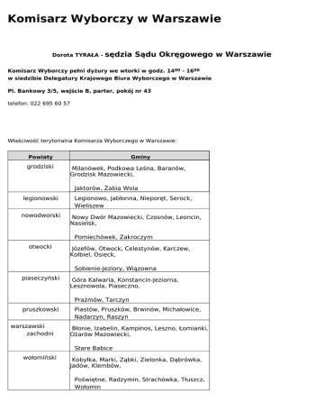 Komisarz Wyborczy w Warszawie Dorota TYRAŁA - sędzia Sądu Okręgowego w Warszawie Komisarz Wyborczy pełni dyżury we wtorki w godz. 1400 - 1600 w siedzibie Delegatury Krajowego Biura Wyborczego w Warszawie Pl. Bankowy 3/5, wejście B, parter, pokój nr 43 telefon: 022 695 60 57 Właściwość terytorialna Komisarza Wyborczego w Warszawie: Gminy Powiaty grodziski Milanówek, Podkowa Leśna, Baranów, Grodzisk Mazowiecki, Jaktorów, Żabia Wola legionowski nowodworski Legionowo, Jabłonna, Nieporęt, Serock, Wieliszew Nowy Dwór Mazowiecki, Czosnów, Leoncin, Nasielsk, Pomiechówek, Zakroczym otwocki Józefów, Otwock, Celestynów, Karczew, Kołbiel, Osieck, Sobienie-Jeziory, Wiązowna piaseczyński Góra Kalwaria, Konstancin-Jeziorna, Lesznowola, Piaseczno, Prażmów, Tarczyn pruszkowski warszawski zachodni Piastów, Pruszków, Brwinów, Michałowice, Nadarzyn, Raszyn Błonie, Izabelin, Kampinos, Leszno, Łomianki, Ożarów Mazowiecki, Stare Babice wołomiński Kobyłka, Marki, Ząbki, Zielonka, Dąbrówka, Jadów, Klembów, Poświętne, Radzymin, Strachówka, Tłuszcz, Wołomin m. st. Warszawa Dzielnice Bemowo, Białołęka, Bielany, Mokotów, Ochota, Praga Południe, Praga Północ, Rembertów, Śródmieście, Targówek, Ursus, Ursynów, Wawer, Wesoła, Wilanów, Włochy, Wola, Żoliborz Komisarz Wyborczy w Warszawie wykonuje czynnościo charakterze ogólnowojewódzkim.