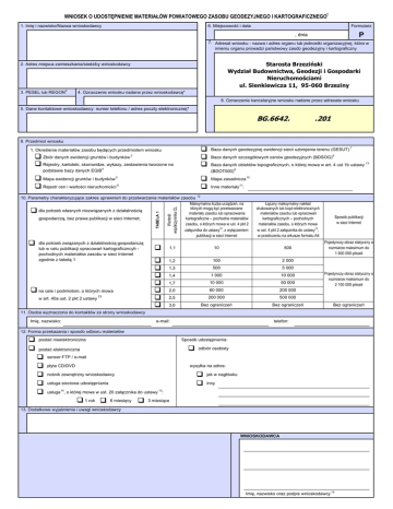 WNIOSEK O UDOSTĘPNIENIE MATERIAŁÓW POWIATOWEGO ZASOBU GEODEZYJNEGO I KARTOGRAFICZNEGO1 1. Imię i nazwisko/Nazwa wnioskodawcy 6. Miejscowość i data Formularz P , dnia 7. Adresat wniosku - nazwa i adres organu lub jednostki organizacyjnej, która w imieniu organu prowadzi państwowy zasób geodezyjny i kartograficzny Starosta Brzeziński Wydział Budownictwa, Geodezji i Gospodarki Nieruchomościami ul. Sienkiewicza 11, 95-060 Brzeziny 2. Adres miejsca zamieszkania/siedziby wnioskodawcy 3. PESEL lub REGON2 4. Oznaczenie wniosku nadane przez wnioskodawcę* 8. Oznaczenie kancelaryjne wniosku nadane przez adresata wniosku 5. Dane kontaktowe wnioskodawcy: numer telefonu / adres poczty elektronicznej* BG.6642. .201 9. Przedmiot wniosku Baza danych geodezyjnej ewidencji siecii uzbrojenia terenu (GESUT) 7 Zbiór danych ewidencji gruntów i budynków Rejestry, kartoteki, skorowidze, wykazy, zestawienia tworzone na Mapa ewidencji gruntów i budynków Rejestr cen i wartości nieruchomości Mapa zasadnicza 10 1. Określenie materiałów zasobu będących przedmiotem wniosku 3 podstawie bazy danych EGiB4 5 6 Baza danych szczegółowych osnów geodezyjnych (BDSOG)8 Baza danych obiektów topograficznych, o której mowa w art. 4 ust 1b ustawy 13 (BDOT500)9 Inne materiały 11: dla potrzeb związanych z działalnością gospodarczą lub w celu publikacji opracowań kartograficzncyh pochodnych materiałów zasobu w sieci Internet zgodnie z tabelą 1 na cele i podmiotom, o których mowa w art. 40a ust. 2 pkt 2 ustawy 13 Sposób publikacji w sieci Internet 500 Pojedynczy obraz statyczny o rozmiarze maksimum do 1 000 000 pikseli Wartość współczynnika CL Łączny maksymalny nakład drukowanych lub kopii elektronicznych materiałów zasobu lub opracowań kartograficznych – pochodnych materiałów zasobu, o których mowa w ust. 4 pkt 2 załącznika do ustawy13, w przeliczeniu na arkusze formatu A4 TABELA 1 10. Parametry charakteryzujące zakres uprawnień do przetwarzania materiałów zasobu 12 Maksymalna liczba urządzeń, na których mogą być przetwarzane dla potrzeb własnych niezwiązanych z działalnością materiały zasobu lub opracowania kartograficzne – pochodne materiałów gospodarczą, bez prawa publikacji w sieci Internet; zasobu, o których mowa w ust. 4 pkt 2 załącznika do ustawy13, z wyłączeniem publikacji w sieci Internet 1,1 10 1,2 100 2 000 1,3 500 5 000 1,4 1 000 10 000 1,7 10 000 50 000 2,0 60 000 200 000 2,5 200 000 500 000 3,0 Bez ograniczeń Bez ograniczeń Pojedynczy obraz statyczny o rozmiarze maksimum do 2 100 000 pikseli Bez ograniczeń 11. Osoba wyznaczona do kontaktów ze strony wnioskodawcy Imię, nazwisko: e-mail: telefon: 12. Forma przekazania i sposób odbioru materiałów postać nieelektroniczna Sposób udostępnienia: postać elektroniczna odbiór osobisty serwer FTP / e-mail płyta CD/DVD wysyłka na adres: nośnik zewnętrzny wnioskodawcy usługa sieciowa udostępniania jak w nagłówku inny usługa 14, o której mowa w ust. 20 załącznika do ustawy 13: 1 rok 6 miesięcy 3 miesiące 13. Dodatkowe wyjaśnienia i uwagi wnioskodawcy WNIOSKODAWCA Imię, nazwisko oraz podpis wnioskodawcy 15 Przypisy: 1. 2. 3. 4. 5. 6. 7. 8. 9. 10. 11. 12. 13. Informacje o aktualnie dostępnych materiałach powiatowego zasobu geodezyjnego i kartograficznego udostępnia organ prowadzący ten zasób. W przypadku nieposiadania nr PESEL, rodzaj i nr dokumentu stwierdzajacego tożsamość. Uszczegółowienie wniosku o udostępnienie zbioru danych EGiB zawiera formularz P1. Uszczegółowienie wniosku o udostępnienie rejestrów, kartotek, skorowidzów, wykazów, zestawień tworzonych na podstawie bazy danych EGiB zawiera formularz P2. Uszczegółowienie wniosku o udostępnienie mapy ewidencji gruntów i budynków zawiera formularz P3. Uszczegółowienie wniosku o udostępnienie rejestru cen i wartości nieruchomości zawiera formularz P4. Uszczegółowienie wniosku o udostępnienie zbiorów danych GESUT zawiera formularz P5. Uszczegółowienie wniosku o zbiorów danych BDSOG zawiera formularz P6. Uszczegółowienie wniosku o udostępnienie zbiorów danych bazy danych BDOT500 zawiera formularz P7. Uszczegółowienie wniosku o udostępnienie mapy zasadniczej zawiera formularz P3. Uszczegółowienie wniosku o o udostępnienie innych materiałów zawiera formularz P8. Dopuszczalne jest wskazanie tylko jednego celu. Ustawa z dnia 17 maja 1989r. - Prawo geodezyjne i kartograficzne (Dz. U. z 2010 r., Nr 193, poz. 1287, z późn. zm.). 14. Udostępnienie w formie okresowej usługi sieciowej ma zastosowanie w przypadku udostepniania ortofotomapy lub opracowań kartograficznych, tworzonych na podstawie odpowiednich baz danych, o których mowa w art. 4 ust. 1a pkt 1-3, 7, 8, 10, 11 lub ust. 1b ustawy - Prawo geodezyjne i kartograficzne.. 15. Podpis odręczny, podpis elektroniczny, o którym mowa w art. 3 pkt 1 ustawy z dnia 18 września 2001 r. o podpisie elektronicznym, bezpieczny podpis elektroniczny, o którym mowa w art. 3 pkt 2 ustawy z dnia 18 września 2001 r. o podpisie elektronicznym, podpis potwierdzony profilem zaufanym ePUAP, o którym mowa w art. 3 pkt 15 ustawy z dnia 17 lutego 2005 r. o informatyzacji działalności podmiotów realizujących zadania publiczne lub w przypadku składania wniosku za pomocą systemu teleinformatycznego, o którym mowa w przepisach wydanych na podstawie art. 40 ust. 8 ustawy - Prawo geodezyjne i kartograficzne, identyfikator umożliwiający weryfikację wnioskodawcy w tym systemie. * Informacja nieobowiązkowa Wyjaśnienia: 1. Formularze drukowane nie muszą uwzględniać oznaczeń kolorystycznych. Formularz 1. Uszczegółowienie wniosku o udostępnienie innych materiałów Drukowana mapa topograficzna w skali: Drukowana mapa ogólnogeograficzna w skali: 1:10 000 1:25 000 P8 1:50 000 1:100 000 1:250 000 1:500 000 ploterowy wydruk kolorowy ploterowy wydruk czarno-biały druk poligraficzny PL-1942 1965. PL-1992 PL-2000 1:1 000 000 Inne mapy sytuacyjne l