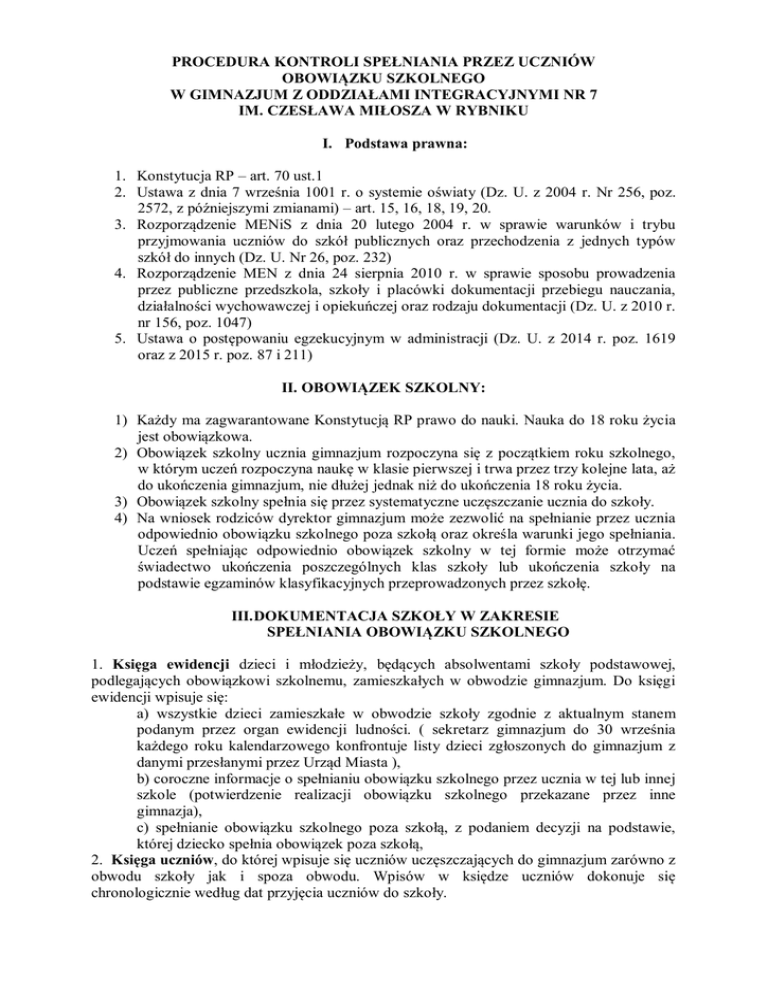 PROCEDURA KONTROLI SPEŁNIANIA PRZEZ UCZNIÓW OBOWIĄZKU SZKOLNEGO W GIMNAZJUM Z ODDZIAŁAMI INTEGRACYJNYMI NR 7 IM. CZESŁAWA MIŁOSZA W RYBNIKU I. Podstawa prawna: 1. Konstytucja RP – art. 70 ust.1 2. Ustawa z dnia 7 września 1001 r. o systemie oświaty (Dz. U. z 2004 r. Nr 256, poz. 2572, z późniejszymi zmianami) – art. 15, 16, 18, 19, 20. 3. Rozporządzenie MENiS z dnia 20 lutego 2004 r. w sprawie warunków i trybu przyjmowania uczniów do szkół publicznych oraz przechodzenia z jednych typów szkół do innych (Dz. U. Nr 26, poz. 232) 4. Rozporządzenie MEN z dnia 24 sierpnia 2010 r. w sprawie sposobu prowadzenia przez publiczne przedszkola, szkoły i placówki dokumentacji przebiegu nauczania, działalności wychowawczej i opiekuńczej oraz rodzaju dokumentacji (Dz. U. z 2010 r. nr 156, poz. 1047) 5. Ustawa o postępowaniu egzekucyjnym w administracji (Dz. U. z 2014 r. poz. 1619 oraz z 2015 r. poz. 87 i 211) II. OBOWIĄZEK SZKOLNY: 1) Każdy ma zagwarantowane Konstytucją RP prawo do nauki. Nauka do 18 roku życia jest obowiązkowa. 2) Obowiązek szkolny ucznia gimnazjum rozpoczyna się z początkiem roku szkolnego, w którym uczeń rozpoczyna naukę w klasie pierwszej i trwa przez trzy kolejne lata, aż do ukończenia gimnazjum, nie dłużej jednak niż do ukończenia 18 roku życia. 3) Obowiązek szkolny spełnia się przez systematyczne uczęszczanie ucznia do szkoły. 4) Na wniosek rodziców dyrektor gimnazjum może zezwolić na spełnianie przez ucznia odpowiednio obowiązku szkolnego poza szkołą oraz określa warunki jego spełniania. Uczeń spełniając odpowiednio obowiązek szkolny w tej formie może otrzymać świadectwo ukończenia poszczególnych klas szkoły lub ukończenia szkoły na podstawie egzaminów klasyfikacyjnych przeprowadzonych przez szkołę. III. DOKUMENTACJA SZKOŁY W ZAKRESIE SPEŁNIANIA OBOWIĄZKU SZKOLNEGO 1. Księga ewidencji dzieci i młodzieży, będących absolwentami szkoły podstawowej, podlegających obowiązkowi szkolnemu, zamieszkałych w obwodzie gimnazjum. Do księgi ewidencji wpisuje się: a) wszystkie dzieci zamieszkałe w obwodzie szkoły zgodnie z aktualnym stanem podanym przez organ ewidencji ludności. ( sekretarz gimnazjum do 30 września każdego roku kalendarzowego konfrontuje listy dzieci zgłoszonych do gimnazjum z danymi przesłanymi przez Urząd Miasta ), b) coroczne informacje o spełnianiu obowiązku szkolnego przez ucznia w tej lub innej szkole (potwierdzenie realizacji obowiązku szkolnego przekazane przez inne gimnazja), c) spełnianie obowiązku szkolnego poza szkołą, z podaniem decyzji na podstawie, której dziecko spełnia obowiązek poza szkołą, 2. Księga uczniów, do której wpisuje się uczniów uczęszczających do gimnazjum zarówno z obwodu szkoły jak i spoza obwodu. Wpisów w księdze uczniów dokonuje się chronologicznie według dat przyjęcia uczniów do szkoły. 3. Dziennik lekcyjny, w którym odnotowuje się obecności uczniów na zajęciach edukacyjnych. IV. OSOBY UPRAWNIONE DO KONTROLI REALIZACJI OBOWIĄZKU SZKOLNEGO: 1) 2) 3) 4) 5) 6) dyrektor, wychowawca klasy, zastępca dyrektora, pedagog szkolny, nauczyciele prowadzący dane zajęcia edukacyjne, sekretarz szkoły. V. DZIAŁANIA GIMNAZJUM 1. Działania rodziców dziecka podlegającego obowiązkowi szkolnemu: 1. dopełnienie czynności związanych ze zgłoszeniem dziecka do szkoły, w obwodzie, której uczeń mieszka, 2. poinformowanie gimnazjum rejonowego o zapisaniu dziecka do innego gimnazjum, 3. zapewnienie regularnego uczęszczania dziecka na zajęcia szkolne, 4. zapewnienia dziecku warunków umożliwiających przygotowywanie się do zajęć, 5. usprawiedliwianie nieobecności dziecka w szkole według następujących zasad: a. rodzice/opiekunowie prawni mają możliwość usprawiedliwienia nieobecności ucznia na zajęciach w ciągu dwóch tygodni od jego powrotu do szkoły poprzez: - odnotowanie w zeszycie korespondencji, który następnie uczeń przekazuje wychowawcy na godzinie wychowawczej; wychowawca podpisuje usprawiedliwienie z zaznaczeniem daty zgłoszenia, - odnotowanie w dzienniku elektronicznym „Librus” a wysłane z konta rodzica - osobistą rozmowę z wychowawcą klasy w czasie konsultacji i zebrań, (wychowawca odnotowuje to w dzienniku elektronicznym w zakładce „kontakty z rodzicami” ) b. usprawiedliwienie powinno zawierać dokładne daty nieobecności, c. wychowawca nie ma obowiązku usprawiedliwiania nieobecności ucznia po upływie 14 dni od jego powrotu do szkoły, po tym terminie nieobecności są uznawane za nieusprawiedliwione) 6. Przy zwolnienie ucznia z lekcji lub kilku lekcji w danym dniu wymagane jest pisemne usprawiedliwienie w zeszycie korespondencji lub informacja w dzienniku elektronicznym wysłana z konta rodzica z podaniem terminu i powodu. Przed opuszczeniem szkoły uczeń powinien uzyskać akceptację wychowawcy (podczas jego nieobecności – nauczyciela danego przedmiotu, pedagoga lub dyrektora). 7. Zdecydowana i odpowiedzialna reakcja na informację przekazaną przez szkołę a dotyczącą nieobecności ucznia czy zagrożenia wagarami oraz skutków nieusprawiedliwienia nieobecności. 8. Współpraca z wychowawcą, pedagogiem, dyrektorem w sytuacji nieusprawiedliwionych nieobecności czy zagrożenia dziecka wagarami. 2. Działania nauczycieli: 1. systematyczne, na każdej jednostce lekcyjnej sprawdzanie obecności uczniów i dokumentowanie w dzienniku lekcyjnym, 2. zgłaszanie wychowawcy klasy wszystkich prób unikania przez ucznia zajęć lekcyjnych (w przypadku stwierdzenia 3 kolejnych nieusprawiedliwionych nieobecności ucznia na zajęciach z danego przedmiotu nauczyciel ma obowiązek powiadomić o tym wychowawcę), 3. zwrócenie uwagi na powtarzające się spóźnienia na lekcję, 4. możliwość udziału nauczyciela w spotkaniach wychowawców z rodzicami 3. Działania wychowawców klas: 1. zapoznanie rodziców z procedurą kontroli i realizowania obowiązku szkolnego (na pierwszym zebra