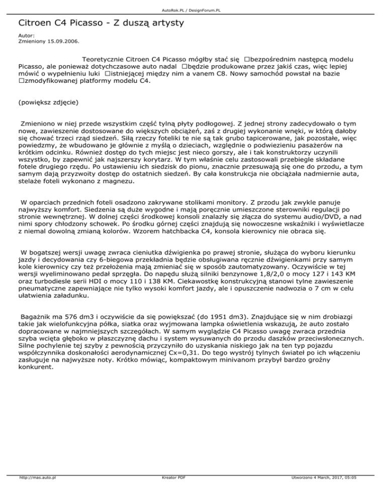 AutoRok.PL / DesignForum.PL Citroen C4 Picasso - Z duszą artysty Autor: Zmieniony 15.09.2006. Teoretycznie Citroen C4 Picasso mógłby stać się bezpośrednim następcą modelu Picasso, ale ponieważ dotychczasowe auto nadal będzie produkowane przez jakiś czas, więc lepiej mówić o wypełnieniu luki istniejącej między nim a vanem C8. Nowy samochód powstał na bazie zmodyfikowanej platformy modelu C4. (powiększ zdjęcie) Zmieniono w niej przede wszystkim część tylną płyty podłogowej. Z jednej strony zadecydowało o tym nowe, zawieszenie dostosowane do większych obciążeń, zaś z drugiej wykonanie wnęki, w którą dałoby się chować trzeci rząd siedzeń. Siłą rzeczy foteliki te nie są tak grubo tapicerowane, jak pozostałe, więc powiedzmy, że wbudowano je głównie z myślą o dzieciach, względnie o podwiezieniu pasażerów na krótkim odcinku. Również dostęp do tych miejsc jest nieco gorszy, ale i tak konstruktorzy uczynili wszystko, by zapewnić jak najszerszy korytarz. W tym właśnie celu zastosowali przebiegle składane fotele drugiego rzędu. Po ustawieniu ich siedzisk do pionu, znacznie przesuwają się one do przodu, a tym samym dają przyzwoity dostęp do ostatnich siedzeń. By cała konstrukcja nie obciążała nadmiernie auta, stelaże foteli wykonano z magnezu. W oparciach przednich foteli osadzono zakrywane stolikami monitory. Z przodu jak zwykle panuje najwyższy komfort. Siedzenia są duże wygodne i mają poręcznie umieszczone sterowniki regulacji po stronie wewnętrznej. W dolnej części środkowej konsoli znalazły się złącza do systemu audio/DVD, a nad nimi spory chłodzony schowek. Po środku górnej części znajdują się nowoczesne wskaźniki i wyświetlacze z niemal dowolną zmianą kolorów. Wzorem hatchbacka C4, konsola kierownicy nie obraca się. W bogatszej wersji uwagę zwraca cieniutka dźwigienka po prawej stronie, służąca do wyboru kierunku jazdy i decydowania czy 6-biegowa przekładnia będzie obsługiwana ręcznie dźwigienkami przy samym kole kierownicy czy też przełożenia mają zmieniać się w sposób zautomatyzowany. Oczywiście w tej wersji wyeliminowano pedał sprzęgła. Do napędu służą silniki benzynowe 1,8/2,0 o mocy 127 i 143 KM oraz turbodiesle serii HDI o mocy 110 i 138 KM. Ciekawostkę konstrukcyjną stanowi tylne zawieszenie pneumatyczne zapewniające nie tylko wysoki komfort jazdy, ale i opuszczenie nadwozia o 7 cm w celu ułatwienia załadunku. Bagażnik ma 576 dm3 i oczywiście da się powiększać (do 1951 dm3). Znajdujące się w nim drobiazgi takie jak wielofunkcyjna półka, siatka oraz wyjmowana lampka oświetlenia wskazują, że auto zostało dopracowane w najmniejszych szczegółach. W samym wyglądzie C4 Picasso uwagę zwraca przednia szyba wcięta głęboko w płaszczyznę dachu i system wysuwanych do przodu daszków przeciwsłonecznych. Silne pochylenie tej szyby z pewnością przyczyniło do uzyskania niskiego jak na ten typ pojazdu współczynnika doskonałości aerodynamicznej Cx=0,31. Do tego wystrój tylnych świateł po ich włączeniu zasługuje na najwyższe noty. Krótko mówiąc, kompaktowym minivanom przybył bardzo groźny konkurent. http://mas.auto.pl Kreator PDF Utworzono 4 March, 2017, 05:05