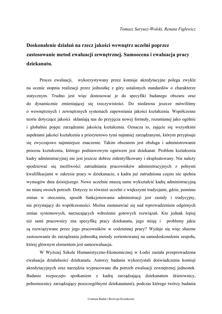 Tomasz Saryusz-Wolski, Renata Figlewicz Doskonalenie działań na rzecz jakości wewnątrz uczelni poprzez zastosowanie metod ewaluacji zewnętrznej. Samoocena i ewaluacja pracy dziekanatu. Proces ewaluacji, wykorzystywany przez komisje akredytacyjne polega zwykle na ocenie stopnia realizacji przez jednostkę z góry ustalonych standardów o charakterze statycznym. Trudno jest więc dostosować je do specyfiki badanego obszaru oraz do dynamicznie zmieniającej się rzeczywistości. Do niedawna jeszcze mówiliśmy o wewnętrznych i zewnętrznych systemach zapewniania jakości kształcenia. Współczesne teorie dotyczące jakości skłaniają nas do przyjęcia nowej formuły, rozumianej jako ogólnie i globalnie pojęte zarządzanie jakością kształcenia. Oznacza to, zajęcie się wszystkimi aspektami jakości kształcenia a priorytetowo tymi najmniej zarządzanymi, którym przypisuje się zwyczajowo najmniejsze znaczenie. Takim obszarem jest obsługa i administrowanie procesu kształcenia, którego podstawowym ogniwem jest dziekanat. Problem kształcenia kadry administracyjnej nie jest jeszcze dobrze zidentyfikowany i eksploatowany. Nie należy spodziewać się możliwości zatrudniania pracowników administracyjnych z pełnymi kwalifikacjami w zakresie pracy w dziekanacie, a kadra już zatrudniona często nie spełnia wymogów dnia dzisiejszego. Nowe uczelnie muszą same wykształcić kadrę administracyjną na miarę swoich potrzeb. Dotyczy to również uczelni z większymi tradycjami, gdzie, pomimo zmian w otoczeniu, sposób funkcjonowania administracji jest zastały i tradycyjny, nie przystający do współczesności. Można zastanawiać się nad wprowadzeniem odgórnych zmian systemowych, narzucających wdrożenie gotowych rozwiązań. Kto jednak lepiej niż sami pracownicy zna specyfikę pracy dziekanatu, jego misję i problemy jakie są rozwiązywane przez jego pracowników w codziennej pracy? Wydaje się więc słuszne zastosowanie do zarządzania jednostką metody zorientowanej na samodoskonalenie zespołu, której głównym elementem jest samoewaluacja. W Wyższej Szkole Humanistyczno-Ekonomicznej w Łodzi zastała przeprowadzona ewaluacja działalności dziekanatu. Autorzy badania wykorzystali doświadczenia komisji akredytacyjnych oraz narzędzia wypracowane dla potrzeb ewaluacji zewnętrznej jednostek. Badanie rozpoczęto spotkaniem z kadrą zarządzającą dziekanatem (kierownicy, pełnomocnicy zarządzający poszczególnymi dziekanatami), podczas którego twórcy badania Centrum Badań i Rozwoju Kształcenia przedstawili cel i metodę pracy nad samodoskonaleniem. Przekonanie pracowników co do słuszności zaproponowanej drogi ułatwiło znacznie pracę w następnych etapach badania i spowodowało ogromne zaangażowanie zainteresowanych. Po spotkaniu pracownicy dziekanatu rozpoczęli pracę nad samoewaluacją mającą zakończyć się raportem. Proponowany przez koordynatorów badania schemat został zmodyfikowany w trakcie pisania raportu, a spostrzeżone nieprawidłowości poprawiane na bieżąco. Celem samoewaluacji miało być zidentyfikowanie możliwości i ograniczeń dziekanatu oraz wskazanie możliwych sposobów podniesienia jakości jego pracy. Do przeprowadzenia samoewaluacji powstał ośmioosobowy zespół, wyłoniony spośród kierownictwa i pracowników jednostki. Samoewaluacja zakończona została sprawozdaniem sporządzonym według załączonego kwestionariusza, po przedyskutowaniu roboczej wersji sprawozdania w gronie wszystkich pracowników jednostki. Sporządzony przez dziekanat raport z samoewaluacji był efektem refleksyjnego przyjrzenia się własnym możliwościom i ograniczeniom, pojawiającym się w trakcie wypełniania obowiązków jednostki. Posłużyć miał władzom uczelni do zapoznania się z trudnościami i potrzebami wynikającymi z pełnionej przez dziekanat roli w strukturach Wyższej Szkoły Humanistyczno-Ekonomicznej w Łodzi. Bardzo istotne było sprawdzenie poprawności merytorycznej funkcjonowania dziekanatu pod kątem zgodności z obowiązującymi ustawami i zarządzeniami w tym zakresie Przeprowadzając samoewaluację wzięto pod uwagę kontekst funkcjonowania jednostki (adekwatność środków do zamierzonych lub realizowanych celów). Chodziło o aby krytycznie spojrzeć na własną działalność, aby zdać sobie sprawę z zewnętrznych ograniczeń, które mogą wpłynąć na jakość wykonywanych zadań. Pamiętano również o tym, że zadania realizowane przez jednostkę powinny zmierzać do realizacji jej funkcji i być jej w znacznym stopniu podporządkowane. Założono, że raport z samoewaluacji będzie zawierał następujące informacje: 1 Charakterystykę jednostki organizacyjnej 6.1 Rola i funkcje dziekanatu w ogólnej strukturze WSHE1 Dziekanat opisał swoją rolę i pełnione funkcje w strukturze uczelni oraz określił swoje miejsce i rolę w realizacji Misji Uczelni. 6.2 Ogólna charakterystyka jednostki Charakterystyka wykonywanych zadań oraz krótki opis współpracy z innymi jednostkami zwierzchnimi, równoległymi, podporządkowanymi. 1 Oceny funkcjonowania jednostki dokonano w oparciu o misję jaką ma ona do spełnienia. Centrum Badań i Rozwoju Kształcenia 6.1 Co wynika z działalności jednostki dla całej Uczelni. W jaki sposób dziekanat przyczynia się do rozwoju WSHE i do realizacji Misji Uczelni. Za co dziekanat odpowiada w strukturze WSHE. Za co odpowiadają jej poszczególni pracownicy w zakresie swoich obowiązków. Zalecane załączniki: Rola i funkcje działu Schemat organizacyjny jednostki 2 Podstawowe zadania jednostki i sposób ich realizacji 2.1 Plan zadań2 W tej części sprawozdania zawarto informacje na temat realizowanego przez dziekanat planu pracy. Opisane zostały cele dziekanatu oraz sposób ich realizacji. Opisano również sposoby optymalizacji pracy oraz polepszenia jej jakości. 1 Opis i analizę funkcjonowania jednostki W tej części sprawozdania opisano szczegółowy plan prac