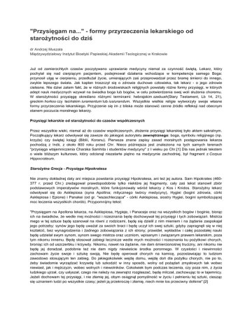 "Przysięgam na..." - formy przyrzeczenia lekarskiego od starożytności do dziś dr Andrzej Muszala Międzywydziałowy Instytut Bioetyki Papieskiej Akademii Teologicznej w Krakowie Już od zamierzchłych czasów poczytywano uprawianie medycyny niemal za czynność świętą. Lekarz, który pochylał się nad cierpiącym pacjentem, podejmował działania wchodzące w kompetencje samego Boga: przynosił ulgę w cierpieniu, przedłużał życie, umierających zaś przeprowadzał przez bramę śmierci do innego, zwykle lepszego świata. Jak kapłan troszczył się o zdrowie duchowe człowieka, tak lekarz - o jego zdrowie cielesne. Nie dziwi zatem fakt, że w różnych środowiskach religijnych powstały różne formy przysięgi, w których adept nauk medycznych wzywał na świadka boga lub bogów, w celu potwierdzenia swej woli służenia choremu. W starożytności przysięgę określano różnymi terminami: hebrajskim szebuah(Stary Testament, Lb 14, 21), greckim horkos czy łacińskim iuramentum lub iusiurandum. Wszystkie wielkie religie wytworzyły swoje własne formy przyrzeczenia lekarskiego. Przyjrzenie się im z bliska może stanowić cenne źródło refleksji nad obecnym stanem poczucia moralnego lekarzy. Przysięgi lekarskie od starożytności do czasów współczesnych Przez wszystkie wieki, niemal aż do czasów współczesnych, złożenie przysięgi lekarskiej było aktem sakralnym. Początkujący lekarz odwoływał się zawsze do jakiegoś autorytetu zewnętrznego: boga, symbolu religijnego (np. krzyża) czy świętej księgi (Biblii, Koranu). Pierwsze znane zapisy zasad moralnych postępowania lekarza pochodzą z Indii, z około 800 roku przed Chr. Nieco późniejsza jest znaleziona na tych samych terenach "przysięga wtajemniczenia Charaka Samhita i studentów medycyny" z I wieku po Chr.[1] Dla nas jednak tekstem o wiele bliższym kulturowo, który odcisnął niezatarte piętno na medycynie zachodniej, był fragment z Corpus Hippocrateum. Starożytna Grecja - Przysięga Hipokratesa Nie znamy dokładnej daty ani miejsca powstania przysięgi Hipokratesa, ani też jej autora. Sam Hipokrates (460377 r. przed Chr.) zredagował prawdopodobnie tylko niektóre jej fragmenty, cały zaś tekst stanowił zbiór podstawowych imperatywów moralnych, które funkcjonowały wśród lekarzy z Kos i Knidos. Starożytny lekarz odwoływał się do Asklepiosa (syna Apollina; mitycznego twórcy medycyny), Hygiei (bogini zdrowia, córki Asklepiosa i Epione) i Panakei (od gr. "wszechlecząca" - córki Asklepiosa, siostry Hygiei, bogini symbolizującej moc leczenia wszystkich chorób). Przypomnijmy tekst: "Przysięgam na Apollona lekarza, na Asklepiosa, Hygieje, i Panaceje oraz na wszystkich bogów i boginie, biorąc ich na świadków, że wedle mej możności i rozeznania będę dochowywał tej przysięgi i tych zobowiązań. Mistrza mego w tej sztuce będę szanował na równi z rodzicami, będę się dzielił z nim mieniem i na żądanie zaspokajał jego potrzeby: synów jego będę uważał za swoich braci i będę uczył ich swej sztuki, gdyby zapragnęli się w niej kształcić, bez wynagrodzenia i żadnego zobowiązania z ich strony; prawideł, wykładów i całej pozostałej nauki będę udzielał swym synom, synom swego mistrza oraz uczniom, wpisanym i związanym prawem lekarskim, poza tym nikomu innemu. Będę stosował zabiegi lecznicze wedle mych możności i rozeznania ku pożytkowi chorych, broniąc ich od uszczerbku i krzywdy. Nikomu, nawet na żądanie, nie dam śmiercionośnej trucizny, ani nikomu nie będę jej doradzał, podobnie też nie dam nigdy niewieście środka poronnego. W czystości i niewinności zachowam życie swoje i sztukę swoją. Nie będę operował chorych na kamicę, pozostawiając to ludziom zawodowo stosującym ten zabieg. Do jakiegokolwiek wejdę domu, wejdę doń dla pożytku chorych, nie po to, żeby świadomie wyrządzać krzywdę lub szkodzić w inny sposób, wolny od pożądań zmysłowych tak wobec niewiast, jak i mężczyzn, wobec wolnych i niewolników. Cokolwiek bym podczas leczenia, czy poza nim, z życia ludzkiego ujrzał, czy usłyszał, czego nie należy na zewnątrz rozgłaszać, będę milczał, zachowując to w tajemnicy. Jeżeli dochowam tej przysięgi, i nie złamię jej, obym osiągnął pomyślność w życiu i pełnieniu tej sztuki, ciesząc się uznaniem ludzi po wszystkie czasy; jeżeli ją przekroczę i złamię, niech mnie los przeciwny dotknie".[2] Przysięga żydowska Żydowski etos medycyny budowany był na zasadach starotestamentalnych oraz tradycji talmudycznej.[3]Teksty tych pism ukazywały jeszcze ściślejszy związek religii z medycyną. Pierwszy deontologiczny zapis lekarski - tzw. przysięga Asaph - został zredagowany między III a VIII wiekiem po Chr. Bardziej znana jest jednak oryginalna forma przysięgi lekarskiej z Kodeksu Mojżesza Majmonidesa. Jej autor był lekarzem żydowskim, i równocześnie wybitnym uczonym i filozofem, żyjącym w Hiszpanii w II połowie XII wieku. Lekarz nie tylko powoływał się w niej na Boga, lecz wprost zwracał się do niego w formie modlitwy; stąd istnieje podejrzenie, że tekst ten mógł być przez niego wypowiadany o wiele częściej, być może nawet codziennie: "Boże, stworzyłeś ciało człowieka w nieskończonej dobroci. Złączyłeś w nim niezliczone siły, stale działające, jak w wielu urządzeniach, tak aby zachować w całości ten piękny dom zawierający jego nieśmiertelną duszę i siły te działają w największym porządku, zgodzie i harmonii, jakie można sobie wyobrazić. Lecz jeśli słabość lub gwałtowna pasja zakłócą tę harmonię, siły te zadziałają jedna przeciwko drugiej i ciało powraca do prochu, z którego przybyło. Zesłałeś następnie człowiekowi Posłańców choroby, które zapowiadają zbliżanie się niebezpieczeństwa i nakazałeś mu, by przygotował się na ich zwalczanie. Wieczna Opatrzność wyznaczyła mnie, bym czuwał nad życie
