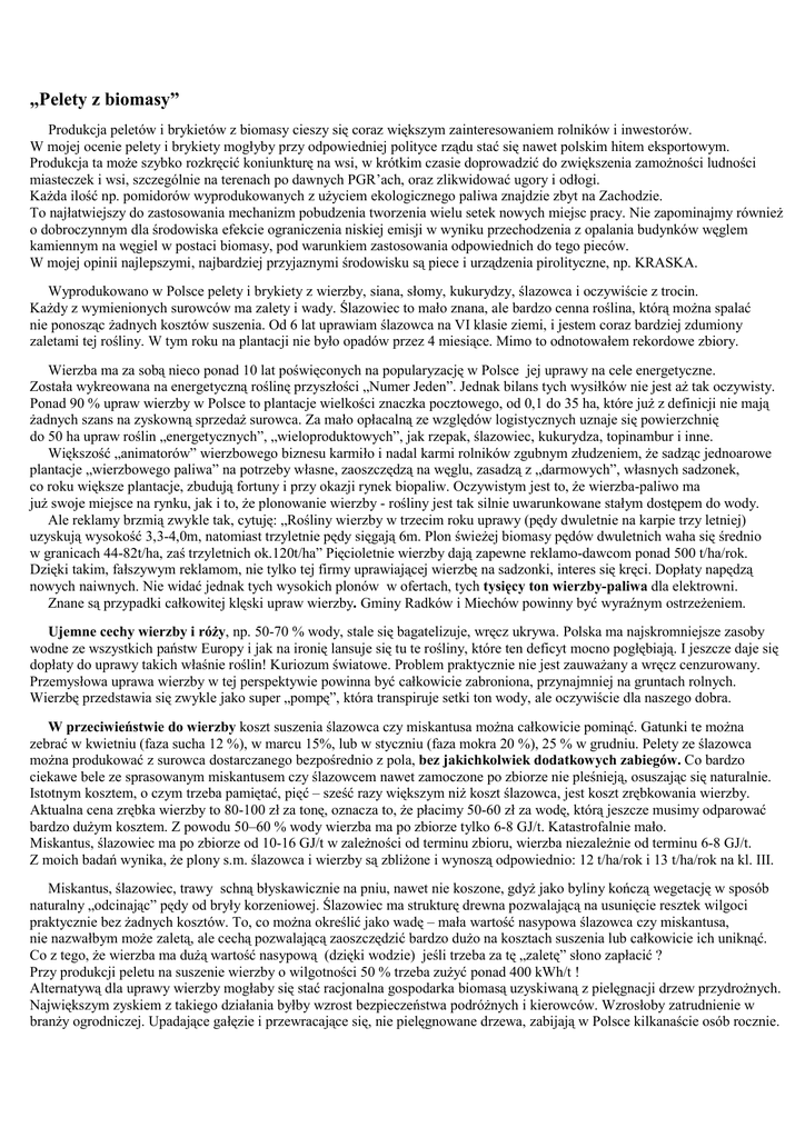 „Pelety z biomasy” Produkcja peletów i brykietów z biomasy cieszy się coraz większym zainteresowaniem rolników i inwestorów. W mojej ocenie pelety i brykiety mogłyby przy odpowiedniej polityce rządu stać się nawet polskim hitem eksportowym. Produkcja ta moŜe szybko rozkręcić koniunkturę na wsi, w krótkim czasie doprowadzić do zwiększenia zamoŜności ludności miasteczek i wsi, szczególnie na terenach po dawnych PGR’ach, oraz zlikwidować ugory i odłogi. KaŜda ilość np. pomidorów wyprodukowanych z uŜyciem ekologicznego paliwa znajdzie zbyt na Zachodzie. To najłatwiejszy do zastosowania mechanizm pobudzenia tworzenia wielu setek nowych miejsc pracy. Nie zapominajmy równieŜ o dobroczynnym dla środowiska efekcie ograniczenia niskiej emisji w wyniku przechodzenia z opalania budynków węglem kamiennym na węgiel w postaci biomasy, pod warunkiem zastosowania odpowiednich do tego pieców. W mojej opinii najlepszymi, najbardziej przyjaznymi środowisku są piece i urządzenia pirolityczne, np. KRASKA. Wyprodukowano w Polsce pelety i brykiety z wierzby, siana, słomy, kukurydzy, ślazowca i oczywiście z trocin. KaŜdy z wymienionych surowców ma zalety i wady. Ślazowiec to mało znana, ale bardzo cenna roślina, którą moŜna spalać nie ponosząc Ŝadnych kosztów suszenia. Od 6 lat uprawiam ślazowca na VI klasie ziemi, i jestem coraz bardziej zdumiony zaletami tej rośliny. W tym roku na plantacji nie było opadów przez 4 miesiące. Mimo to odnotowałem rekordowe zbiory. Wierzba ma za sobą nieco ponad 10 lat poświęconych na popularyzację w Polsce jej uprawy na cele energetyczne. Została wykreowana na energetyczną roślinę przyszłości „Numer Jeden”. Jednak bilans tych wysiłków nie jest aŜ tak oczywisty. Ponad 90 % upraw wierzby w Polsce to plantacje wielkości znaczka pocztowego, od 0,1 do 35 ha, które juŜ z definicji nie mają Ŝadnych szans na zyskowną sprzedaŜ surowca. Za mało opłacalną ze względów logistycznych uznaje się powierzchnię do 50 ha upraw roślin „energetycznych”, „wieloproduktowych”, jak rzepak, ślazowiec, kukurydza, topinambur i inne. Większość „animatorów” wierzbowego biznesu karmiło i nadal karmi rolników zgubnym złudzeniem, Ŝe sadząc jednoarowe plantacje „wierzbowego paliwa” na potrzeby własne, zaoszczędzą na węglu, zasadzą z „darmowych”, własnych sadzonek, co roku większe plantacje, zbudują fortuny i przy okazji rynek biopaliw. Oczywistym jest to, Ŝe wierzba-paliwo ma juŜ swoje miejsce na rynku, jak i to, Ŝe plonowanie wierzby - rośliny jest tak silnie uwarunkowane stałym dostępem do wody. Ale reklamy brzmią zwykle tak, cytuję: „Rośliny wierzby w trzecim roku uprawy (pędy dwuletnie na karpie trzy letniej) uzyskują wysokość 3,3-4,0m, natomiast trzyletnie pędy sięgają 6m. Plon świeŜej biomasy pędów dwuletnich waha się średnio w granicach 44-82t/ha, zaś trzyletnich ok.120t/ha” Pięcioletnie wierzby dają zapewne reklamo-dawcom ponad 500 t/ha/rok. Dzięki takim, fałszywym reklamom, nie tylko tej firmy uprawiającej wierzbę na sadzonki, interes się kręci. Dopłaty napędzą nowych naiwnych. Nie widać jednak tych wysokich plonów w ofertach, tych tysięcy ton wierzby-paliwa dla elektrowni. Znane są przypadki całkowitej klęski upraw wierzby. Gminy Radków i Miechów powinny być wyraźnym ostrzeŜeniem. Ujemne cechy wierzby i róŜy, np. 50-70 % wody, stale się bagatelizuje, wręcz ukrywa. Polska ma najskromniejsze zasoby wodne ze wszystkich państw Europy i jak na ironię lansuje się tu te rośliny, które ten deficyt mocno pogłębiają. I jeszcze daje się dopłaty do uprawy takich właśnie roślin! Kuriozum światowe. Problem praktycznie nie jest zauwaŜany a wręcz cenzurowany. Przemysłowa uprawa wierzby w tej perspektywie powinna być całkowicie zabroniona, przynajmniej na gruntach rolnych. Wierzbę przedstawia się zwykle jako super „pompę”, która transpiruje setki ton wody, ale oczywiście dla naszego dobra. W przeciwieństwie do wierzby koszt suszenia ślazowca czy miskantusa moŜna całkowicie pominąć. Gatunki te moŜna zebrać w kwietniu (faza sucha 12 %), w marcu 15%, lub w styczniu (faza mokra 20 %), 25 % w grudniu. Pelety ze ślazowca moŜna produkować z surowca dostarczanego bezpośrednio z pola, bez jakichkolwiek dodatkowych zabiegów. Co bardzo ciekawe bele ze sprasowanym miskantusem czy ślazowcem nawet zamoczone po zbiorze nie pleśnieją, osuszając się naturalnie. Istotnym kosztem, o czym trzeba pamiętać, pięć – sześć razy większym niŜ koszt ślazowca, jest koszt zrębkowania wierzby. Aktualna cena zrębka wierzby to 80-100 zł za tonę, oznacza to, Ŝe płacimy 50-60 zł za wodę, którą jeszcze musimy odparować bardzo duŜym kosztem. Z powodu 50–60 % wody wierzba ma po zbiorze tylko 6-8 GJ/t. Katastrofalnie mało. Miskantus, ślazowiec ma po zbiorze od 10-16 GJ/t w zaleŜności od terminu zbioru, wierzba niezaleŜnie od terminu 6-8 GJ/t. Z moich badań wynika, Ŝe plony s.m. ślazowca i wierzby są zbliŜone i wynoszą odpowiednio: 12 t/ha/rok i 13 t/ha/rok na kl. III. Miskantus, ślazowiec, trawy schną błyskawicznie na pniu, nawet nie koszone, gdyŜ jako byliny kończą wegetację w sposób naturalny „odcinając” pędy od bryły korzeniowej. Ślazowiec ma strukturę drewna pozwalającą na usunięcie resztek wilgoci praktycznie bez Ŝadnych kosztów. To, co moŜna określić jako wadę – mała wartość nasypowa ślazowca czy miskantusa, nie nazwałbym moŜe zaletą, ale cechą pozwalającą zaoszczędzić bardzo duŜo na kosztach suszenia lub całkowicie ich uniknąć. Co z tego, Ŝe wierzba ma duŜą wartość nasypową (dzięki wodzie) jeśli trzeba za tę „zaletę” słono zapłacić ? Przy produkcji peletu na suszenie wierzby o wilgotności 50 % trzeba zuŜyć ponad 400 kWh/t ! Alternatywą dla uprawy wierzby mogłaby się stać racjonalna gospodarka biomasą uzyskiwaną z pie