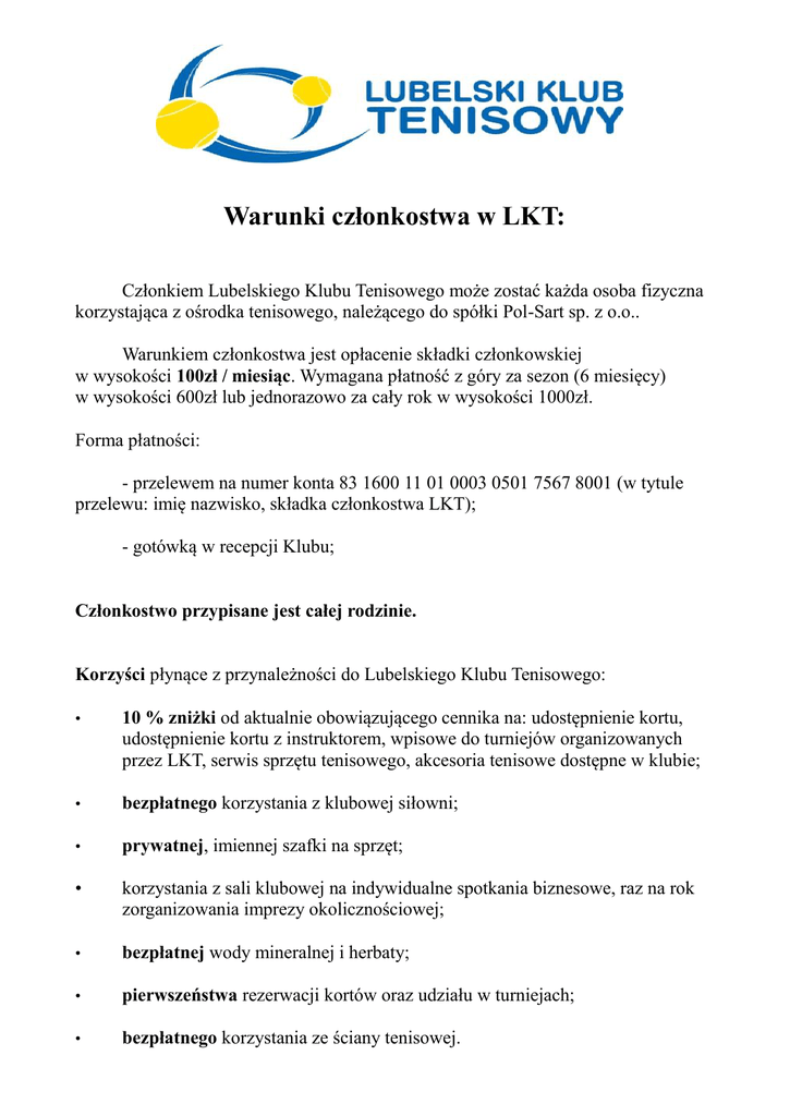 Warunki członkostwa w LKT: Członkiem Lubelskiego Klubu Tenisowego może zostać każda osoba fizyczna korzystająca z ośrodka tenisowego, należącego do spółki Pol-Sart sp. z o.o.. Warunkiem członkostwa jest opłacenie składki członkowskiej w wysokości 100zł / miesiąc. Wymagana płatność z góry za sezon (6 miesięcy) w wysokości 600zł lub jednorazowo za cały rok w wysokości 1000zł. Forma płatności: - przelewem na numer konta 83 1600 11 01 0003 0501 7567 8001 (w tytule przelewu: imię nazwisko, składka członkostwa LKT); - gotówką w recepcji Klubu; Członkostwo przypisane jest całej rodzinie. Korzyści płynące z przynależności do Lubelskiego Klubu Tenisowego: • 10 % zniżki od aktualnie obowiązującego cennika na: udostępnienie kortu, udostępnienie kortu z instruktorem, wpisowe do turniejów organizowanych przez LKT, serwis sprzętu tenisowego, akcesoria tenisowe dostępne w klubie; • bezpłatnego korzystania z klubowej siłowni; • prywatnej, imiennej szafki na sprzęt; • korzystania z sali klubowej na indywidualne spotkania biznesowe, raz na rok zorganizowania imprezy okolicznościowej; • bezpłatnej wody mineralnej i herbaty; • pierwszeństwa rezerwacji kortów oraz udziału w turniejach; • bezpłatnego korzystania ze ściany tenisowej.