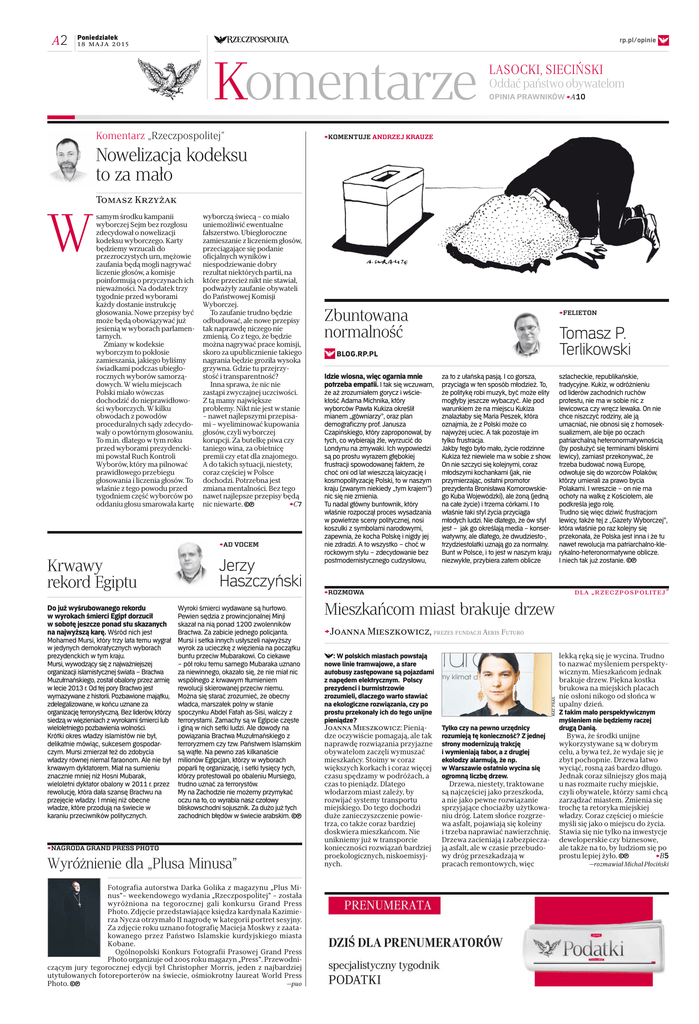 A2 Poniedziałek rp.pl/opinie 18 maja 2015 Komentarze Komentarz „Rzeczpospolitej” ◊ LASOCKI, SIECIŃSKI Oddać państwo obywatelom OPINIA PRAWNIKÓW >A10 >KOMENTUJE ANDRZEJ KRAUZE Nowelizacja kodeksu to za mało Tomasz Krzyżak wyborczą świecą – co miało uniemożliwić ewentualne fałszerstwo. Ubiegłoroczne zamieszanie z liczeniem głosów, przeciągające się podanie oficjalnych wyników i niespodziewanie dobry rezultat niektórych partii, na które przecież nikt nie stawiał, podważyły zaufanie obywateli do Państwowej Komisji Wyborczej. To zaufanie trudno będzie odbudować, ale nowe przepisy tak naprawdę niczego nie zmienią. Co z tego, że będzie można nagrywać prace komisji, skoro za upublicznienie takiego nagrania będzie groziła wysoka grzywna. Gdzie tu przejrzystość i transparentność? Inna sprawa, że nic nie zastąpi zwyczajnej uczciwości. Z tą mamy największe problemy. Nikt nie jest w stanie – nawet najlepszymi przepisami – wyeliminować kupowania głosów, czyli wyborczej korupcji. Za butelkę piwa czy taniego wina, za obietnicę premii czy etat dla znajomego. A do takich sytuacji, niestety, coraz częściej w Polsce dochodzi. Potrzebna jest zmiana mentalności. Bez tego nawet najlepsze przepisy będą nic niewarte. >C7 >AD VOCEM Krwawy rekord Egiptu Do już wyśrubowanego rekordu w wyrokach śmierci Egipt dorzucił w sobotę jeszcze ponad stu skazanych na najwyższą karę. Wśród nich jest Mohamed Mursi, który trzy lata temu wygrał w jedynych demokratycznych wyborach prezydenckich w tym kraju. Mursi, wywodzący się z najważniejszej organizacji islamistycznej świata – Bractwa Muzułmańskiego, został obalony przez armię w lecie 2013 r. Od tej pory Bractwo jest wymazywane z historii. Pozbawione majątku, zdelegalizowane, w końcu uznane za organizację terrorystyczną. Bez liderów, którzy siedzą w więzieniach z wyrokami śmierci lub wieloletniego pozbawienia wolności. Krótki okres władzy islamistów nie był, delikatnie mówiąc, sukcesem gospodarczym. Mursi zmierzał też do zdobycia władzy równej niemal faraonom. Ale nie był krwawym dyktatorem. Miał na sumieniu znacznie mniej niż Hosni Mubarak, wieloletni dyktator obalony w 2011 r. przez rewolucję, która dała szansę Bractwu na przejęcie władzy. I mniej niż obecne władze, które przodują na świecie w karaniu przeciwników politycznych. Jerzy Haszczyński Zbuntowana normalność >FELIETON Tomasz P. Terlikowski ◊ BLOG.RP.PL Idzie wiosna, więc ogarnia mnie potrzeba empatii. I tak się wczuwam, że aż zrozumiałem gorycz i wściekłość Adama Michnika, który wyborców Pawła Kukiza określił mianem „gówniarzy”, oraz plan demograficzny prof. Janusza Czapińskiego, który zaproponował, by tych, co wybierają źle, wyrzucić do Londynu na zmywaki. Ich wypowiedzi są po prostu wyrazem głębokiej frustracji spowodowanej faktem, że choć oni od lat wieszczą laicyzację i kosmopolityzację Polski, to w naszym kraju (zwanym niekiedy „tym krajem”) nic się nie zmienia. Tu nadal główny buntownik, który właśnie rozpoczął proces wysadzania w powietrze sceny politycznej, nosi koszulki z symbolami narodowymi, zapewnia, że kocha Polskę i nigdy jej nie zdradzi. A to wszystko – choć w rockowym stylu – zdecydowanie bez postmodernistycznego cudzysłowu, za to z ułańską pasją. I co gorsza, przyciąga w ten sposób młodzież. To, że politykę robi muzyk, być może elity mogłyby jeszcze wybaczyć. Ale pod warunkiem że na miejscu Kukiza znalazłaby się Maria Peszek, która oznajmia, że z Polski może co najwyżej uciec. A tak pozostaje im tylko frustracja. Jakby tego było mało, życie rodzinne Kukiza też niewiele ma w sobie z show. On nie szczyci się kolejnymi, coraz młodszymi kochankami (jak, nie przymierzając, ostatni promotor prezydenta Bronisława Komorowskiego Kuba Wojewódzki), ale żoną (jedną na całe życie) i trzema córkami. I to właśnie taki styl życia przyciąga młodych ludzi. Nie dlatego, że ów styl jest – jak go określają media – konserwatywny, ale dlatego, że dwudziesto-, trzydziestolatki uznają go za normalny. Bunt w Polsce, i to jest w naszym kraju niezwykłe, przybiera zatem oblicze szlacheckie, republikańskie, tradycyjne. Kukiz, w odróżnieniu od liderów zachodnich ruchów protestu, nie ma w sobie nic z lewicowca czy wręcz lewaka. On nie chce niszczyć rodziny, ale ją umacniać, nie obnosi się z homoseksualizmem, ale bije po oczach patriarchalną heteronormatywnością (by posłużyć się terminami bliskimi lewicy), zamiast przekonywać, że trzeba budować nową Europę, odwołuje się do wzorców Polaków, którzy umierali za prawo bycia Polakami. I wreszcie – on nie ma ochoty na walkę z Kościołem, ale podkreśla jego rolę. Trudno się więc dziwić frustracjom lewicy, także tej z „Gazety Wyborczej”, która właśnie po raz kolejny się przekonała, że Polska jest inna i że tu nawet rewolucja ma patriarchalno-klerykalno-heteronormatywne oblicze. I niech tak już zostanie. >ROZMOWA Wyroki śmierci wydawane są hurtowo. Pewien sędzia z prowincjonalnej Minji skazał na nią ponad 1200 zwolenników Bractwa. Za zabicie jednego policjanta. Mursi i setka innych usłyszeli najwyższy wyrok za ucieczkę z więzienia na początku buntu przeciw Mubarakowi. Co ciekawe – pół roku temu samego Mubaraka uznano za niewinnego, okazało się, że nie miał nic wspólnego z krwawym tłumieniem rewolucji skierowanej przeciw niemu. Można się starać zrozumieć, że obecny władca, marszałek polny w stanie spoczynku Abdel Fatah as-Sisi, walczy z terrorystami. Zamachy są w Egipcie częste i giną w nich setki ludzi. Ale dowody na powiązania Bractwa Muzułmańskiego z terroryzmem czy tzw. Państwem Islamskim są wątłe. Na pewno zaś kilkanaście milionów Egipcjan, którzy w wyborach poparli tę organizację, i setki tysięcy tych, którzy protestowali po obaleniu Mursiego, trudno uznać za te