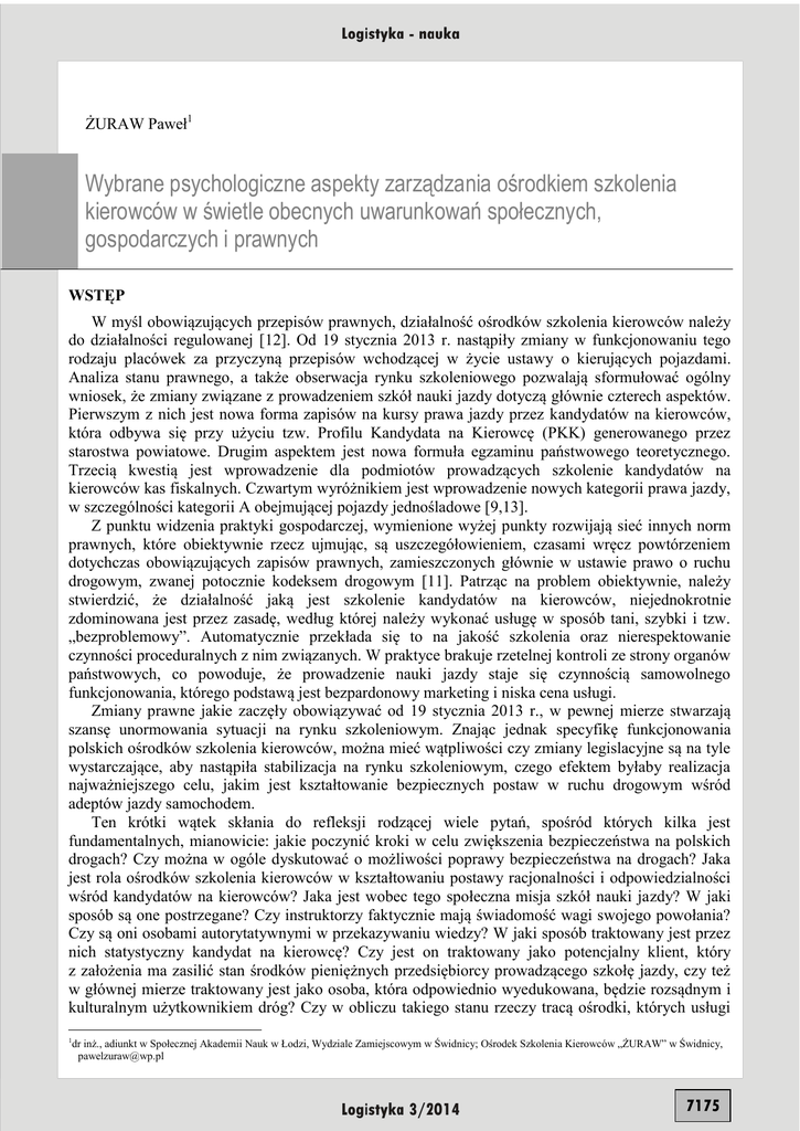 ŻURAW Paweł1 Wybrane psychologiczne aspekty zarządzania ośrodkiem szkolenia kierowców w świetle obecnych uwarunkowań społecznych, gospodarczych i prawnych WSTĘP W myśl obowiązujących przepisów prawnych, działalność ośrodków szkolenia kierowców należy do działalności regulowanej [12]. Od 19 stycznia 2013 r. nastąpiły zmiany w funkcjonowaniu tego rodzaju placówek za przyczyną przepisów wchodzącej w życie ustawy o kierujących pojazdami. Analiza stanu prawnego, a także obserwacja rynku szkoleniowego pozwalają sformułować ogólny wniosek, że zmiany związane z prowadzeniem szkół nauki jazdy dotyczą głównie czterech aspektów. Pierwszym z nich jest nowa forma zapisów na kursy prawa jazdy przez kandydatów na kierowców, która odbywa się przy użyciu tzw. Profilu Kandydata na Kierowcę (PKK) generowanego przez starostwa powiatowe. Drugim aspektem jest nowa formuła egzaminu państwowego teoretycznego. Trzecią kwestią jest wprowadzenie dla podmiotów prowadzących szkolenie kandydatów na kierowców kas fiskalnych. Czwartym wyróżnikiem jest wprowadzenie nowych kategorii prawa jazdy, w szczególności kategorii A obejmującej pojazdy jednośladowe [9,13]. Z punktu widzenia praktyki gospodarczej, wymienione wyżej punkty rozwijają sieć innych norm prawnych, które obiektywnie rzecz ujmując, są uszczegółowieniem, czasami wręcz powtórzeniem dotychczas obowiązujących zapisów prawnych, zamieszczonych głównie w ustawie prawo o ruchu drogowym, zwanej potocznie kodeksem drogowym [11]. Patrząc na problem obiektywnie, należy stwierdzić, że działalność jaką jest szkolenie kandydatów na kierowców, niejednokrotnie zdominowana jest przez zasadę, według której należy wykonać usługę w sposób tani, szybki i tzw. „bezproblemowy”. Automatycznie przekłada się to na jakość szkolenia oraz nierespektowanie czynności proceduralnych z nim związanych. W praktyce brakuje rzetelnej kontroli ze strony organów państwowych, co powoduje, że prowadzenie nauki jazdy staje się czynnością samowolnego funkcjonowania, którego podstawą jest bezpardonowy marketing i niska cena usługi. Zmiany prawne jakie zaczęły obowiązywać od 19 stycznia 2013 r., w pewnej mierze stwarzają szansę unormowania sytuacji na rynku szkoleniowym. Znając jednak specyfikę funkcjonowania polskich ośrodków szkolenia kierowców, można mieć wątpliwości czy zmiany legislacyjne są na tyle wystarczające, aby nastąpiła stabilizacja na rynku szkoleniowym, czego efektem byłaby realizacja najważniejszego celu, jakim jest kształtowanie bezpiecznych postaw w ruchu drogowym wśród adeptów jazdy samochodem. Ten krótki wątek skłania do refleksji rodzącej wiele pytań, spośród których kilka jest fundamentalnych, mianowicie: jakie poczynić kroki w celu zwiększenia bezpieczeństwa na polskich drogach? Czy można w ogóle dyskutować o możliwości poprawy bezpieczeństwa na drogach? Jaka jest rola ośrodków szkolenia kierowców w kształtowaniu postawy racjonalności i odpowiedzialności wśród kandydatów na kierowców? Jaka jest wobec tego społeczna misja szkół nauki jazdy? W jaki sposób są one postrzegane? Czy instruktorzy faktycznie mają świadomość wagi swojego powołania? Czy są oni osobami autorytatywnymi w przekazywaniu wiedzy? W jaki sposób traktowany jest przez nich statystyczny kandydat na kierowcę? Czy jest on traktowany jako potencjalny klient, który z założenia ma zasilić stan środków pieniężnych przedsiębiorcy prowadzącego szkołę jazdy, czy też w głównej mierze traktowany jest jako osoba, która odpowiednio wyedukowana, będzie rozsądnym i kulturalnym użytkownikiem dróg? Czy w obliczu takiego stanu rzeczy tracą ośrodki, których usługi dr inż., adiunkt w Społecznej Akademii Nauk w Łodzi, Wydziale Zamiejscowym w Świdnicy; Ośrodek Szkolenia Kierowców „ŻURAW” w Świdnicy, [email protected] 1 7175 są droższe, ale bezpieczniejsze jakościowo? Dlaczego renomowane ośrodki muszą podporządkować się dyktatowi nowopowstałych firm, często jednoosobowych, które są konkurencyjne jedynie pod względem kształtowania cen? Zaprezentowane fakty rodzą wiele domysłów. Łacińska sentencja mówi: de omnibus dubitandum est (o wszystkim należy wątpić) [4, s. 874]. Jej celowe przytoczenie prowadzi do wniosku, że właściwie wszystko, co otacza ludzką rzeczywistość, co często z pozoru wydaje się oczywiste, można poddawać permanentnej rozwadze, równocześnie pytając o celowość i sens istnienia różnych zjawisk. Ta kolejna myśl podpowiada, że aby dokładnie zrozumieć gamę czynników warunkujących funkcjonowanie szkół nauki jazdy, a co za tym idzie całej branży szkolenia przyszłych kierowców w kontekście wzmożonej konkurencyjności, zaistniałym kryzysie gospodarczym oraz poprawy bezpieczeństwa ruchu drogowego, zasadne jest dokonanie wnikliwej analizy problemu. Autor artykułu przedstawia tezę, że główny fundament analizy funkcjonowania ośrodków szkolenia kierowców, w kontekście wymienionych determinant, powinien zostać ukierunkowany na obszar zarządzania, a ściślej na jego „miękką” stronę, reprezentującą czynniki psychologiczne. Jak wynika ze studiów literaturowych, dotykają one różnych sfer działalności człowieka. W przypadku prowadzenia działalności gospodarczej, obejmują takie obszary zainteresowania jak: właściciel firmy, menedżer, pracownik, klient. Opisują m.in.: motywy zachowań w danej organizacji, motywację do podejmowania określonych działań, problematykę przyjmowanej postawy wobec pracy, zaangażowanie i satysfakcję z pracy, komunikację i uczestnictwo w kulturze przedsiębiorstwa, stres i zniechęcenie do pracy, dobór i szkolenie pracowników. W artykule postawiono dwa zasadnicze pytania badawcze: jaka jest rola psychologicznych narzędzi zarządzania zastosowanych w prowadzeniu szkoły nauki jazdy? które z tych narzędzi, 