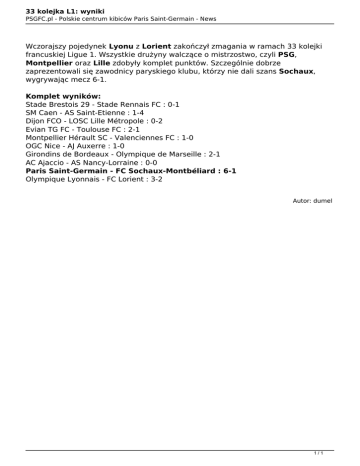 33 kolejka L1: wyniki PSGFC.pl - Polskie centrum kibiców Paris Saint-Germain - News Wczorajszy pojedynek Lyonu z Lorient zakończył zmagania w ramach 33 kolejki francuskiej Ligue 1. Wszystkie drużyny walczące o mistrzostwo, czyli PSG, Montpellier oraz Lille zdobyły komplet punktów. Szczególnie dobrze zaprezentowali się zawodnicy paryskiego klubu, którzy nie dali szans Sochaux, wygrywając mecz 6-1. Komplet wyników: Stade Brestois 29 - Stade Rennais FC : 0-1 SM Caen - AS Saint-Etienne : 1-4 Dijon FCO - LOSC Lille Métropole : 0-2 Evian TG FC - Toulouse FC : 2-1 Montpellier Hérault SC - Valenciennes FC : 1-0 OGC Nice - AJ Auxerre : 1-0 Girondins de Bordeaux - Olympique de Marseille : 2-1 AC Ajaccio - AS Nancy-Lorraine : 0-0 Paris Saint-Germain - FC Sochaux-Montbéliard : 6-1 Olympique Lyonnais - FC Lorient : 3-2 Autor: dumel 1/1 Powered by TCPDF (www.tcpdf.org)