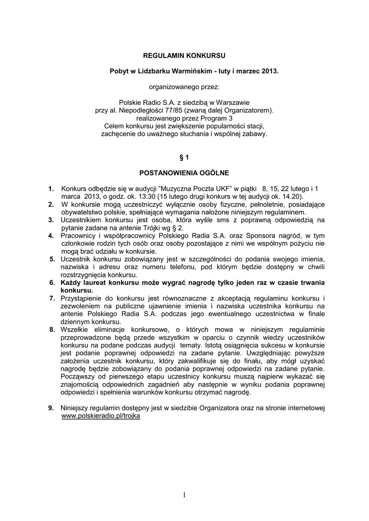 REGULAMIN KONKURSU Pobyt w Lidzbarku Warmińskim - luty i marzec 2013. organizowanego przez: Polskie Radio S.A. z siedzibą w Warszawie przy al. Niepodległości 77/85 (zwaną dalej Organizatorem). realizowanego przez Program 3 Celem konkursu jest zwiększenie popularności stacji, zachęcenie do uważnego słuchania i wspólnej zabawy. §1 POSTANOWIENIA OGÓLNE 1. 2. 3. 4. 5. 6. 7. 8. Konkurs odbędzie się w audycji ”Muzyczna Poczta UKF” w piątki 8, 15, 22 lutego i 1 marca 2013, o godz. ok. 13:30 (15 lutego drugi konkurs w tej audycji ok. 14.20). W konkursie mogą uczestniczyć wyłącznie osoby fizyczne, pełnoletnie, posiadające obywatelstwo polskie, spełniające wymagania nałożone niniejszym regulaminem. Uczestnikiem konkursu jest osoba, która wyśle sms z poprawną odpowiedzią na pytanie zadane na antenie Trójki wg § 2. Pracownicy i współpracownicy Polskiego Radia S.A. oraz Sponsora nagród, w tym członkowie rodzin tych osób oraz osoby pozostające z nimi we wspólnym pożyciu nie mogą brać udziału w konkursie. Uczestnik konkursu zobowiązany jest w szczególności do podania swojego imienia, nazwiska i adresu oraz numeru telefonu, pod którym będzie dostępny w chwili rozstrzygnięcia konkursu. Każdy laureat konkursu może wygrać nagrodę tylko jeden raz w czasie trwania konkursu. Przystąpienie do konkursu jest równoznaczne z akceptacją regulaminu konkursu i zezwoleniem na publiczne ujawnienie imienia i nazwiska uczestnika konkursu na antenie Polskiego Radia S.A. podczas jego ewentualnego uczestnictwa w finale dziennym konkursu. Wszelkie eliminacje konkursowe, o których mowa w niniejszym regulaminie przeprowadzone będą przede wszystkim w oparciu o czynnik wiedzy uczestników konkursu na podane podczas audycji tematy. Istotą osiągnięcia sukcesu w konkursie jest podanie poprawnej odpowiedzi na zadane pytanie. Uwzględniając powyższe założenia uczestnik konkursu, który zakwalifikuje się do finału, aby mógł uzyskać nagrodę będzie zobowiązany do podania poprawnej odpowiedzi na zadane pytanie. Począwszy od pierwszego etapu uczestnicy konkursu muszą najpierw wykazać się znajomością odpowiednich zagadnień aby następnie w wyniku podania poprawnej odpowiedzi i spełnienia warunków konkursu otrzymać nagrodę. 9. Niniejszy regulamin dostępny jest w siedzibie Organizatora oraz na stronie internetowej www.polskieradio.pl/trojka 1 §2 ZASADY I PRZEBIEG KONKURSU 1. W piątki 8, 15, 22 lutego i 1 marca 2013 roku w audycji „Muzyczna Poczta UKF” zadane będzie pytanie konkursowe (w audycji 15 lutego będą zadane dwa pytania, przy czym każde pytanie to osobny konkurs). Zadaniem słuchaczy jest jak najszybciej przesłać poprawną odpowiedź na zadane pytanie wysyłając wiadomość sms pod numer 73 533 (koszt: 3,69 brutto/ 3 zł netto za wysłanie wiadomości). 2. Nagroda dnia zostanie przyznana osobie wybranej spośród wszystkich uczestników konkursu w danej audycji, którzy poprawnie udzielili odpowiedzi na zadane pytanie (w wydaniu audycji 15 lutego będą to dwie osoby – po jednej na dany konkurs w tej audycji). 3. Wysłanie wiadomości sms jest równoznaczne ze zgłoszeniem przez Uczestnika chęci wzięcia udziału w konkursie oraz akceptacją postanowień niniejszego Regulaminu. 4. W konkursie nie są brane pod uwagę wiadomości sms wysyłane przez Internet. 5. Każdy Uczestnik konkursu może wziąć udział w konkursie dowolną liczbę razy, z zastrzeżeniem § 1 ust. 6. 6. Konkurs składa się z jednego etapu i finału: I Etap a) polega na udzieleniu przez Uczestnika prawidłowej odpowiedzi na zadane podczas audycji pytanie za pomocą wiadomości sms wysłanej pod numer 73 533 (koszt: 3zł netto/3,69 brutto). b) Zgłoszenia sms-owe przyjmowane są od momentu zadania pytania na antenie. c) Spośród osób, które przyślą wiadomość sms z poprawną odpowiedzią na zadane danego dnia na antenie pytanie, wybrany zostanie Finalista konkursu (w wydaniu 15 lutego będzie dwóch Finalistów). Finalistą jest osoba, która nadesłała SMS-a z prawidłową odpowiedzią jako pierwsza od chwili zadania pytania (w wydaniu 15 lutego będą to dwie osoby). Czas nadesłania wiadomosci sms mierzony w systemie teleinformatycznym integratora. Finał konkursu a) Danego dnia w Finale konkursu bierze udział Finalista, który nadesłał wiadomość SMS z poprawną odpowiedzią jako pierwszy od zadania pytania na antenie (w wydaniu audycji 15 lutego będą to dwie osoby – po jednej na każdy konkurs w tej audycji). b) Przedstawiciel Organizatora (telefonista albo prowadzący audycję) będzie kontaktować się telefonicznie z wyłonionym finalistą. Próba uzyskania połączenia z Finalistą podejmowana jest nie więcej niż dwukrotnie, przy czym za każdym razem oczekiwanie na połączenie nie może przekroczyć sześciu sygnałów przy sygnale braku odpowiedzi ze strony uczestnika połączenia i czterech sekund przy sygnale zajętości. W przypadku braku żadnego z wyżej wymienionych sygnałów w ciągu pięciu sekund od chwili, gdy zakończono wybieranie numeru, próbę tę ponawia się, nie więcej jednak niż dwukrotnie. W przypadku rozłączenia w trakcie rozmowy próba ponownego połączenia podejmowana jest według wyżej opisanej procedury. c) W chwili uzyskania połączenia z danym Finalistą, podaje on telefoniście albo prowadzącemu swoje imię i nazwisko. Weryfikacja prawa udziału Finalisty w konkursie odbywa się poprzez pytanie czy finalista wysłał sms w konkursie „Pobyt w Lidzbarku Warmińskim” – luty i marzec 2013. d) Po uzyskaniu połączenia i potwierdzeniu prawa udziału Finalisty Konkursu prowadzący albo telefonista zadają pytanie konkursowe. e) Po udzieleniu prawidłowej odpowiedzi, finalista zdobywa nagrodę dnia (więcej o nagrodach w §3). 2 f) W przypadku nieuzyskania poprawnej odpowiedzi procedura wybrania Finalisty jest ponawiana, aż do wyłonienia zwycięzcy konkursu danego dnia. g) Zwycięzca będzie 