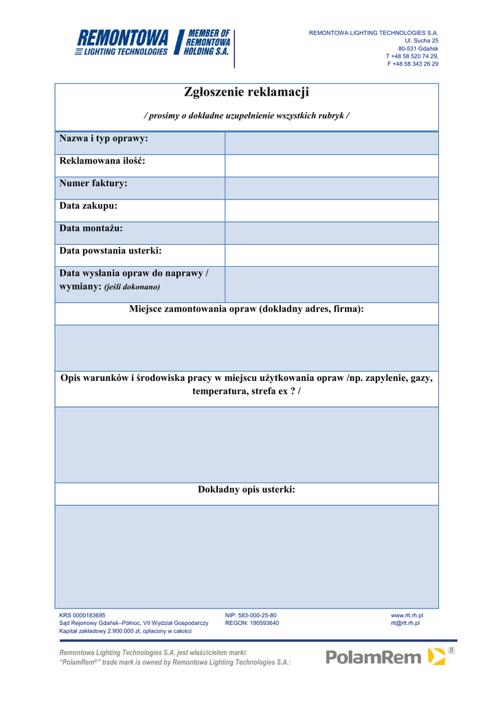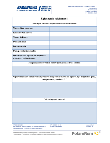 REMONTOWA LIGHTING TECHNOLOGIES S.A. Ul. Sucha 25 80-531 Gdańsk T +48 58 520 74 29, F +48 58 343 26 29 Zgłoszenie reklamacji / prosimy o dokładne uzupełnienie wszystkich rubryk / Nazwa i typ oprawy: Reklamowana ilość: Numer faktury: Data zakupu: Data montażu: Data powstania usterki: Data wysłania opraw do naprawy / wymiany: (jeśli dokonano) Miejsce zamontowania opraw (dokładny adres, firma): Opis warunków i środowiska pracy w miejscu użytkowania opraw /np. zapylenie, gazy, temperatura, strefa ex ? / Dokładny opis usterki: KRS 0000183695 Sąd Rejonowy Gdańsk–Północ, VII Wydział Gospodarczy Kapitał zakładowy 2.900.000 zł, opłacony w całości NIP: 583-000-25-80 REGON: 190593640 Remontowa Lighting Technologies S.A. jest właścicielem marki: “PolamRem®” trade mark is owned by Remontowa Lighting Technologies S.A.: www.rlt.rh.pl [email protected] REMONTOWA LIGHTING TECHNOLOGIES S.A. Ul. Sucha 25 80-531 Gdańsk T +48 58 520 74 29, F +48 58 343 26 29 Nazwisko i kontakt z osobą w miejscu montażu opraw: Nazwa firmy, adres, nazwisko osoby zgłaszającej /telefon, mail/: W przypadku uszkodzenia mechanicznego podczas transportu – proszę wpisać nr listu przewozowego oraz firmę kurierską lub imię i nazwisko osoby dostarczającej. Dodatkowo proszę załączyć protokół szkody spisany z kierowcą oraz dokumentacja zdjęciową. Wypełniony formularz proszę przesłać drogą elektroniczną na adres: [email protected] Z poważaniem Dział Kontroli Jakości Remontowa Lighting Technologies S.A. Tel. +48 58 520 74 62 KRS 0000183695 Sąd Rejonowy Gdańsk–Północ, VII Wydział Gospodarczy Kapitał zakładowy 2.900.000 zł, opłacony w całości NIP: 583-000-25-80 REGON: 190593640 Remontowa Lighting Technologies S.A. jest właścicielem marki: “PolamRem®” trade mark is owned by Remontowa Lighting Technologies S.A.: www.rlt.rh.pl [email protected]
