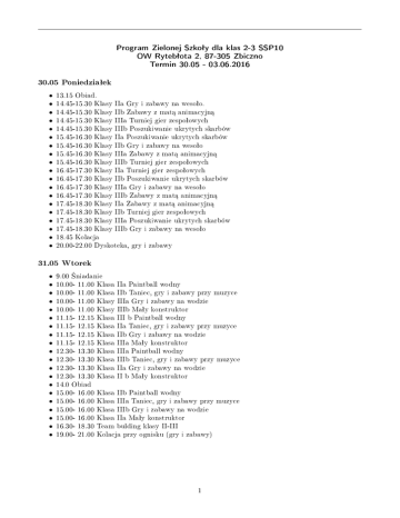 Program Zielonej Szkoªy dla klas 2-3 SSP10 OW Rytebªota 2, 87-305 Zbiczno Termin 30.05 - 03.06.2016 30.05 Poniedziaªek • • • • • • • • • • • • • • • • • • • 13.15 Obiad. 14.45-15.30 Klasy IIa Gry i zabawy na wesoªo. 14.45-15.30 Klasy IIb Zabawy z mat¡ animacyjn¡ 14.45-15.30 Klasy IIIa Turniej gier zespoªowych 14.45-15.30 Klasy IIIb Poszukiwanie ukrytych skarbów 15.45-16.30 Klasy IIa Poszukiwanie ukrytych skarbów 15.45-16.30 Klasy IIb Gry i zabawy na wesoªo 15.45-16.30 Klasy IIIa Zabawy z mat¡ animacyjn¡ 15.45-16.30 Klasy IIIb Turniej gier zespoªowych 16.45-17.30 Klasy IIa Turniej gier zespoªowych 16.45-17.30 Klasy IIb Poszukiwanie ukrytych skarbów 16.45-17.30 Klasy IIIa Gry i zabawy na wesoªo 16.45-17.30 Klasy IIIb Zabawy z mat¡ animacyjn¡ 17.45-18.30 Klasy IIa Zabawy z mat¡ animacyjn¡ 17.45-18.30 Klasy IIb Turniej gier zespoªowych 17.45-18.30 Klasy IIIa Poszukiwanie ukrytych skarbów 17.45-18.30 Klasy IIIb Gry i zabawy na wesoªo 18.45 Kolacja 20.00-22.00 Dyskoteka, gry i zabawy 31.05 Wtorek • • • • • • • • • • • • • • • • • • • • 9.00 niadanie 10.00- 11.00 Klasa IIa Paintball wodny 10.00- 11.00 Klasa IIb Taniec, gry i zabawy przy muzyce 10.00- 11.00 Klasy IIIa Gry i zabawy na wodzie 10.00- 11.00 Klasy IIIb Maªy konstruktor 11.15- 12.15 Klasa III b Paintball wodny 11.15- 12.15 Klasa IIa Taniec, gry i zabawy przy muzyce 11.15- 12.15 Klasa IIb Gry i zabawy na wodzie 11.15- 12.15 Klasa IIIa Maªy konstruktor 12.30- 13.30 Klasa IIIa Paintball wodny 12.30- 13.30 Klasa IIIb Taniec, gry i zabawy przy muzyce 12.30- 13.30 Klasa IIa Gry i zabawy na wodzie 12.30- 13.30 Klasa II b Maªy konstruktor 14.0 Obiad 15.00- 16.00 Klasa IIb Paintball wodny 15.00- 16.00 Klasa IIIa Taniec, gry i zabawy przy muzyce 15.00- 16.00 Klasa IIIb Gry i zabawy na wodzie 15.00- 16.00 Klasa IIa Maªy konstruktor 16.30- 18.30 Team bulding klasy II-III 19.00- 21.00 Kolacja przy ognisku (gry i zabawy) 1 1.06 roda • 8.00 niadanie Zwiedzamy Toru« • • 9.00 - spotkanie z przewodnikami w Brodnicy, przejazd do Torunia 10.30 - - zwiedzanie z przewodnikiem tras¡ 1.12. "Toru« legend i mitów" - dziesi¡tki miejsc, dziesi¡tki legend, opowie±ci, czasami wr¦cz niesamowitych i niewiarygodnych historii. W pro- gramie: • Krzywa Wie»a - Flisak - Ratusz Staromiejski - Dwór Artusa - Katedra wi¦toja«ska - Zamek Krzy»acki - Smok toru«ski - Baszta Koci eb - kamienice - pierniki Muzeum Piernika z warsztatami piernikarskimi Ruiny zamku krzy»ackiego pokaz bicia monet Katedra wi¦toja«ska Tuba Dei W trakcie zwiedzania przerwa na suchy prowiant. • • • godz. 17.00 koniec 18.30 Obiadokolacja 19.30-21.30 Turniej gier zespoªowych 02.06 Czwartek • 09.00 niadanie klasy ( II-III) caªa grupa • • • • • • • 10.00-11.30 Gra logiczno- strategiczna ( Kalinowi odkrywcy ) 11.45-13.00 Zabawa integracyjna ( Szpiedzy ) 13.30 Obiad 14.30 17.00 Zaj¦cia w lesie (gra terenowa, bazy, sztuka kamua»u) 17.30- 18.15 Mi¦dzyklasowa sportowa rywalizacja 18.30 Kolacja 19.30 21.00 Piªka no»na, gry i zabawy 03.06 Pi¡tek • • • • 8.15 niadanie 9.15 - 10.15 Rozdanie nagród 10.30 12.00 Pakowanie, zabieramy suchy prowiant, wyjazd do Warszawy 16.00 Przyjazd pod szkoª¦ Cena wyjazdu 680 zª Wpªaty: • • • I rata do 10.11 - 300 zª II rata do 31.01 - 200 zª III rata do 13.05 - 180 zª 2