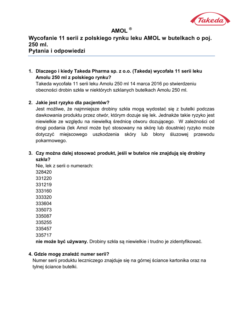 AMOL ® Wycofanie 11 serii z polskiego rynku leku AMOL w butelkach o poj. 250 ml. Pytania i odpowiedzi 1. Dlaczego i kiedy Takeda Pharma sp. z o.o. (Takeda) wycofała 11 serii leku Amolu 250 ml z polskiego rynku? Takeda wycofała 11 serii leku Amolu 250 ml 14 marca 2016 po stwierdzeniu obecności drobin szkła w niektórych szklanych butelkach Amolu 250 ml. 2. Jakie jest ryzyko dla pacjentów? Jest możliwe, że najmniejsze drobiny szkła mogą wydostać się z butelki podczas dawkowania produktu przez otwór, którym dozuje się lek. Jednakże takie ryzyko jest niewielkie ze względu na niewielką średnicę otworu dozującego. W zależności od drogi podania (lek Amol może być stosowany na skórę lub doustnie) ryzyko może dotyczyć miejscowego uszkodzenia skóry lub błony śluzowej przewodu pokarmowego. 3. Czy można dalej stosować produkt, jeśli w butelce nie znajdują się drobiny szkła? Nie, lek z serii o numerach: 328420 331220 331219 333160 333320 333604 335073 335087 335255 335457 335717 nie może być używany. Drobiny szkła są niewielkie i trudno je zidentyfikować. 4. Gdzie mogę znaleźć numer serii? Numer serii produktu leczniczego znajduje się na górnej ściance kartonika oraz na tylnej ściance butelki. 5. Co powinien zrobić pacjent, jeśli usłyszy informację o wycofaniu produktu? Jeśli opakowanie, które posiada pochodzi z wyżej wymienionych serii, pacjent powinien zaprzestać stosowania leku. 6. Co powinien zrobić pacjent, który stosował lek Amol z wadliwych serii? Pacjenci powinni zaprzestać stosowanie leku z wymienionych serii. W przypadku wystąpienia działania niepożądanego pacjent powinien zgłosić jego wystąpienie farmaceucie, lekarzowi lub bezpośrednio do Takeda Pharma: adres email: [email protected], nr telefonu 22 608 13 00 lub 01. Działanie niepożądane można również zgłosić bezpośrednio do Departamentu Monitorowania Niepożądanych Działań Produktów Leczniczych Urzędu Rejestracji Produktów Leczniczych, Wyrobów Medycznych i Produktów Biobójczych Al. Jerozolimskie 181 C, 02-222 Warszawa, tel.: + 48 22 49 21 301, faks: + 48 22 49 21 309, e-mail: [email protected]. 7. Jaki jest zakres problemu? Problem dotyczy wyłącznie leku Amol w opakowaniach o pojemności 250 ml z wymienionych w punkcie 3 serii. 8. Jakie jest ryzyko, że w zakupionej przeze mnie butelce znajdują się drobiny szkła? Prawdopodobieństwo jest oceniane na poziomie mniejszym niż 5%, jednak nie należy stosować leku ponieważ drobiny szkła są niewielkie i trudno je zidentyfikować. 9. Jakie kroki podejmie Takeda by uniknąć powtórzenia się podobnego problemu? Producent butelek, w które pakowany jest lek Amol dostarcza je od roku 1996 i środki bezpieczeństwa stosowane do tej pory oceniane były jako wystarczające. Takeda wraz z producentem butelek zwiększą zakres kontroli jakości. 10. Czy mogę zwrócić Amol 250 ml z wymienionych serii? Aktualny stan prawny (Rozporządzenie Ministra Zdrowia z dnia 12 marca 2008 r. w sprawie określenia szczegółowych zasad i trybu wstrzymywania i wycofywania z obrotu produktów leczniczych i wyrobów medycznych, Dz.U. 2008 nr 57 poz. 347) przewiduje wyłącznie zwrot opakowań produktu leczniczego do apteki na podstawie dokumentu potwierdzającego jego nabycie w tej aptece. 11. Czy mogę zwrócić Amol 250 ml z wymienionych serii, jeśli nie mam paragonu? Aktualny stan prawny (Rozporządzenie Ministra Zdrowia z dnia 12 marca 2008 r. w sprawie określenia szczegółowych zasad i trybu wstrzymywania i wycofywania z obrotu produktów leczniczych i wyrobów medycznych, Dz.U. 2008 nr 57 poz. 347) przewiduje wyłącznie zwrot opakowań produktu leczniczego do apteki na podstawie dokumentu potwierdzającego jego nabycie w tej aptece.