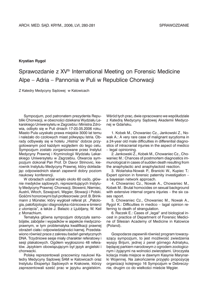 ARCH. MED. S¥D. KRYM., 2006, LVI, 280-281 SPRAWOZDANIE Krystian Rygol Sprawozdanie z XVth International Meeting on Forensic Medicine Alpe Adria Pannonia w Puli w Republice Chorwacji Z Katedry Medycyny S¹dowej w Katowicach Sympozjum, pod patronatem prezydenta Republiki Chorwacji, w obecnoci dziekana Wydzia³u Lekarskiego Uniwersytetu w Zagrzebiu i Ministra Zdrowia, odby³o siê w Puli dniach 17-20.05.2006 roku. Miasto Pula uzyska³o prawa miejskie 3000 lat temu i nale¿a³o do czo³owych miast pó³wyspu Istria. Obrady odbywa³y siê w hotelu Histria dobrze przygotowanym pod ka¿dym wzglêdem do tego celu. Sympozjum zosta³o zorganizowane przez Instytut Medycyny Prawnej i Kryminologii Wydzia³u Lekarskiego Uniwersytetu w Zagrzebiu. Otwarcia sympozjum dokona³ Pan Prof. Dr Davor Strinovic, kierownik Instytutu Medycyny Prawnej, który dok³adaj¹c odpowiednich starañ zapewni³ dobry poziom naukowy konferencji. W obradach udzia³ wziê³o oko³o 60 osób, g³ównie medyków s¹dowych, reprezentuj¹cych Instytuty Medycyny Prawnej: Chorwacji, S³owenii, Niemiec, Austrii, W³och, Szwajcarii, Wêgier, S³owacji i Polski. Goæmi honorowymi byli profesorowie: prof. B. Brinkmann z Münster, który wyg³osi³ referat pt. Patologia, patofizjologia i diagnostyka ró¿nicowa w mierci z utoniêcia, a tak¿e J. Balazic z Ljubljany, W. Keil z Monachium. Tematyka g³ówna sympozjum dotyczy³a samobójstw, zabójstw i wypadków w aspekcie medycznoprawnym, w tym problematyka kwalifikacji prawnej obra¿eñ cia³a i odpowiedzialnoci karnej. Przedstawiono równie¿ prace z zakresu badañ genetycznych DNA. Trzydniowe sesje mia³y charakter referatowy i sesji plakatowych. Ogó³em wyg³oszono 48 referatów. Jêzykiem obowi¹zuj¹cym by³ jêzyk angielski i chorwacki. Polskê reprezentowali pracownicy naukowi Katedry Medycyny S¹dowej AM w Katowicach oraz Instytutu Ekspertyz S¹dowych w Krakowie, którzy zaprezentowali szeæ prac w jêzyku angielskim. Wród tych prac, dwie opracowano we wspó³udziale z Katedr¹ Medycyny S¹dowej Akademii Medycznej w Gdañsku. 1. Kobek M., Chowaniec Cz., Jankowski Z., Nowak A.: A very rare case of malignant sycytioma in a 24-year old male difficulties in differential diagnostics of intracranial injuries in the aspect of medico legal opinioning. 2. Jankowski Z., Kobek M., Chowaniec Cz., Chowaniec M.: Chances of postmortem diagnostics immunological in cases of sudden death resulting from the anaphylactic and anaphylactoid reaction. 3. Wolañska-Nowak P., Branicki W., Kupiec T.: Expert opinion in forensic paternity investigation a bayesian network approach. 4. Chowaniec Cz., Nowak A., Chowaniec M., Kobek M.: Brutal homocides on sexual background with extensive internal organs injuries the six cases raport. 5. Chowaniec Cz., Chowaniec M., Nowak A., Rygol K.: Difficulties in medico lagal opinion referring to death of strangulation. 6. Raczek E.: Cases of legal and biological incest in practice of Department of Forensic Medicine of Silesian Academy of Medicine in Katowice (Poland). Gospodarze zapewnili równie¿ program towarzysz¹cy sympozjum, to jest mo¿liwoæ zwiedzenia wyspy Brijuni, jednej z pere³ górnego Adriatyku, bêd¹cej parkiem narodowym z ogrodem zoologicznym i ¿yj¹cymi na wolnoci zwierzêtami. Uroczysta kolacja mia³a miejsce w dawnym Kasynie Marynarki Wojennej. Na zakoñczenie przyjêto propozycjê organizacji kolejnego 16 Sympozjum w Debreczynie, drugim co do wielkoci miecie Wêgier. Nr 4 SPRAWOZDANIE Sprawozdanie z 85 Jahrestagung der Deutschen Gesellschaft für Rechtsmedizin und DNA in Forensics 2006 w Innsbrucku w Republice Austrii. Coroczny, kolejny, tym razem 85 Kongres Medycyny Prawnej przy udziale Rektora Uniwersytetu Medycznego, prezydenta Kongresu i prezydenta Niemieckiego Towarzystwa Medycyny Prawnej odby³ siê w dniach 26-30.09.2006 roku w stolicy Tyrolu Innsbrucku. Miasto Innsbruck po raz czwarty, od roku 1924, by³o organizatorem Kongresu. Obrady zorganizowane przez Instytut Medycyny Prawnej Uniwersytetu Medycznego w Innsbrucku i Niemieckie Towarzystwo Medycyny Prawnej odbywa³y siê w Centrum Kongresowym doskonale przygotowanym pod ka¿dym wzglêdem do tego celu. Otwarcia Kongresu dokona³ Pan Prof. Dr Clemens Sorg, Rektor Uniwersytetu Medycznego oraz prezydent Kongresu Prof. Dr Richard Scheithauer, kierownik Instytutu, który dok³adaj¹c odpowiednich starañ zapewni³ bardzo wysoki poziom naukowy. Prawie równoczenie, bo w dniach 28-30. 09. 2006 roku odby³ siê Kongres DNA in Forensics 2006. W obradach udzia³ wziê³o oko³o 350-400 osób, g³ównie medyków s¹dowych, ale tak¿e toksykologów i genetyków reprezentuj¹cych Instytuty Medycyny Prawnej (S¹dowej): Austrii, Niemiec, Szwajcarii, W³och, S³owenii, S³owacji, Czech, £otwy, Macedonii, Rumunii, Grecji, Rosji i Polski. Tematyka g³ówna kongresu (dwudniowe obrady) dotyczy³a problemów zwi¹zanych z klasyczn¹ medycyn¹ s¹dow¹. Du¿y nacisk po³o¿ono na kazuistykê s¹dowo-lekarsk¹, czego dowodem by³ referat wprowadzaj¹cy prof. Stefana Pollaka z Freiburga pt.: Od obserwacji przypadku do systematycznej nauki. Toksykologia s¹dowo-lekarska, jako istotny element kongresu, reprezentowana by³a przez znaczne grono naukowców, za wyrazem tego by³y jednodniowe obrady. Sympozjum specjalistyczne DNA in Forensics 2006 doskonale uzupe³nia³o i dope³nia³o wymogi stawiane kongresowi tej rangi. Sesje mia³y charakter referatowy i plakatowy. Ogó³em, zarówno w czasie trwania obrad z medycyny s¹dowej, toksykologii s¹dowo-lekarskiej i genetycznej, wyg³oszono 80 referatów i przedstawiono ponad 200 posterów. Jêzykiem wyk³adowym by³ jêzyk niemiecki za w sesjach genetycznych jêzyk angielski. 281 Polskê, w czasie obrad s¹dowo-lekarskich i toksykologicznych, reprezentowali pracownicy naukowi Katedry Medycyny S¹dowej l¹skiej Akademii Medycznej w Katowicach, Akademii Medycznej we Wroc³awiu i Akademii Medycznej w Bydgoszczy (we wspó³pracy z Instytutem Medycyny Prawnej Uniwersytetu w