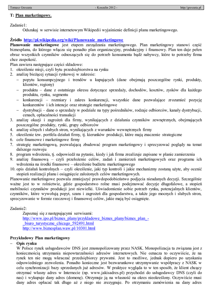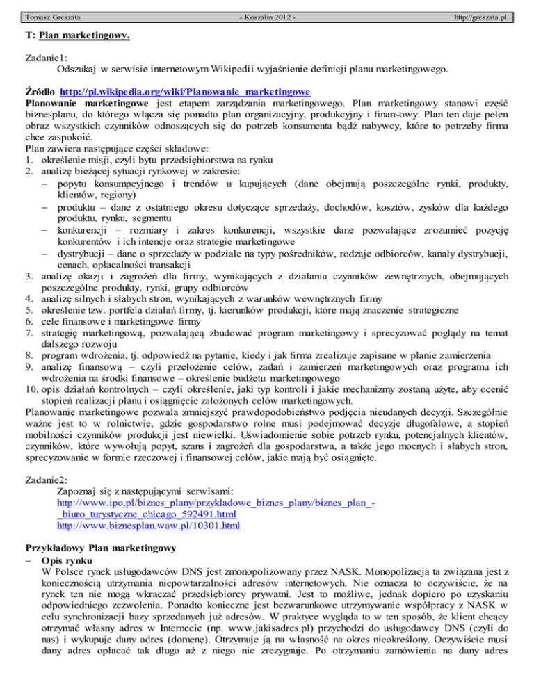 Tomasz Greszata - Koszalin 2012 - http://greszata.pl T: Plan marketingowy. Zadanie1: Odszukaj w serwisie internetowym Wikipedii wyjaśnienie definicji planu marketingowego. Źródło http://pl.wikipedia.org/wiki/Planowanie_marketingowe Planowanie marketingowe jest etapem zarządzania marketingowego. Plan marketingowy stanowi część biznesplanu, do którego włącza się ponadto plan organizacyjny, produkcyjny i finansowy. Plan ten daje pełen obraz wszystkich czynników odnoszących się do potrzeb konsumenta bądź nabywcy, które to potrzeby firma chce zaspokoić. Plan zawiera następujące części składowe: 1. określenie misji, czyli bytu przedsiębiorstwa na rynku 2. analizę bieżącej sytuacji rynkowej w zakresie: popytu konsumpcyjnego i trendów u kupujących (dane obejmują poszczególne rynki, produkty, klientów, regiony) produktu – dane z ostatniego okresu dotyczące sprzedaży, dochodów, kosztów, zysków dla każdego produktu, rynku, segmentu konkurencji – rozmiary i zakres konkurencji, wszystkie dane pozwalające zrozumieć pozycję konkurentów i ich intencje oraz strategie marketingowe dystrybucji – dane o sprzedaży w podziale na typy pośredników, rodzaje odbiorców, kanały dystrybucji, cenach, opłacalności transakcji 3. analizę okazji i zagrożeń dla firmy, wynikających z działania czynników zewnętrznych, obejmujących poszczególne produkty, rynki, grupy odbiorców 4. analizę silnych i słabych stron, wynikających z warunków wewnętrznych firmy 5. określenie tzw. portfela działań firmy, tj. kierunków produkcji, które mają znaczenie strategiczne 6. cele finansowe i marketingowe firmy 7. strategię marketingową, pozwalającą zbudować program marketingowy i sprecyzować poglądy na temat dalszego rozwoju 8. program wdrożenia, tj. odpowiedź na pytanie, kiedy i jak firma zrealizuje zapisane w planie zamierzenia 9. analizę finansową – czyli przełożenie celów, zadań i zamierzeń marketingowych oraz programu ich wdrożenia na środki finansowe – określenie budżetu marketingowego 10. opis działań kontrolnych – czyli określenie, jaki typ kontroli i jakie mechanizmy zostaną użyte, aby ocenić stopień realizacji planu i osiągnięcie założonych celów marketingowych. Planowanie marketingowe pozwala zmniejszyć prawdopodobieństwo podjęcia nieudanych decyzji. Szczególnie ważne jest to w rolnictwie, gdzie gospodarstwo rolne musi podejmować decyzje długofalowe, a stopień mobilności czynników produkcji jest niewielki. Uświadomienie sobie potrzeb rynku, potencjalnych klientów, czynników, które wywołują popyt, szans i zagrożeń dla gospodarstwa, a także jego mocnych i słabych stron, sprecyzowanie w formie rzeczowej i finansowej celów, jakie mają być osiągnięte. Zadanie2: Zapoznaj się z następującymi serwisami: http://www.ipo.pl/biznes_plany/przykladowe_biznes_plany/biznes_plan__biuro_turystyczne_chicago_592491.html http://www.biznesplan.waw.pl/10301.html Przykładowy Plan marketingowy Opis rynku W Polsce rynek usługodawców DNS jest zmonopolizowany przez NASK. Monopolizacja ta związana jest z koniecznością utrzymania niepowtarzalności adresów internetowych. Nie oznacza to oczywiście, że na rynek ten nie mogą wkraczać przedsiębiorcy prywatni. Jest to możliwe, jednak dopiero po uzyskaniu odpowiedniego zezwolenia. Ponadto konieczne jest bezwarunkowe utrzymywanie współpracy z NASK w celu synchronizacji bazy sprzedanych już adresów. W praktyce wygląda to w ten sposób, że klient chcący otrzymać własny adres w Internecie (np. www.jakisadres.pl) przychodzi do usługodawcy DNS (czyli do nas) i wykupuje dany adres (domenę). Otrzymuje ją na własność na okres nieokreślony. Oczywiście musi dany adres opłacać tak długo aż z niego nie zrezygnuje. Po otrzymaniu zamówienia na dany adres Tomasz Greszata - Koszalin 2012 - http://greszata.pl internetowy usługodawca (nasze przedsiębiorstwo) sprawdza w NASK czy jest on dostępny. Jeśli tak to możemy go sprzedać odprowadzając część zysków określoną w umowie z NASK do tej organizacji. Segmentacja rynku docelowego Naszych klientów możemy podzielić ze względu na zamożność lub wiek. Na początku poza kręgiem naszych zainteresowań pozostaną klienci zamożni. Są oni bardziej wymagający i przynajmniej do czasu stworzenia odpowiedniej marki firmy ich pozyskanie nie jest możliwe. Wolą oni znanych (i drogich) usługodawców DNS. Musimy się, więc skoncentrować na tych mniej zamożnych, dla których większe znaczenie ma cena oferowanej domeny. Narzuca to oczywiście utrzymanie strategii niskich cen (a przynajmniej niższych niż te oferowanych przez innych usługodawców). Kolejnym ograniczeniem jest wiek klientów. Usługa utrzymania adresu wymaga zaakceptowania odpowiedniej umowy - regulaminu korzystania z adresu internetowego. Oznacza to nie mniej nie więcej jak to, że konieczne jest pos iadanie dowodu osobistego, a przynajmniej ukończenia osiemnastu lat. Cele działalności marketingowej Celem działalności marketingowej jest dotarcie do tej części rynku docelowego, która została określona podczas segmentacji rynku. Oczywiście podstawowym celem działalności marketingowej naszego przedsiębiorstwa jest pozyskanie zamówień na nowe domeny (adresy internetowe) w celu ich sprzedania i osiągnięcia zysków. Konkurencja Jak już wcześniej pisałem w Polsce rynek domen internetowych jest zmonopolizowany przez NASK. Każdy kto chce sprzedawać domeny musi mieć odpowiednią licencję tej organizacji. Nie jest to jednak monopol w pełni tego słowa znaczeniu. Warunki, na których jest przyznawana licencja, są bowiem jasno określone oraz (co najważniejsze) takie same dla każdego chętnego. Oczywiście licencjonowanie ogranicza znacznie konkurencję na tym rynku. Nie zmienia to faktu, że po wejściu na ten rynek, usługodawcy DNS konkurują tak jak w każdym innym biznesie. NASK - Naukowa i Akademicka Sieć Kompu