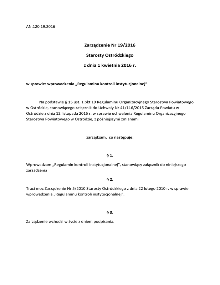 AN.120.19.2016 Zarządzenie Nr 19/2016 Starosty Ostródzkiego z dnia 1 kwietnia 2016 r. w sprawie: wprowadzenia „Regulaminu kontroli instytucjonalnej” Na podstawie § 15 ust. 1 pkt 10 Regulaminu Organizacyjnego Starostwa Powiatowego w Ostródzie, stanowiącego załącznik do Uchwały Nr 41/116/2015 Zarządu Powiatu w Ostródzie z dnia 12 listopada 2015 r. w sprawie uchwalenia Regulaminu Organizacyjnego Starostwa Powiatowego w Ostródzie, z późniejszymi zmianami zarządzam, co następuje: § 1. Wprowadzam „Regulamin kontroli instytucjonalnej”, stanowiący załącznik do niniejszego zarządzenia § 2. Traci moc Zarządzenie Nr 5/2010 Starosty Ostródzkiego z dnia 22 lutego 2010 r. w sprawie wprowadzenia „Regulaminu kontroli instytucjonalnej”. § 3. Zarządzenie wchodzi w życie z dniem podpisania. Załącznik do Zarządzenia Nr 19/2016 Starosty Ostródzkiego z dnia 1 kwietnia 2016 r. REGULAMIN KONTROLI INSTYTUCJONALNEJ ROZDZIAŁ I Postanowienia ogólne § 1. Regulamin kontroli instytucjonalnej, zwany dalej „Regulaminem” określa szczegółowe zasady i tryb przeprowadzania kontroli wewnętrznej w podległych jednostkach organizacyjnych Powiatu Ostródzkiego, komórkach organizacyjnych Starostwa Powiatowego w Ostródzie oraz jednostkach wykonujących zadania zlecone przez Powiat Ostródzki. § 2. Ilekroć w Regulaminie jest mowa o: 1) Powiecie – rozumie się przez to Powiat Ostródzki; 2) Starostwie – rozumie się przez to Starostwo Powiatowe w Ostródzie; 3) Staroście – rozumie się przez to Starostę Ostródzkiego; 4) Zarządzie Powiatu – rozumie się przez to Zarząd Powiatu w Ostródzie; 5) Biurze Audytu Wewnętrznego i Kontroli – rozumie się przez to wyodrębnioną w strukturze Starostwa komórkę organizacyjną Wydziału Administracji, Nadzoru i Kadr, której powierzono między innymi zadania kontrolne; 6) kontroli – rozumie się przez to instytucjonalną kontrolę wewnętrzną ex-post; 7) kontrolującym – rozumie się przez to pracownika Biura Audytu Wewnętrznego i Kontroli lub zespół wieloosobowy powołany przez Starostę do przeprowadzenia kontroli; 8) podmiocie kontrolowanym – rozumie się przez to podległe jednostki organizacyjne Powiatu, komórki organizacyjne Starostwa, w których przeprowadza się kontrolę wewnętrzną ex-post oraz jednostki wykonujące zadania zlecone przez Powiat; 9) kierowniku podmiotu kontrolowanego – rozumie się przez to kierownika jednostki kontrolowanej lub kierownika komórki organizacyjnej, która podlega kontroli; 10) kontrolowanym – rozumie się przez to osobę (osoby, wydział, komórkę) z podmiotu kontrolowanego, którego kontrola dotyczy. § 3. 1. Instytucjonalna kontrola wewnętrzna stanowi cześć systemu kontroli zarządczej. 2. Celem działalności kontrolnej jest wspomaganie Starosty w procesie usprawniania mechanizmów zarządzania oraz umożliwienie monitoringu i nadzoru nad systemem kontroli zarządczej. 3. Kontrolę organizuje i wykonuje Biuro Audytu Wewnętrznego i Kontroli na podstawie rocznego planu zatwierdzonego przez Starostę lub zespół wieloosobowy powołany przez Starostę do przeprowadzenia kontroli. 1 Rozdział II Forma i zakres kontroli § 4. Kontrola może być przeprowadzana jako: 1) kontrola kompleksowa – obejmująca całokształt zagadnień kontrolowanego podmiotu; 2) kontrola problemowa – obejmująca określone zagadnienie, wycinek działalności podmiotu kontrolowanego; 3) kontrola doraźna – przeprowadzona poza rocznym planem kontroli; 4) kontrola sprawdzająca – obejmująca swym zakresem wykonanie wcześniejszych zaleceń pokontrolnych. § 5. Kontrola obejmuje: 1) badanie prawidłowości wykonywania zadań należących do zakresu działania podmiotu kontrolowanego, w szczególności w zakresie: a) wykonywania przez pracowników ich obowiązków służbowych zwłaszcza pod względem zgodności z obowiązującymi przepisami prawa; b) sprawności działania oraz doboru i efektywności stosowania środków służących wykonywaniu zadań należących do zakresu działania podmiotu kontrolowanego i wykorzystywania przez pracowników czasu pracy; c) przestrzegania procedur kontroli w tym wydatkowania środków publicznych, wstępnej oceny celowości zaciągania zobowiązań finansowych i dokonywania wydatków ponoszonych w związku z realizacją zadań; d) realizacji zadań zgodnie z obowiązującymi w jednostce zasadami etycznego postępowania , unikania konfliktu interesów oraz działań korupcyjnych; 2) wskazanie nieprawidłowości i analizę przyczyn ich powstania; 3) wskazanie osiągnięć i przykładów godnych upowszechnienia; 4) przedstawianie kierownikom podmiotów kontrolowanych wniosków i zaleceń poprzez wskazanie sposobów i środków, jakie należy zastosować w celu usunięcia nieprawidłowości, zapobiegania ich powstawaniu i ograniczeniu negatywnych skutków; 5) wskazanie osób odpowiedzialnych za powstałe nieprawidłowości oraz zakresu tej odpowiedzialności. Rozdział III Tryb przeprowadzania kontroli 1. 2. 3. 4. § 6. Kontrola przeprowadzana jest na podstawie rocznego planu kontroli, opracowywanego przez Biuro Audytu Wewnętrznego i Kontroli. Roczny plan kontroli zawiera: datę sporządzenia, zakres podmiotowy i przedmiotowy kontroli oraz termin kontroli. Biuro Audytu Wewnętrznego i Kontroli przedstawia plan kontroli do zatwierdzenia Staroście w terminie do dnia 15 stycznia każdego roku. W uzasadnionych przypadkach, Starosta może zlecić przeprowadzenie kontroli poza 2 planem, o którym mowa w ust. l. oraz przedłużyć, zawiesić lub odwołać zarządzoną kontrolę. 1. 2. 3. 4. § 7. Kontrolujący przeprowadza kontrolę na podstawie upoważnienia do przeprowadzenia kontroli wydanego przez Starostę. Upoważnienie, o którym mowa w ust. 1, zawiera: 1) oznaczenie wydającego upoważnienie; 2) miejsce i datę wydania upoważnienia; 3) imię i nazwisko kontrolującego, jego stanowisko służbowe; 4) nazwę i adres podmiotu kontrolowanego; 5) p