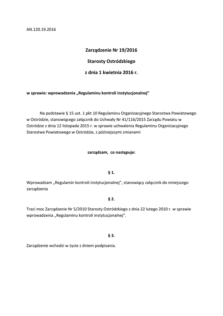 Zarządzenie Nr 19/2016 Starosty Ostródzkiego z dnia 1 kwietnia