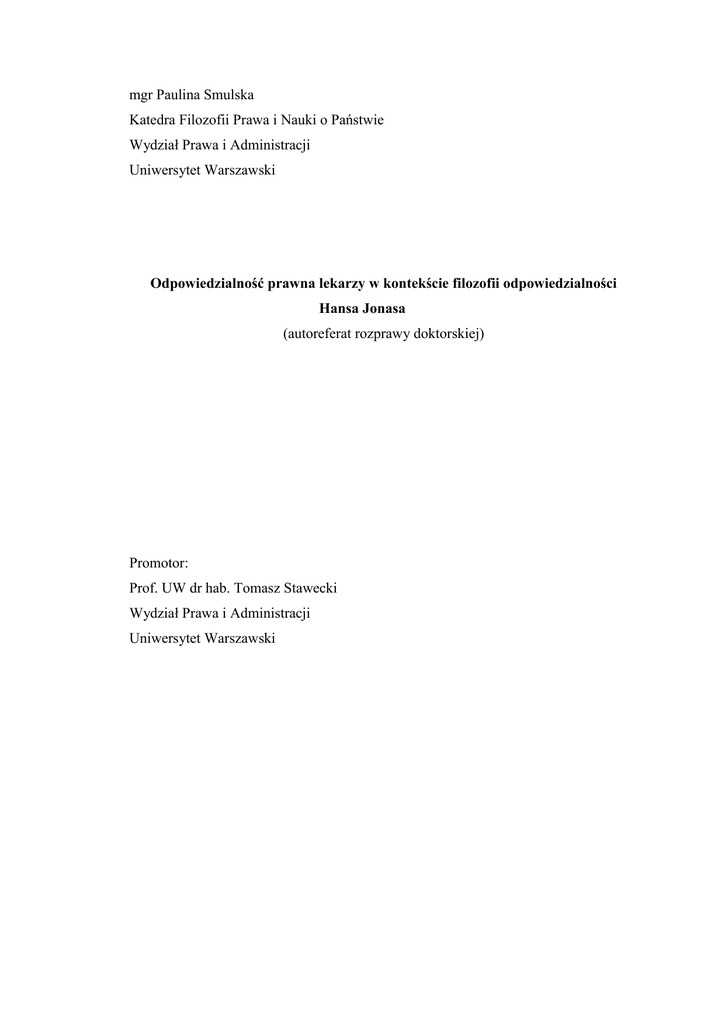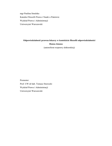 mgr Paulina Smulska Katedra Filozofii Prawa i Nauki o Państwie Wydział Prawa i Administracji Uniwersytet Warszawski Odpowiedzialność prawna lekarzy w kontekście filozofii odpowiedzialności Hansa Jonasa (autoreferat rozprawy doktorskiej) Promotor: Prof. UW dr hab. Tomasz Stawecki Wydział Prawa i Administracji Uniwersytet Warszawski Spis treści I. Wprowadzenie. Przedmiot rozprawy doktorskiej ................................................................ 3 II. Uzasadnienie wyboru filozofii Hansa Jonasa ....................................................................... 4 III. Hipotezy badawcze ................................................................................................................... 5 IV. Cele naukowe ............................................................................................................................ 6 V. Główne metody badawcze ....................................................................................................... 7 VI. Struktura rozprawy doktorskiej............................................................................................... 7 VII. Filozofia odpowiedzialności Hansa Jonasa. Uzasadnienie wyboru filozofii odpowiedzialności Hansa Jonasa ........................................................................................... 8 (1) Hans Jonas ......................................................................................................................... 8 (2) Nowy paradygmat myślenia etycznego ......................................................................... 9 (3) Różne postacie odpowiedzialności w filozofii odpowiedzialności Hansa Jonasa. 10 VIII. Odpowiedzialność prawna lekarzy. Współczesny polski paradygmat myślenia prawniczego. ........................................................................................................................... 13 IX. Nowe ujęcie odpowiedzialności prawnej in genere i odpowiedzialności prawnej lekarzy. .................................................................................................................................... 15 X. Wnioski końcowe rozprawy .................................................................................................. 16 2 I. Wprowadzenie. Przedmiot rozprawy doktorskiej Prezentowana rozprawa doktorska rozpatruje problem odpowiedzialności prawnej lekarzy w kontekście filozofii odpowiedzialności Hansa Jonasa. Podjęłam to zagadnienie nie dlatego, iż odpowiedzialność prawna lekarzy jest szczególną instytucją prawa cywilnego, karnego albo regulacji dyscyplinarnych, lecz z uwagi na to, iż dostrzeżono, że pojęcie odpowiedzialności ma ważną treść filozoficzną. W związku z powyższym oraz mając na uwadze szybki postęp nauk medycznych, niezbędne jest przeanalizowanie mechanizmu odpowiedzialności prawnej lekarzy za czynności podejmowane w ramach wykonywanego przez nich zawodu, z uwzględnieniem filozoficznej treści tej odpowiedzialności. Prezentowana rozprawa jest pracą z dziedziny filozofii prawa, która wsparta została rzetelną wiedzą o prawie obowiązującym w Polsce, ale nie odwrotnie. Dlatego niezasadne byłoby ulokowanie omawianej pracy w którejkolwiek z dogmatycznych nauk prawnych. Przedmiotem analizy w przedstawianej pracy nie są konkretne czynności (czy ich rodzaje), za które lekarz wykonujący zawód może ponosić odpowiedzialność prawną, lecz odpowiedzialność prawna lekarzy w ogólności. Nie oznacza to zignorowania charakterystyki obowiązujących w Polsce norm prawnych wyznaczających zakres, podstawy i treść odpowiedzialności prawnej lekarzy. Omówienie zakresu przedmiotowego odpowiedzialności prawnej lekarzy na gruncie trzech podstawowych postaci odpowiedzialności prawnej (tj. odpowiedzialności cywilnej, odpowiedzialności karnej oraz odpowiedzialności zawodowej) było jednak konieczne, chociażby w ograniczonym zakresie. Wynika to z faktu, iż poszczególne sytuacje, w których lekarze mogą ponosić odpowiedzialność prawną, decydują o treści odpowiedzialności prawnej przez nich ponoszonej. Co więcej, sytuacje te wskazują, w jaką kategorię dóbr prawnie chronionych, godzą poszczególne czyny lekarzy lub też jakiej kategorii dóbr prawnie chronionych odpowiedzialność prawna lekarzy dotyczy. W związku z powyższym, w ramach omówienia przedmiotowego zakresu odpowiedzialności prawnej lekarzy, wskazuję na typowe przypadki, w jakich lekarz ponosi odpowiedzialność na gruncie poszczególnych gałęzi prawa. Warto również zaznaczyć, iż dobra prawne nie pozostają bez znaczenia dla treści innych postaci odpowiedzialności lekarzy, w tym odpowiedzialności pozytywnej, o której mówi Hans Jonas. 3 Współcześnie odpowiedzialność prawna lekarzy jest obecna jako przedmiot dyskursu, zarówno w debacie publicznej, jak i w różnych środowiskach zawodowych. Dotychczas nie została jednak ona poddana głębszej analizie przez prawników, poprzez odniesienie się z jednej strony do istoty odpowiedzialności w sensie ontologicznym i zarazem do odpowiedzialności prawnej in genere jako jej postaci (jednocześnie). Z drugiej strony do lekarza jako podmiotu różnych zaktualizowanych postaci istoty fenomenu odpowiedzialności, z uwzględnieniem specyfiki zawodowej tej profesji oraz jego statusu prawnego. Prezentowana rozprawa nie jest komentarzem bieżących zdarzeń. Zakres analizy wyznaczony został przez dwa obszary badawcze, tj. wynikającej z przepisów i z orzecznictwa sądów zasady odpowiedzialności prawnej lekarzy oraz filozofię odpowiedzialności Hansa Jonasa. Filozofia Hansa Jonasa została w rozprawie potraktowana jako filozofia, która dostarcza niezwykle cennego instrumentarium do analizy odpowiedzialności prawnej lekarzy i kontekstu, który pozwala zrozumieć odpowiedzialność prawną. Filozofia ta została uzupełniona, w pewnym zakresie zinterpretowana i przez to zmodyfikowana, celem dostosowania j