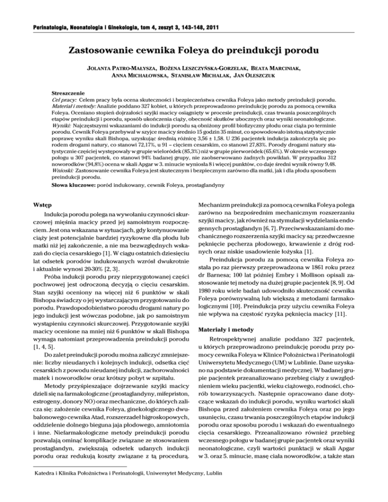 Perinatologia, Neonatologia i Ginekologia, tom 4, zeszyt 3, 143-148, 2011 Zastosowanie cewnika Foleya do preindukcji porodu JOLANTA PATRO-MAŁYSZA, BOŻENA LESZCZYŃSKA-GORZELAK, BEATA MARCINIAK, ANNA MICHAŁOWSKA, STANISŁAW MICHALAK, JAN OLESZCZUK Streszczenie Cel pracy: Celem pracy była ocena skuteczności i bezpieczeństwa cewnika Foleya jako metody preindukcji porodu. Materiał i metody: Analizie poddano 327 kobiet, u których przeprowadzono preindukcję porodu za pomocą cewnika Foleya. Oceniano stopień dojrzałości szyjki macicy osiągnięty w procesie preindukcji, czas trwania poszczególnych etapów preindukcji i porodu, sposób ukończenia ciąży, obecność skutków ubocznych oraz wyniki neonatologiczne. Wyniki: Najczęstszymi wskazaniami do indukcji porodu są obniżony profil biofizyczny płodu oraz ciąża po terminie porodu. Cewnik Foleya przebywał w szyjce macicy średnio 15 godzin 35 minut, co spowodowało istotną statystycznie poprawę wyniku skali Bishopa, uzyskując średnią różnicę 3,56 ± 1,58. U 236 pacjentek indukcja zakończyła się porodem drogami natury, co stanowi 72,17%, u 91 – cięciem cesarskim, co stanowi 27,83%. Porody drogami natury statystycznie częściej występowały w grupie wieloródek (85,3%) niż w grupie pierworódek (65,6%). W okresie wczesnego połogu u 307 pacjentek, co stanowi 94% badanej grupy, nie zaobserwowano żadnych powikłań. W przypadku 312 noworodków (94,8%) ocena w skali Apgar w 3. minucie wyniosła 8 i więcej punktów, co daje średni wynik równy 9,48. Wnioski: Zastosowanie cewnika Foleya jest skutecznym i bezpiecznym zarówno dla matki, jak i dla płodu sposobem preindukcji porodu. Słowa kluczowe: poród indukowany, cewnik Foleya, prostaglandyny Wstęp Indukcja porodu polega na wywołaniu czynności skurczowej mięśnia macicy przed jej samoistnym rozpoczęciem. Jest ona wskazana w sytuacjach, gdy kontynuowanie ciąży jest potencjalnie bardziej ryzykowne dla płodu lub matki niż jej zakończenie, a nie ma bezwzględnych wskazań do cięcia cesarskiego [1]. W ciągu ostatnich dziesięciu lat odsetek porodów indukowanych wzrósł dwukrotnie i aktualnie wynosi 20-30% [2, 3]. Próba indukcji porodu przy nieprzygotowanej części pochwowej jest odroczoną decyzją o cięciu cesarskim. Stan szyjki oceniony na więcej niż 6 punktów w skali Bishopa świadczy o jej wystarczającym przygotowaniu do porodu. Prawdopodobieństwo porodu drogami natury po jego indukcji jest wówczas podobne, jak po samoistnym wystąpieniu czynności skurczowej. Przygotowanie szyjki macicy ocenione na mniej niż 6 punktów w skali Bishopa wymaga natomiast przeprowadzenia preindukcji porodu [1, 4, 5]. Do zalet preindukcji porodu można zaliczyć zmniejszenie: liczby nieudanych i kolejnych indukcji, odsetka cięć cesarskich z powodu nieudanej indukcji, zachorowalności matek i noworodków oraz krótszy pobyt w szpitalu. Metody przyśpieszające dojrzewanie szyjki macicy dzieli się na farmakologiczne (prostaglandyny, mifepriston, estrogeny, donory NO) oraz mechaniczne, do których zalicza się: założenie cewnika Foleya, ginekologicznego dwubalonowego cewnika Atad, rozszerzadeł higroskopowych, oddzielenie dolnego bieguna jaja płodowego, amniotomia i inne. Niefarmakologiczne metody preindukcji porodu pozwalają ominąć komplikacje związane ze stosowaniem prostaglandyn, zwiększają odsetek udanych indukcji porodu oraz redukują koszty związane z tą procedurą. Mechanizm preindukcji za pomocą cewnika Foleya polega zarówno na bezpośrednim mechanicznym rozszerzaniu szyjki macicy, jak również na stymulacji wydzielania endogennych prostaglandyn [6, 7]. Przeciwwskazaniami do mechanicznego rozszerzenia szyjki macicy są: przedwczesne pęknięcie pęcherza płodowego, krwawienie z dróg rodnych oraz niskie usadowienie łożyska [1]. Preindukcja porodu za pomocą cewnika Foleya została po raz pierwszy przeprowadzona w 1861 roku przez dr Barnesa; 100 lat później Embry i Mollison opisali zastosowanie tej metody na dużej grupie pacjentek [8, 9]. Od 1980 roku wiele badań udowodniło skuteczność cewnika Foleya porównywalną lub większą z metodami farmakologicznymi [10]. Preindukcja przy użyciu cewnika Foleya nie wpływa na częstość ryzyka pęknięcia macicy [11]. Materiały i metody Retrospektywnej analizie poddano 327 pacjentek, u których przeprowadzono preindukcję porodu przy pomocy cewnika Foleya w Klinice Położnictwa i Perinatologii Uniwersytetu Medycznego (UM) w Lublinie. Dane uzyskano na podstawie dokumentacji medycznej. W badanej grupie pacjentek przeanalizowano przebieg ciąży z uwzględnieniem wieku pacjentki, wieku ciążowego, rodności, chorób towarzyszących. Następnie opracowano dane dotyczące wskazań do indukcji porodu, wyniku wartości skali Bishopa przed założeniem cewnika Foleya oraz po jego usunięciu, czasu trwania poszczególnych etapów indukcji porodu oraz sposobu porodu i wskazań do ewentualnego cięcia cesarskiego. Przeanalizowano również przebieg wczesnego połogu w badanej grupie pacjentek oraz wyniki neonatologiczne, czyli wartości punktacji w skali Apgar w 3. oraz 5. minucie, masę ciała noworodków, a także stan Katedra i Klinika Położnictwa i Perinatologii, Uniwersytet Medyczny, Lublin 144 J. Patro-Małysza, B. Leszczyńska-Gorzelak, B. Marciniak i wsp. zdrowia nowo narodzonych dzieci w pierwszych dobach życia. W Klinice Położnictwa i Perinatologii UM w Lublinie cewnik Foleya stosuje się od wielu lat jako metodę preindukcji porodu. Protokół postępowania oparty jest na protokole stosowanym w Kaplan Medical Center w Izraelu (Prof. Isaac Blickstein). Opracowania procedury i wprowadzenia jej do praktyki klinicznej dokonał dr n. med. Jarosław Oleszczuk. Według powyższych zasad wskazania do założenia cewnika Foleya stanowią: indukcja porodu drogami i siłami natury, skala Bishopa < 5, rozwarcie < 3 cm; natomiast przeciwwskazania: położenie płodu inne niż główkowe, 