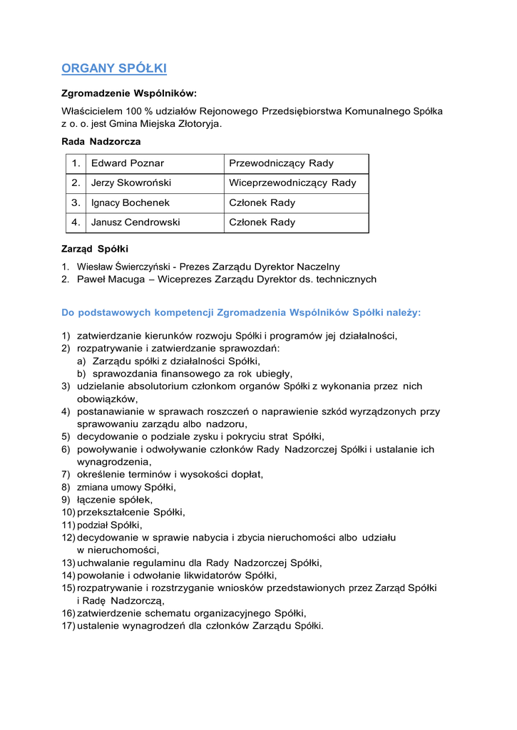 ORGANY SPÓŁKI Zgromadzenie Wspólników: Właścicielem 100 % udziałów Rejonowego Przedsiębiorstwa Komunalnego Spółka z o. o. jest Gmina Miejska Złotoryja. Rada Nadzorcza 1. Edward Poznar Przewodniczący Rady 2. Jerzy Skowroński Wiceprzewodniczący Rady 3. Ignacy Bochenek Członek Rady 4. Janusz Cendrowski Członek Rady Zarząd Spółki 1. Wiesław Świerczyński - Prezes Zarządu Dyrektor Naczelny 2. Paweł Macuga – Wiceprezes Zarządu Dyrektor ds. technicznych Do podstawowych kompetencji Zgromadzenia Wspólników Spółki należy: 1) zatwierdzanie kierunków rozwoju Spółki i programów jej działalności, 2) rozpatrywanie i zatwierdzanie sprawozdań: a) Zarządu spółki z działalności Spółki, b) sprawozdania finansowego za rok ubiegły, 3) udzielanie absolutorium członkom organów Spółki z wykonania przez nich obowiązków, 4) postanawianie w sprawach roszczeń o naprawienie szkód wyrządzonych przy sprawowaniu zarządu albo nadzoru, 5) decydowanie o podziale zysku i pokryciu strat Spółki, 6) powoływanie i odwoływanie członków Rady Nadzorczej Spółki i ustalanie ich wynagrodzenia, 7) określenie terminów i wysokości dopłat, 8) zmiana umowy Spółki, 9) łączenie spółek, 10) przekształcenie Spółki, 11) podział Spółki, 12) decydowanie w sprawie nabycia i zbycia nieruchomości albo udziału w nieruchomości, 13) uchwalanie regulaminu dla Rady Nadzorczej Spółki, 14) powołanie i odwołanie likwidatorów Spółki, 15) rozpatrywanie i rozstrzyganie wniosków przedstawionych przez Zarząd Spółki i Radę Nadzorczą, 16) zatwierdzenie schematu organizacyjnego Spółki, 17) ustalenie wynagrodzeń dla członków Zarządu Spółki. Do podstawowych kompetencji Rady Nadzorczej należy: 1) sprawowanie stałego nadzoru nad działalnością Spółki, 2) kontrola i ocena sprawozdań Zarządu Spółki z działalności Spółki oraz sprawozdań finansowych, 3) badanie dokumentów Spółki, 4) dokonywanie rewizji stanu majątku Spółki, 5) zatwierdzanie rocznych planów rzeczowo - finansowych działalności Spółki, 6) składanie dorocznego sprawozdania pisemnego Zgromadzeniu Wspólników z wyników oceny działalności Spółki, 7) zawieszanie w pełnieniu funkcji członków Zarządu, 8) sprawowanie stałego nadzoru i kontroli nad działalnością Spółki, związaną z prowadzeniem jej przedsiębiorstwa, 9) rozpatrywanie sporów pomiędzy Spółką, a członkami Zarządu i reprezentowanie Spółki w tych s porach, 10) reprezentowanie Spółki w czynnościach prawnych pomiędzy Spółką, a członkami Zarządu Spółki, w tym związanych ze stosunkiem pracy, 11) delegowanie członka lub członków Rady Nadzorczej do czasowego wykonywania czynności członków Zarządu, nie mogących sprawować swych czynności, przy czym na czas delegacji zawieszeniu ulegają prawa członka Rady Nadzorczej, 12) zatwierdzanie regulaminu Zarządu w przypadku powołania zarządu wieloosobowego, coroczne ustalanie kwoty, do wysokości której Zarząd może zaciągnąć zobowiązania i rozporządzać majątkiem Spółki bez uprzedniej uchwały Rady Nadzorczej, 13) wybór firmy audytorskiej badającej sprawozdanie finansowe Spółki, 14) zatwierdzanie Regulaminu Organizacyjnego Spółki, 15) powoływanie i odwoływanie członków Zarząd Spółki, 16) wnioskowanie do Zgromadzenia Wspólników wynagrodzenia dla członków Zarządu Spółki. Do zakresu działania Zarządu należą sprawy nie zastrzeżone dla Zgromadzenia Wspólników i Rady Nadzorczej, a w szczególności: 1) zgłaszanie sądowi rejestrowemu wszelkich zmian danych podlegających rejestracji, 2) prowadzenie księgi udziałów na zasadach i w trybie określonych przepisami kodeksu spółek handlowych, 3) składanie sądowi rejestrowemu listy wspólników po każdym wpisaniu do księgi udziałów zmiany dotyczącej osób wspólników i przysługujących im udziałów, 4) przygotowanie sprawozdania z działalności Zarządu Spółki i sprawozdania finansowego, 5) zwoływanie Zgromadzenia Wspólników.