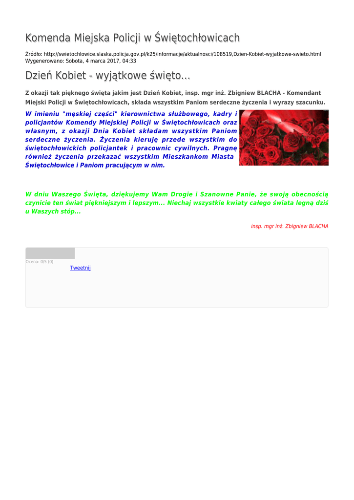 Komenda Miejska Policji w Świętochłowicach Źródło: http://swietochlowice.slaska.policja.gov.pl/k25/informacje/aktualnosci/108519,Dzien-Kobiet-wyjatkowe-swieto.html Wygenerowano: Sobota, 4 marca 2017, 04:33 Dzień Kobiet - wyjątkowe święto… Z okazji tak pięknego święta jakim jest Dzień Kobiet, insp. mgr inż. Zbigniew BLACHA - Komendant Miejski Policji w Świętochłowicach, składa wszystkim Paniom serdeczne życzenia i wyrazy szacunku. W imieniu "męskiej części" kierownictwa służbowego, kadry i policjantów Komendy Miejskiej Policji w Świętochłowicach oraz własnym, z okazji Dnia Kobiet składam wszystkim Paniom serdeczne życzenia. Życzenia kieruję przede wszystkim do świętochłowickich policjantek i pracownic cywilnych. Pragnę również życzenia przekazać wszystkim Mieszkankom Miasta Świętochłowice i Paniom pracującym w nim. W dniu Waszego Święta, dziękujemy Wam Drogie i Szanowne Panie, że swoją obecnością czynicie ten świat piękniejszym i lepszym... Niechaj wszystkie kwiaty całego świata legną dziś u Waszych stóp... insp. mgr inż. Zbigniew BLACHA Ocena: 0/5 (0) Tweetnij