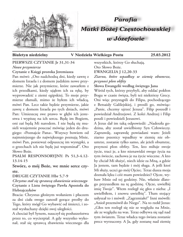 Parafia Matki Bożej Częstochowskiej w Józefowie Biuletyn niedzielny V Niedziela Wielkiego Postu PIERWSZE CZYTANIE Jr 31,31-34 Nowe przymierze Czytanie z Księgi proroka Jeremiasza Pan mówi: „Oto nadchodzą dni, kiedy zawrę z domem Izraela i z domem judzkim nowe przymierze. Nie jak przymierze, które zawarłem z ich przodkami, kiedy ująłem ich za rękę, by wyprowadzić z ziemi egipskiej. To moje przymierze złamali, mimo że byłem ich władcą, mówi Pan. Lecz takie będzie przymierze, jakie zawrę z domem Izraela po tych dniach, mówi Pan: Umieszczę swe prawo w głębi ich jestestwa i wypiszę na ich sercu. Będę im Bogiem, oni zaś będą Mi narodem. I nie będą się musieli wzajemnie pouczać mówiąc jeden do drugiego: «Poznajcie Pana». Wszyscy bowiem od najmniejszego do największego poznają Mnie, mówi Pan, ponieważ odpuszczę im występki, a o grzechach ich nie będę już wspominał”. Oto Słowo Boże. PSALM RESPONSORYJNY: Ps 51,3-4.1213.14-15 Stwórz, o mój Boże, we mnie serce czyste. DRUGIE CZYTANIE Hbr 5,7-9 Chrystus stał się sprawcą zbawienia wiecznego Czytanie z Listu świętego Pawła Apostoła do Hebrajczyków Bracia: Chrystus głośnym wołaniem i płaczem za dni ciała swego zanosił gorące prośby do Tego, który mógł Go wybawić od śmierci, i został wysłuchany dzięki swej uległości. A chociaż był Synem, nauczył się posłuszeństwa przez to, co wycierpiał. A gdy wszystko wykonał, stał się sprawcą zbawienia wiecznego dla 25.03.2012 wszystkich, którzy Go słuchają. Oto Słowo Boże. EWANGELIA J 12,20-33 Ziarno, które wpadłszy w ziemię obumrze, przynosi plon obfity Słowa Ewangelii według świętego Jana Wśród tych, którzy przybyli, aby oddać pokłon Bogu w czasie święta, byli też niektórzy Grecy. Oni więc przystąpili do Filipa, pochodzącego z Betsaidy Galilejskiej, i prosili go, mówiąc: „Panie, chcemy ujrzeć Jezusa”. Filip poszedł i powiedział Andrzejowi. Z kolei Andrzej i Filip poszli i powiedzieli Jezusowi. A Jezus dał im taką odpowiedź: „Nadeszła godzina, aby został uwielbiony Syn Człowieczy. Zaprawdę, zaprawdę powiadani wam: Jeżeli ziarno pszenicy wpadłszy w ziemię nie obumrze, zostanie tylko samo, ale jeżeli obumrze, przynosi plon obfity. Ten, kto miłuje swoje życie, traci je, a kto nienawidzi swego życia na tym świecie, zachowa je na życie wieczne. A kto by chciał Mi służyć, niech idzie za Mną, a gdzie Ja jestem, tam będzie i mój sługa. A jeśli ktoś Mi służy, uczci go mój Ojciec. Teraz dusza moja doznała lęku i cóż mam powiedzieć? Ojcze, wybaw Mnie od tej godziny. Nie, właśnie dlatego przyszedłem na tę godzinę. Ojcze, uwielbij imię Twoje”. Wtem rozległ się głos z nieba: „I uwielbiłem, i znowu uwielbię”. Tłum stojący usłyszał to i mówił: „Zagrzmiało!” Inni mówili: „Anioł przemówił do Niego”. Na to rzekł Jezus: „Głos ten rozległ się nie ze względu na Mnie, ale ze względu na was. Teraz odbywa się sąd nad tym światem. Teraz władca tego świata zostanie precz wyrzucony. A Ja, gdy zostanę nad ziemię wywyższony, przyciągnę wszystkich do siebie”. To powiedział zaznaczając, jaką śmiercią miał umrzeć. Oto słowo Pańskie. 26 III Poniedziałek. Zwiastowanie Pańskie – Uroczystość. Iz 7,10-14; Ps 40,7-8a.8b10.11; Hbr 10,4-10; J 1,14ab; Łk 1,26-38;27 III Wtorek. Dzień powszedni. Lb 21,4-9; Ps 102,2-3.16-18.19-21; J 8,21-30; 28 III Środa. Dzień powszedni. Dn 3, 14-20.91-92.95; Dn 3,52.53-54.55-56; J 3,16; J 8,31-42; 29 III Czwartek. Dzień powszedni. Rdz 17,3-9; Ps 105,4-5.6-7.8-9; Ps 95,8ab; J 8,51-59; 30 III Piątek. Dzień powszedni. Jr 20,10-13; Ps 18,2a-3.4-6a.7; J 6,63b.68b; J 10,31-42; 31 III Sobota. Dzień powszedni. 1 IV Niedziela Palmowa. Szósta Niedziela Wielkiego Postu. Mk 11,1-10 lub J 12,12-16; Iz 50,4-7; Ps 22,89.17-18a.19-20.23-24; Flp 2,6-11; Flp 2,8-9; Mk 14,1-15,47 lub Mk 15, 1-39. OGŁOSZENIA DUSZPASTERSKIE Niedziela 25.3. – 5 Niedziela Wielkiego Postu 7.00 + Michała Kobylińskiego (Gr. 25) 8.30 + Irenę Markieta (24 r. śm.) i Cr. Markietów. 10.00 + Agnieszkę i Stanisława Grzegrzółków. 11.30 + Leszka Komara (3 r. śm.), Jana i Barbarę Strockich, Janinę i Władysława Malarczyków. 13.00 Za Parafian. 15.00 Msza wg mszału Jana XXIII Dz. w 36 r. urodzin Janiny Zaniewicz z prośbą o dalsze łaski i bł. Boże. 18.00 + Aniele i Kazimierza Janczewskich, Juliannę i Adama Wagów. 20.00 + Janinę, Czesławę, Bolesława i Stefana Kruczów. Poniedziałek 26.3. – ZWIASTOWANIE PAŃSKIE 6.30 + Mieczysławę Kowalczyk (1 r. śm.) 6.30 7.00 + Michała Kobylińskiego (Gr. 26) 7.00 + Eugeniusza Bogowicza (1 r. śm.) 7.00 + Marię Plich 8.30 + Czesława Chojnackiego (r. śm.) 18.00 + Józefa Siewruka (10 r. śm.) Wtorek 27.3. 6.30 + Janinę Kaczorek (ur.) 6.30 7.00 + Michała Kobylińskiego (Gr. 27) 7.00 + Leokadię i Romana Kwiatkowskich oraz ich rodziców. 7.00 + Genowefę Bergiel (12 r. śm.) 8.30 + Annę i Stanisława Karendysów oraz ich rodziców. 18.00 + Anielę, Józefa, Gerarda, Antoniego Szpedzików. Środa 28.3. 6.30 7.00 + Michała Kobylińskiego (Gr. 28) 7.00 + Barbarę Zowczak (4 r. śm.), Ryszarda Zowczaka. 7.00 + Adama i Bolesławę (13 r. śm.) Konrackich, Stefanię i Kontentego Sitków. 8.30 18.00 Nowenna do MB Nieustającej Pomocy Dz.-bł. w 60 r. urodzin Danuty i w 12 r. urodzin Marcela z prośbą o bł. Boże i opiekę MB. Dz.-bł. w 18 r. urodzin Dominika Wójcika z prośbą o opiekę Bożą i światło Ducha Św. + Leonarda Gawłowskiego (14 r. śm.), jego rodziców Walerię i Stanisława oraz Bronisławę Jaroszewicz, Antoninę i Franciszka. + Alinę Kościelną (1 r. śm.). + Aleksandra Cicheckiego (5 r. śm.) i Jolantę Mitek. + Apolinarego Rudnickiego (mies. po pog.) Czwartek 29.3. 6.30 7.00 + Michała Kobylińskiego (Gr. 29) 7.00 + Tomasza Witkowskiego. 7.00 8.30 + Tadeusza Mielniczuka (mies. po pog.) 18.00 + Józefa i Cr. Kondysów. Piątek 30.3. 6.30 7.00 + M
