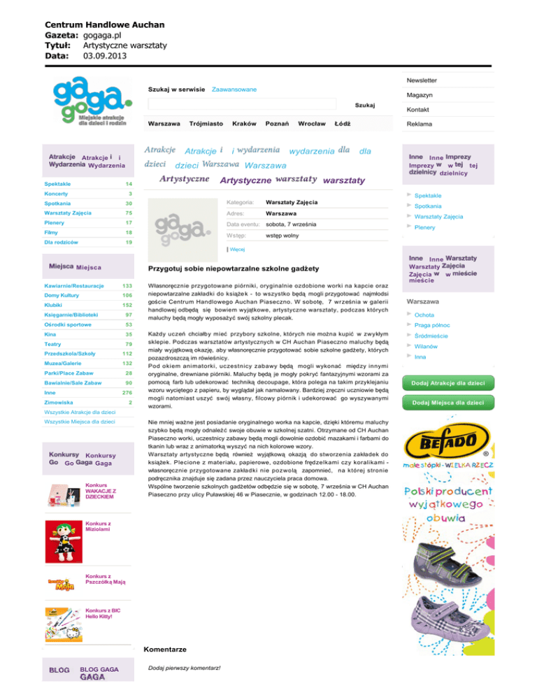 Centrum Handlowe Auchan Gazeta: gogaga.pl Tytu³: Artystyczne warsztaty Data: 03.09.2013 Newsletter Szukaj w serwisie Zaawansowane Magazyn Szukaj Trójmiasto Warszawa Atrakcje Atrakcje i Wydarzenia Spektakle Kraków Poznań i dzieci Wrocław wydarzenia Reklama dla Inne Imprezy w tej dzielnicy Warszawa Artystyczne 14 Łódź Koncerty 3 Spotkania 30 Kategoria: Warsztaty Zajęcia Warsztaty Zajęcia 75 Adres: Warszawa Plenery 17 Data eventu: sobota, 7 września Filmy 18 Dla rodziców 19 Kontakt warsztaty Spektakle Wstęp: Spotkania Warsztaty Zajęcia Plenery wstęp wolny | Więcej Miejsca Przygotuj sobie niepowtarzalne szkolne gadżety Kawiarnie/Restauracje 133 Domy Kultury 106 Klubiki 152 Księgarnie/Biblioteki 97 Ośrodki sportowe 53 Kina 35 Teatry 79 Przedszkola/Szkoły 112 Muzea/Galerie 132 Parki/Place Zabaw 90 276 Zimowiska 2 Wszystkie Atrakcje dla dzieci Wszystkie Miejsca dla dzieci Go Warszawa Ochota Praga północ Każdy uczeń chciałby mieć przybory szkolne, których nie można kupić w zwykłym sklepie. Podczas warsztatów artystycznych w CH Auchan Piaseczno maluchy będą miały wyjątkową okazję, aby własnoręcznie przygotować sobie szkolne gadżety, których pozazdroszczą im rówieśnicy. Pod okiem animatorki, uczestnicy zabawy będą mogli wykonać między innymi oryginalne, drewniane piórniki. Maluchy będą je mogły pokryć fantazyjnymi wzorami za pomocą farb lub udekorować techniką decoupage, która polega na takim przyklejaniu wzoru wyciętego z papieru, by wyglądał jak namalowany. Bardziej zręczni uczniowie będą mogli natomiast uszyć swój własny, filcowy piórnik i udekorować go wyszywanymi wzorami. 28 Bawialnie/Sale Zabaw Inne Własnoręcznie przygotowane piórniki, oryginalnie ozdobione worki na kapcie oraz niepowtarzalne zakładki do książe k - to wszystko będą mogli przygotować najmłodsi goście Centrum Handlowego Auchan Piaseczno. W sobotę, 7 września w galerii handlowej odbędą się bowiem wyjątkowe, artystyczne warsztaty, podczas których maluchy będą mogły wyposażyć swój szkolny plecak. Inne Warsztaty Zajęcia w mieście Nie mniej ważne jest posiadanie oryginalnego worka na kapcie, dzięki któremu maluchy szybko będą mogły odnaleźć swoje obuwie w szkolnej szatni. Otrzymane od CH Auchan Piaseczno worki, uczestnicy zabawy będą mogli dowolnie ozdobić mazakami i farbami do tkanin lub wraz z animatorką wyszyć na nich kolorowe wzory. Warsztaty artystyczne będą również wyjątkową okazją do stworzenia zakładek do książek. Plecione z materiału, papierowe, ozdobione frędzelkami czy koralikami własnoręcznie przygotowane zakładki nie pozwolą zapomnieć, na której stronie podręcznika znajduje się zadana przez nauczyciela praca domowa. Wspólne tworzenie szkolnych gadżetów odbędzie się w sobotę, 7 września w CH Auchan Piaseczno przy ulicy Puławskiej 46 w Piasecznie, w godzinach 12.00 - 18.00. Konkursy Gaga Konkurs WAKACJE Z DZIECKIEM Konkurs z Miziolami Konkurs z Pszczółką Mają Konkurs z BIC Hello Kitty! Komentarze Dodaj pierwszy komentarz! BLOG GAGA Śródmieście Wilanów Inna Dodaj Atrakcje dla dzieci Dodaj Miejsca dla dzieci Centrum Handlowe Auchan Gazeta: gogaga.pl Tytu³: Artystyczne warsztaty Data: 03.09.2013 p iątek, 30 sierpnia 2013 Dodaj komentarz Lekcje TREŚĆ TWÓJ NICK: programowania już od KOMENTARZA: września w polskich 5 szkołachOd nowego roku szkolnego rusza ... czwartek, 6 22 sierpnia 2013 Eko kredki BIC najlepszy prezent Przepisz kod z obrazka dla kreatywnego dzieckaKolorowanie kredkami z serii e... DODAJ Polecane i Patronackie RODZINKA W KOMPLECIE miejsca Atrakcje w mieście i Twoim GoGaga.pl Magazyn Gaga O nas Warszawa Trójmiasto Reklama Kraków Poznań Newsletter Wrocław Łódź Kontakt Magazyn Gaga Archiwum Gaga Prenumerata Valkea Media (c) Atrakcje Imprezy dla Dzieci, Wydarzenia, Miejsca 2010 Go Gaga