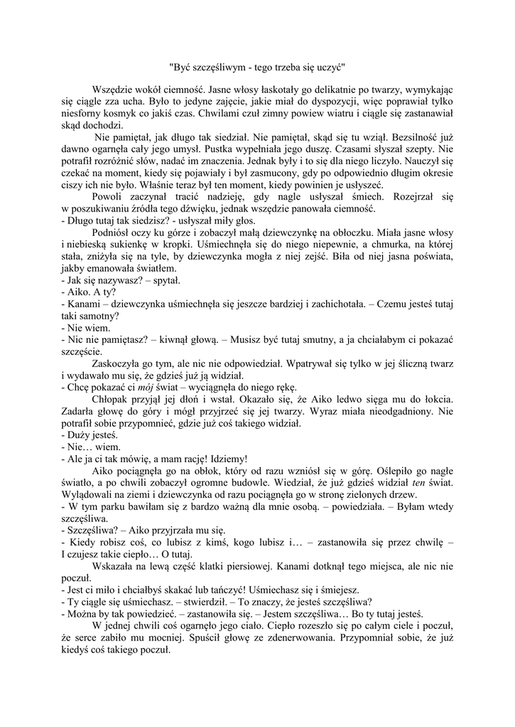"Być szczęśliwym - tego trzeba się uczyć" Wszędzie wokół ciemność. Jasne włosy łaskotały go delikatnie po twarzy, wymykając się ciągle zza ucha. Było to jedyne zajęcie, jakie miał do dyspozycji, więc poprawiał tylko niesforny kosmyk co jakiś czas. Chwilami czuł zimny powiew wiatru i ciągle się zastanawiał skąd dochodzi. Nie pamiętał, jak długo tak siedział. Nie pamiętał, skąd się tu wziął. Bezsilność już dawno ogarnęła cały jego umysł. Pustka wypełniała jego duszę. Czasami słyszał szepty. Nie potrafił rozróżnić słów, nadać im znaczenia. Jednak były i to się dla niego liczyło. Nauczył się czekać na moment, kiedy się pojawiały i był zasmucony, gdy po odpowiednio długim okresie ciszy ich nie było. Właśnie teraz był ten moment, kiedy powinien je usłyszeć. Powoli zaczynał tracić nadzieję, gdy nagle usłyszał śmiech. Rozejrzał się w poszukiwaniu źródła tego dźwięku, jednak wszędzie panowała ciemność. - Długo tutaj tak siedzisz? - usłyszał miły głos. Podniósł oczy ku górze i zobaczył małą dziewczynkę na obłoczku. Miała jasne włosy i niebieską sukienkę w kropki. Uśmiechnęła się do niego niepewnie, a chmurka, na której stała, zniżyła się na tyle, by dziewczynka mogła z niej zejść. Biła od niej jasna poświata, jakby emanowała światłem. - Jak się nazywasz? – spytał. - Aiko. A ty? - Kanami – dziewczynka uśmiechnęła się jeszcze bardziej i zachichotała. – Czemu jesteś tutaj taki samotny? - Nie wiem. - Nic nie pamiętasz? – kiwnął głową. – Musisz być tutaj smutny, a ja chciałabym ci pokazać szczęście. Zaskoczyła go tym, ale nic nie odpowiedział. Wpatrywał się tylko w jej śliczną twarz i wydawało mu się, że gdzieś już ją widział. - Chcę pokazać ci mój świat – wyciągnęła do niego rękę. Chłopak przyjął jej dłoń i wstał. Okazało się, że Aiko ledwo sięga mu do łokcia. Zadarła głowę do góry i mógł przyjrzeć się jej twarzy. Wyraz miała nieodgadniony. Nie potrafił sobie przypomnieć, gdzie już coś takiego widział. - Duży jesteś. - Nie… wiem. - Ale ja ci tak mówię, a mam rację! Idziemy! Aiko pociągnęła go na obłok, który od razu wzniósł się w górę. Oślepiło go nagłe światło, a po chwili zobaczył ogromne budowle. Wiedział, że już gdzieś widział ten świat. Wylądowali na ziemi i dziewczynka od razu pociągnęła go w stronę zielonych drzew. - W tym parku bawiłam się z bardzo ważną dla mnie osobą. – powiedziała. – Byłam wtedy szczęśliwa. - Szczęśliwa? – Aiko przyjrzała mu się. - Kiedy robisz coś, co lubisz z kimś, kogo lubisz i… – zastanowiła się przez chwilę – I czujesz takie ciepło… O tutaj. Wskazała na lewą część klatki piersiowej. Kanami dotknął tego miejsca, ale nic nie poczuł. - Jest ci miło i chciałbyś skakać lub tańczyć! Uśmiechasz się i śmiejesz. - Ty ciągle się uśmiechasz. – stwierdził. – To znaczy, że jesteś szczęśliwa? - Można by tak powiedzieć. – zastanowiła się. – Jestem szczęśliwa… Bo ty tutaj jesteś. W jednej chwili coś ogarnęło jego ciało. Ciepło rozeszło się po całym ciele i poczuł, że serce zabiło mu mocniej. Spuścił głowę ze zdenerwowania. Przypomniał sobie, że już kiedyś coś takiego poczuł. - Teraz już rozumiesz? – usłyszał cichy szept Aiko. - Chyba… Tak. - Chodźmy dalej! Dziewczynka złapała go za rękę i pociągnęła wzdłuż parku. Pokazywała mu najpierw wielki plac zabaw, wystawy sklepowe z ogromnymi, czekoladowymi tortami, pluszowymi misiami i różowymi spinkami do włosów. - Zobacz! – wskazała wsuwkę w kształcie serduszek, którą miała wpiętą we włosy. – Dostałam ją od braciszka, jak byłam mała. Jeszcze nigdy nie zapomniałam jej ubrać. - Jesteś szczęśliwa, kiedy jesteś przy nim? Dziewczynka zaśmiała się, a po jej policzku spłynęła łza. Zdezorientowało go to, jednak nic nie powiedział. - Zawsze. Kontynuowali dalej wędrówkę przez jej świat, który wydawał mu się znajomy i jakby należał też do niego. Nagle Aiko zatrzymała się przed ogromnym szarym, budynkiem. - Co to? – spytał Kanami. - Szpital. Tutaj pomaga się chorym. – odparła i mocniej ścisnęła jego dłoń. – Jednak nie zawsze się da… - Twój brat tam jest? – przytaknęła. Gdy na nią spojrzał, wydawała się jeszcze bardziej delikatna i mała – Na pewno do ciebie wróci! - Obiecujesz?! – krzyknęła Aiko i pociągnęła go za rękę. - Nie mógłby przecież zostawić takiej siostry – uśmiechnął się. Po raz pierwszy. Aiko zaświeciły się oczy, z których od razu starła łzy. Wyszeptała jego imię i przytuliła się do niego. Znów poczuł, jak fala ciepła zalewa jego ciało. Dziewczynka pożegnała się z nim, obiecując, że na pewno przyjdzie. Kanami patrzył za nią i pomyślał: „Gdy wrócisz, będę szczęśliwy." *** Mała dziewczynka siedziała na krześle przy łóżku, ściskając mocno dłoń chłopca. Już dawno przyzwyczaiła się do pikania urządzeń w pomieszczeniu. Przychodziła tutaj niemal codziennie. Wpatrywała się w bladą twarz chłopca i co jakiś czas dotykała wsuwki, którą miała wpiętą we włosy. Do pomieszczenia weszła kobieta, która od razu stanęła po drugiej stronie łóżka. Miała czerwoną twarz od płaczu, a w ręce trzymała plik dokumentów. - Braciszek się obudzi, prawda mamusiu? - spytała dziewczynka. Kobieta potrzebowała dłuższej chwili, żeby odpowiedzieć spokojnym głosem na pytanie córki. - Oczywiście, Aiko. Nie zostawiłby cię. - Na ostatniej sylabie głos jej się lekko załamał. Wybiegła z pokoju i dziewczynka znów została sama. Poprawiła niesforny kosmyk włosów, który znów pojawił się na twarzy chłopca. Chciała oprzeć głowę na pościeli, gdy nagle poczuła drgnięcie ręki chłopca, którą trzymała. Łzy spłynęły po jej policzkach, jednak uśmie