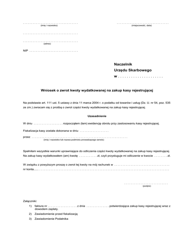 .................................. ................................ (imię i nazwisko) (miejscowość, data) .................................. .................................. (adres) NIP . . . . . . . . . . . . . . . . . . . . . . . . . . . . . . Naczelnik Urzędu Skarbowego w..................... Wniosek o zwrot kwoty wydatkowanej na zakup kasy rejestrującej Na podstawie art. 111 ust. 5 ustawy z dnia 11 marca 2004 r. o podatku od towarów i usług (Dz. U. nr 54, poz. 535 ze zm.) zwracam się z prośbą o zwrot części kwoty wydatkowanej na zakup kasy rejestrującej. Uzasadnienie W dniu . . . . . . . . . . . . . . . . . . rozpocząłem (łam) ewidencję obrotu przy zastosowaniu kasy rejestrującej. Fiskalizacja kasy została dokonana w dniu . . . . . . . . . . . . . . . . . . przez . . . . . . . . . . . . . . . . . . . . . . . . . . . . . . . . . . . . . . . . . . . . . . . . . . . . . . . . . . . (imię i nazwisko lub nazwa podmiotu prowadzącego serwis) Spełniłam wszystkie warunki uprawniające do odliczenia części kwoty wydatkowanej na zakup kasy rejestrującej. Na zakup kasy wydatkowałem (am) kwotę . . . . . . . . . . . zł, czyli przysługuje mi odliczenie w kwocie . . . . . . . . zł. W związku z powyższym proszę o zwrot tej kwoty na mój rachunek w . . . . . . . . . . . . . . . . . . . . . . . . . . . . . . . . . . nr konta...... . . . . . . . . . . . . . . . . . . . . . . . . . . . . . . . . . . . . . . . . . . . . . . . . . . . . . . . . . . . . . . . . . . . . . . . . . . . . . . . . ........................... (podpis) Załączniki: 1) faktura nr . . . . . . . . . . . . . . . . . . z dnia . . . . . . . . . . . . . . potwierdzająca zakup kasy rejestrującej wraz z dowodem zapłaty. 2) Zawiadomienie przed fiskalizacją 3) Zawiadomienie Podatnika