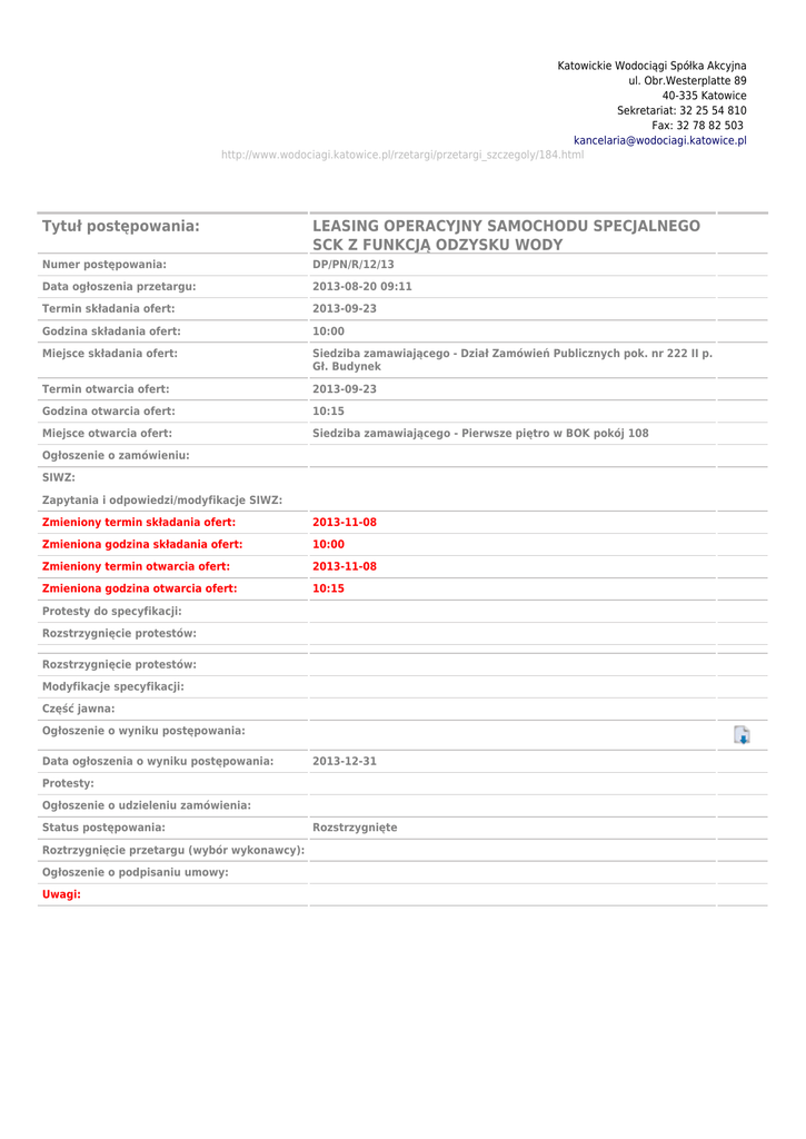 Katowickie Wodociągi Spółka Akcyjna ul. Obr.Westerplatte 89 40-335 Katowice Sekretariat: 32 25 54 810 Fax: 32 78 82 503 [email protected] http://www.wodociagi.katowice.pl/rzetargi/przetargi_szczegoly/184.html Temat Zawartość Tytuł postępowania: LEASING OPERACYJNY SAMOCHODU SPECJALNEGO SCK Z FUNKCJĄ ODZYSKU WODY Numer postępowania: DP/PN/R/12/13 Data ogłoszenia przetargu: 2013-08-20 09:11 Termin składania ofert: 2013-09-23 Godzina składania ofert: 10:00 Miejsce składania ofert: Siedziba zamawiającego - Dział Zamówień Publicznych pok. nr 222 II p. Gł. Budynek Termin otwarcia ofert: 2013-09-23 Godzina otwarcia ofert: 10:15 Miejsce otwarcia ofert: Siedziba zamawiającego - Pierwsze piętro w BOK pokój 108 Ogłoszenie o zamówieniu: SIWZ: Zapytania i odpowiedzi/modyfikacje SIWZ: Zmieniony termin składania ofert: 2013-11-08 Zmieniona godzina składania ofert: 10:00 Zmieniony termin otwarcia ofert: 2013-11-08 Zmieniona godzina otwarcia ofert: 10:15 Protesty do specyfikacji: Rozstrzygnięcie protestów: Rozstrzygnięcie protestów: Modyfikacje specyfikacji: Część jawna: Ogłoszenie o wyniku postępowania: Data ogłoszenia o wyniku postępowania: 2013-12-31 Protesty: Ogłoszenie o udzieleniu zamówienia: Status postępowania: Roztrzygnięcie przetargu (wybór wykonawcy): Ogłoszenie o podpisaniu umowy: Uwagi: Rozstrzygnięte Pobierz