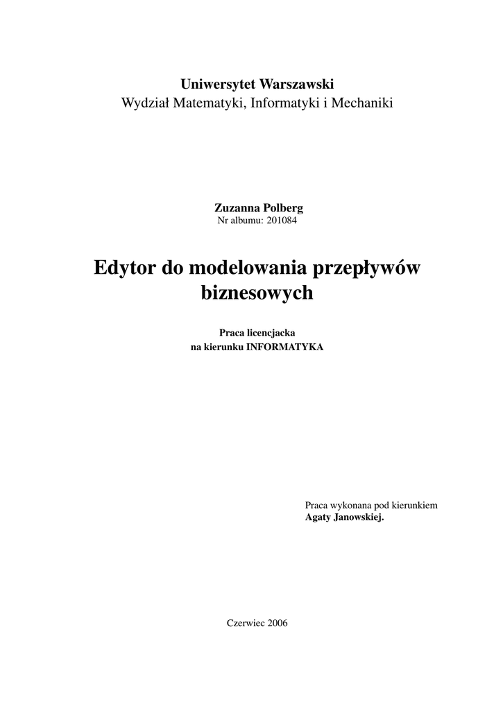 Uniwersytet Warszawski Wydział Matematyki, Informatyki i Mechaniki Zuzanna Polberg Nr albumu: 201084 Edytor do modelowania przepływów biznesowych Praca licencjacka na kierunku INFORMATYKA Praca wykonana pod kierunkiem Agaty Janowskiej. Czerwiec 2006 Oświadczenie kierujacego ˛ praca˛ Potwierdzam, że niniejsza praca została przygotowana pod moim kierunkiem i kwalifikuje si˛e do przedstawienia jej w post˛epowaniu o nadanie tytułu zawodowego. Data Podpis kierujacego ˛ praca˛ Oświadczenie autora (autorów) pracy Świadom odpowiedzialności prawnej oświadczam, że niniejsza praca dyplomowa została napisana przeze mnie samodzielnie i nie zawiera treści uzyskanych w sposób niezgodny z obowiazuj ˛ acymi ˛ przepisami. Oświadczam również, że przedstawiona praca nie była wcześniej przedmiotem procedur zwiazanych ˛ z uzyskaniem tytułu zawodowego w wyższej uczelni. Oświadczam ponadto, że niniejsza wersja pracy jest identyczna z załaczon ˛ a˛ wersja˛ elektroniczna.˛ Data Podpis autora (autorów) pracy Streszczenie Pierwsza cz˛eść zawiera ogólny opis stworzonego produktu. Druga˛ cz˛eść stanowi mój wkład pracy w powstanie aplikacji. Prac˛e nad produktem podzieliłam na trzy cz˛eści. Pierwsza z nich opisuje przeglad ˛ i analiz˛e dost˛epnych narz˛edzi do tworzenia edytorów w środowisku Eclipse. Druga to wybór odpowiedniego narz˛edzia oraz opis cz˛eści implementacji napisanej przeze mnie. W końcu ostatnia cz˛eść opisuje stworzone przeze mnie dokumenty oraz prezentacje. Słowa kluczowe przepływ biznesowy Dziedzina pracy (kody wg programu Socrates-Erasmus) 11.3 Informatyka Klasyfikacja tematyczna D.2.11 Software Architectures J.1 Administrative data processing Tytuł pracy w j˛ezyku angielskim Business process data flow application. Spis treści 1. Wprowadzenie . . . . . . . . . . . . . . . . . . . . . . . . . . . . . . . . . . . . . . . . 5 2. Podstawowe poj˛ecia . . . . . . . . . . . . . . . . . . . . . . . . . . . . . . . . . . . . . 2.1. Definicje . . . . . . . . . . . . . . . . . . . . . . . . . . . . . . . . . . . . . . . . . 2.2. Modelowanie przepływów biznesowych . . . . . . . . . . . . . . . . . . . . . . . . 7 7 7 3. Inne sposoby realizacji obsługi przepływów biznesowych . . . . . . . . . . . . . . . . 9 3.1. Opis werbalny . . . . . . . . . . . . . . . . . . . . . . . . . . . . . . . . . . . . . . 9 3.2. Opis tekstowy . . . . . . . . . . . . . . . . . . . . . . . . . . . . . . . . . . . . . . 9 3.3. R˛eczne modelowanie przepływów biznesowych . . . . . . . . . . . . . . . . . . . . 9 3.4. Realizacja modelowania przepływów biznesowych przez wyspecjalizowane w tej dziedzinie firmy . . . . . . . . . . . . . . . . . . . . . . . . . . . . . . . . . . . . . . . . . . . 9 3.5. Inne narz˛edzia informatyczne do modelowania przepływów biznesowych . . . . . . 10 4. Opis produktu . . . . . . . . . . . . . . . . . . . . . . . . . . . . . . . . . . . . . . . . 11 5. Dokumentacja użytkowa i opis implementacji . . . . . . . . . . . . . . . . . . . . . . . 13 6. Podsumowanie . . . . . . . . . . . . . . . . . . . . . . . . . . . . . . . . . . . . . . . . 15 7. Wkład w powstanie aplikacji . . . . . . . . . . . . 7.1. Wprowadzenie . . . . . . . . . . . . . . . . . 7.2. Dokumenty i prezentacje . . . . . . . . . . . . 7.3. Analiza możliwych rozwiazań ˛ . . . . . . . . . 7.4. Implementacja . . . . . . . . . . . . . . . . . . 7.4.1. Pakiet figures poza klasa˛ HeadingFigure 7.4.2. Magazyny . . . . . . . . . . . . . . . . 17 17 17 18 18 18 18 3 . . . . . . . . . . . . . . . . . . . . . . . . . . . . . . . . . . . . . . . . . . . . . . . . . . . . . . . . . . . . . . . . . . . . . . . . . . . . . . . . . . . . . . . . . . . . . . . . . . . . . . . . . . . . . . . . . . . . . . . . . . . . . . . . . . . . . . . . . . . . Rozdział 1 Wprowadzenie Edytor do modelowania przepływów biznesowych jest narz˛edziem usprawniajacym ˛ prac˛e firm oraz innych jednostek, dla których można zdefiniować jakiekolwiek zależności pomi˛edzy ich poszczególnymi elementami. System ’Process Data Flow’ pomaga znaleźć i sprecyzować te zależności. Pozwala na zdefiniowanie zadań oraz ich kosztów i na tej podstawie analizuje działalność firmy pod wybranymi przez użytkownika aspektami. Pierwsza cz˛eść pracy składa si˛e z sześciu rozdziałów. Pierwszy rozdział stanowi krótkie wprowadzenie doprzedstawionego tematu. W rozdziale 2. zdefiniowano podstawowe poj˛ecia zwiazane ˛ z modelowaniem przepływów biznesowych oraz z systemem ’Process Data Flow’. Rozdział 3. przedstawia inne, konkurencyjne dla naszego, sposoby modelowania przepływów biznesowych. W rozdziale 4. znajduje si˛e krótki opis stworzonego przez nas produktu, natomiast w kolejnym rozdziale opisana jest dost˛epna dla niego dokumentacja użytkowa. Ostatni rozdział zawiera przemyślenia dotyczace ˛ korzyści, jakie może przynieść stosowanie naszego produktu oraz sposobów, w jakie można go dalej rozszerzać. 5 Rozdział 2 Podstawowe poj˛ecia Podstawowym poj˛eciem z dziedziny modelowania i analizy przepływów biznesowych jest bez watpienia ˛ PRZEPŁYW BIZNESOWY. PRZEPŁYW BIZNESOWY jest to zbiór przepływów danych pomi˛edzy parami elementów modelowanej jednostki. Jest to zbiór wzajemnie powiazanych ˛ elementarnych procesów zachodzacych ˛ w danej jednostce. Zbiór ten jest realizowany w celu osiagni˛ ˛ ecia pewnego celu biznesowego. Podczas realizacji przepływu biznesowego zadania lub informacje sa˛ przesyłane od jednego uczestnika do kolejnego zgodnie z właściwymi dla danej jedostki regułami post˛epowania. 2.1. Definicje • PDF (Process Data Flow) niniejszy projekt, narz˛edzie do generowania i analizowania przepływów danych. • JPEG (Joint Process Experts Group) zespół realizujacy ˛ ten projekt w składzie (Zuzanna Polberg, Joanna Zych, Paweł Maćkowski, Mikołaj Moszczyński). 2.2. Modelowanie przepływów biznesowych Modelowanie przepł