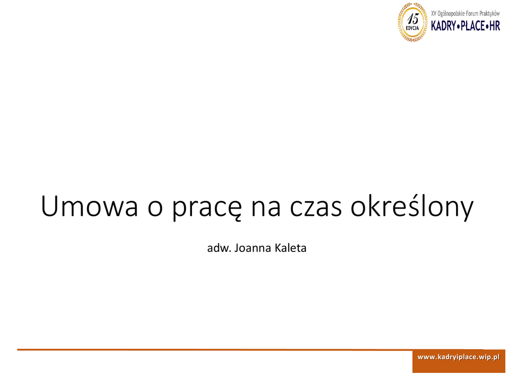 Umowa o pracę na czas określony adw. Joanna Kaleta www.kadryiplace.wip.pl Główne zmiany wprowadzane nowelizacją Kodeksu pracy to: 1) dookreślenie specyfiki umowy o pracę na okres próbny; 2) ograniczenie rodzajów umów o pracę do trzech - w miejsce obecnych pięciu, dokonane poprzez rezygnację z umowy o pracę na czas wykonania określonej pracy oraz umowy na zastępstwo; 3) zmiana zasad zatrudniania pracowników na podstawie umów o pracę na czas określony przez wprowadzenie bardziej skutecznego sposobu limitowania tych umów; 4) uzależnienie długości okresu wypowiedzenia umowy o pracę zawartej na czas określony od okresu zatrudnienia u danego pracodawcy, analogicznie jak w przypadku umowy o pracę zawartej na czas nieokreślony; 5) umożliwienie pracodawcy jednostronnego zwolnienia pracownika z obowiązku świadczenia pracy w okresie wypowiedzenia z zachowaniem prawa do wynagrodzenia. www.kadryiplace.wip.pl Dookreślenie specyfiki umowy o pracę na okres próbny. W znowelizowanych przepisach wyraźnie określono cel zatrudnienia pracownika na podstawie umowy o pracę na okres próbny. Zgodnie z brzmieniem nowego art. 25 k.p. umowę o pracę na okres próbny, nieprzekraczający 3 miesięcy, zawiera się w celu sprawdzenia kwalifikacji pracownika i możliwości jego zatrudnienia w celu wykonywania określonego rodzaju pracy. Ponadto zatrudnienie na podstawie umowy o pracę na okres próbny powinno być tylko jednorazowe. Ponowne zawarcie umowy o pracę na okres próbny z tym samym pracownikiem będzie możliwe jedynie gdy: 1) pracownik ma być zatrudniony w celu wykonywania innego rodzaju pracy; 2) po upływie co najmniej 3 lat od dnia rozwiązania lub wygaśnięcia poprzedniej umowy o pracę, jeżeli pracownik ma być zatrudniony w celu wykonywania tego samego rodzaju pracy; w tym przypadku dopuszczalne jest jednokrotne ponowne zawarcie umowy na okres próbny. Umowy o pracę na okres próbny są wyłączone z zakresu stosowania art. 25[1] Kodeksu pracy. Przemawia za tym jej szczególny charakter wyznaczający cel jakiemu służy, tj. m.in. sprawdzenie kwalifikacji i umiejętności pracownika, przydatności na zajmowanym stanowisku, praktyczne przygotowywanie go do objęcia określonego stanowiska pracy. www.kadryiplace.wip.pl Ograniczenia umów terminowych co do czasu ich trwania i liczby Zgodnie z nowym brzmieniem art. 25[1] k.p. okres zatrudnienia na podstawie umowy o pracę na czas określony oraz łączny okres zatrudnienia na podstawie umów o pracę na czas określony zawieranych między tymi samymi stronami stosunku pracy nie będzie mógł przekraczać 33 miesięcy, a łączna liczba tych umów nie będzie mogła przekraczać trzech. Przepisy regulują również skutki przekroczenia wskazanego 33 miesięcznego okresu trwania umów terminowych oraz przekroczenia dopuszczalnej liczby tych umów. Jeżeli okres zatrudnienia na podstawie umowy o pracę lub umów o pracę na czas określony przekraczać będzie 33 miesiące lub liczba takich umów przekroczy trzy, to od następnego dnia po upływie 33miesięcznego okresu zatrudnienia lub od dnia zawarcia czwartej umowy o pracę na czas określony pracownik będzie traktowany jak zatrudniony na podstawie umowy o pracę na czas nieokreślony. Przy czym uzgodnienie między stronami w trakcie trwania umowy o pracę na czas określony dłuższego okresu wykonywania pracy na podstawie tej umowy uważane będzie za zawarcie, od dnia następującego po dniu, w którym miało nastąpić jej rozwiązanie, nowej umowy o pracę na czas określony. www.kadryiplace.wip.pl Ograniczenia umów terminowych co do czasu ich trwania i liczby Powyższe limity ograniczające zatrudnienie na podstawie umowy lub umów o pracę na czas określony nie będą dotyczyły umowy zawartej: 1) w celu zastępstwa pracownika w czasie jego usprawiedliwionej nieobecności w pracy, 2) w celu wykonywania pracy o charakterze dorywczym lub sezonowym, 3) w celu wykonywania pracy przez okres kadencji, 4) gdy pracodawca wskaże obiektywne przyczyny leżące po jego stronie jeżeli ich zawarcie w danym przypadku służy zaspokojeniu rzeczywistego zapotrzebowania o charakterze okresowym i jest niezbędne w tym zakresie w świetle wszystkich okoliczności zawarcia umowy. W takich przypadkach konieczne będzie określenie w umowie o pracę tego celu lub okoliczności, tj. zamieszczenie informacji o przyczynach obiektywnie uzasadniających zawarcie takiej umowy (art. 29 § 11 k.p.). www.kadryiplace.wip.pl Ograniczenia umów terminowych co do czasu ich trwania i liczby Ponadto, w przypadku zawarcia umowy o pracę na czas określony z powodu obiektywnych przyczyn leżących po stronie pracodawcy, pracodawca będzie miał obowiązek zawiadomienia właściwego okręgowego inspektora pracy, w formie pisemnej lub elektronicznej, o zawarciu takiej umowy, wskazując jednocześnie przyczynę jej zawarcia, w terminie 5 dni roboczych od dnia jej zawarcia (art. 25[1] § 5 k.p.). Niedochowanie tego obowiązku stanowić będzie wykroczenie przeciwko prawom pracownika, zagrożone karą grzywny od 1000 zł do 30 000 zł (art. 281 pkt 1a k.p.). www.kadryiplace.wip.pl Nowe okresy wypowiedzenia umów terminowych Zarówno umowa o pracę na czas określony, jak i umowa o pracę na czas nieokreślony będą mogły być wypowiedziane przez pracodawcę, jak i przez pracownika z zachowaniem ustawowo określonego okresu wypowiedzenia, którego długość w obu przypadkach będzie taka sama i będzie zależała od okresu zatrudnienia u danego pracodawcy (art. 36 § 1 k.p.). Od dnia wejścia w życie nowelizacji obowiązywać będą następujące okresy wypowiedzenia umowy o pracę na czas określony i na czas nieokreślony: a) 2 tygodnie - w przypadku zatrudnienia u danego pracodawcy przez okres krótszy niż 6 miesięcy, b) 1 miesiąc - w przypadku zatrudnienia u danego pracodawcy przez okres co najmniej 6 miesięcy, c) 3 miesiące - w przypadku zatrudnienia u danego pracodawcy przez okres c