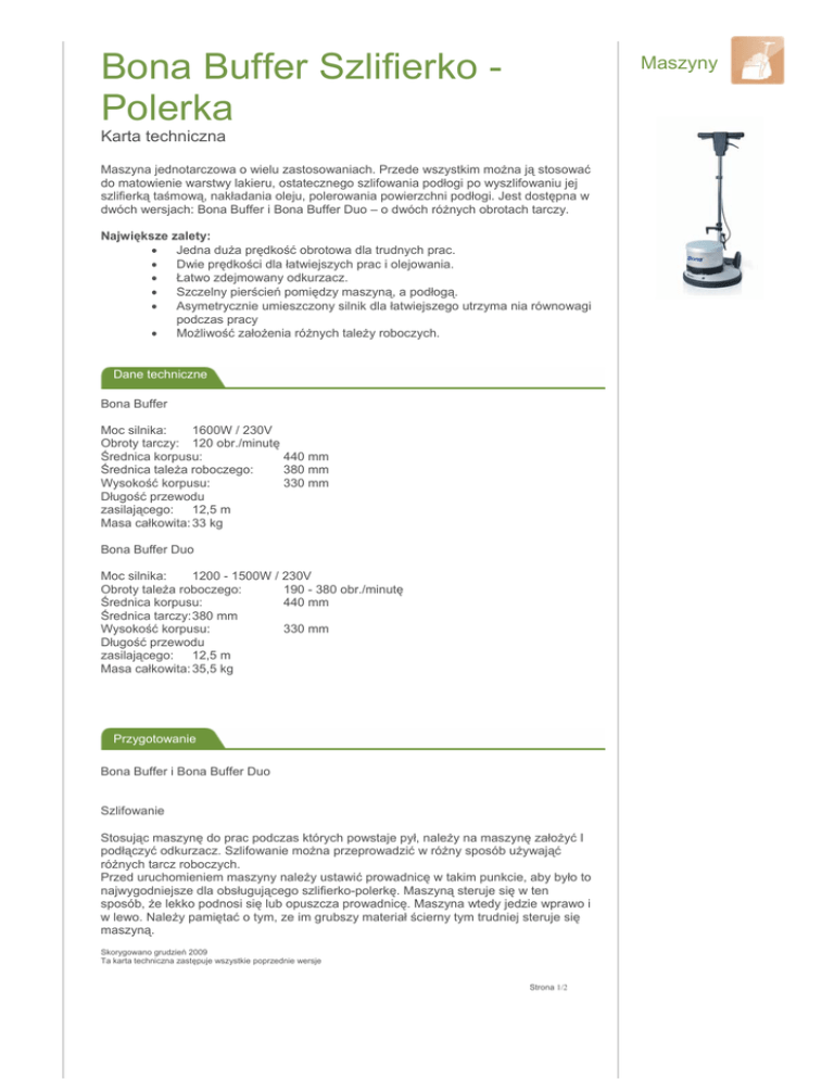 Bona Buffer Szlifierko Polerka Maszyny Karta techniczna Maszyna jednotarczowa o wielu zastosowaniach. Przede wszystkim można ją stosować do matowienie warstwy lakieru, ostatecznego szlifowania podłogi po wyszlifowaniu jej szlifierką taśmową, nakładania oleju, polerowania powierzchni podłogi. Jest dostępna w dwóch wersjach: Bona Buffer i Bona Buffer Duo – o dwóch różnych obrotach tarczy. Największe zalety: • Jedna duża prędkość obrotowa dla trudnych prac. • Dwie prędkości dla łatwiejszych prac i olejowania. • Łatwo zdejmowany odkurzacz. • Szczelny pierścień pomiędzy maszyną, a podłogą. • Asymetrycznie umieszczony silnik dla łatwiejszego utrzyma nia równowagi podczas pracy • Możliwość założenia różnych tależy roboczych. Dane techniczne Bona Buffer Moc silnika: 1600W / 230V Obroty tarczy: 120 obr./minutę Średnica korpusu: 440 mm Średnica tależa roboczego: 380 mm Wysokość korpusu: 330 mm Długość przewodu zasilającego: 12,5 m Masa całkowita: 33 kg Bona Buffer Duo Moc silnika: 1200 - 1500W / 230V Obroty tależa roboczego: 190 - 380 obr./minutę Średnica korpusu: 440 mm Średnica tarczy: 380 mm Wysokość korpusu: 330 mm Długość przewodu zasilającego: 12,5 m Masa całkowita: 35,5 kg Przygotowanie Bona Buffer i Bona Buffer Duo Szlifowanie Stosując maszynę do prac podczas których powstaje pył, należy na maszynę założyć I podłączyć odkurzacz. Szlifowanie można przeprowadzić w różny sposób używająć różnych tarcz roboczych. Przed uruchomieniem maszyny należy ustawić prowadnicę w takim punkcie, aby było to najwygodniejsze dla obsługującego szlifierko-polerkę. Maszyną steruje się w ten sposób, że lekko podnosi się lub opuszcza prowadnicę. Maszyna wtedy jedzie wprawo i w lewo. Należy pamiętać o tym, ze im grubszy materiał ścierny tym trudniej steruje się maszyną. Skorygowano grudzień 2009 Ta karta techniczna zastępuje wszystkie poprzednie wersje Strona 1/2 Bona Buffer Szlifierko Polerka Maszyny Karta techniczna Bona Scrad – pad bordowy z założonym na niego „listkiem” papieru ściernego Scrad Wind należy podkładać bezpośrednio pod tależ roboczy. Śiatkę ścierną należy położyć na podłogę, następnie na nią położyć pad i postawić na niego maszynę, Tależ 4W (Quadro) z założonymi na niego krążkami ściernymi o średnicy 150 mm działa podobnie jak tależ roboczy. Sprzątanie Do mycia I sprzątania należy używać padów. Kolor padu dobiera się w zalezności od rodzaju wykonywanej pracy. Olejowanie Olej należy nakładać zgodnie z instrukcją zamieszczoną na etykiecie opakowania oleju lub zgodnie z Kartą Ttechniczną oleju. UWAGA: Istnieje ryzyko samozapłonu Uwagi: 1. 2. 3. 4. W przypadku braku doświadzenia w obsłudze maszyny należt pod maszynę położyć biały pad i zacząć pracę na środku pomieszczenia. Niższe ustawienie prowadnicy ułatwia pracę. Należy zawsze utrzymywac maszynę i przewód zasilający w czystości zwłaszcza po zakończeni olejowania podłogi. Przewód zasilający nie może być uszkodzony i musi być podłączony do gniazda z uziemieniem. Więcej informacji znajduje się w Instrukcji Obsługi Bona Buffer. Skorygowano grudzień 2009 Ta karta techniczna zastępuje wszystkie poprzednie wersje Strona 2/2