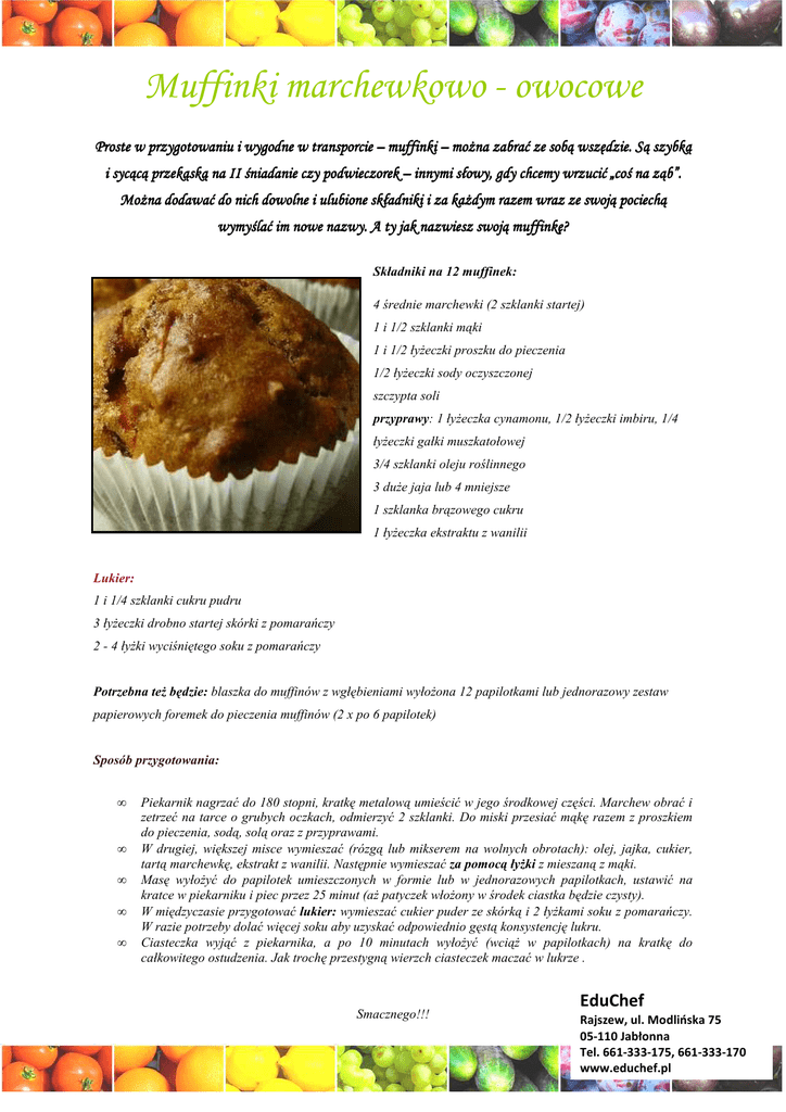 Muffinki marchewkowo - owocowe Proste w przygotowaniu i wygodne w transporcie – muffinki – można zabrać ze sobą wszędzie. Są szybką i sycącą przekąską na II śniadanie czy podwieczorek – innymi słowy, słowy, gdy chcemy wrzucić „coś na ząb” ząb”. Można dodawać do nich dowolne i ulubione składniki i za każdym razem wraz ze swoją pociechą wymyślać im nowe nazwy. A ty jak nazwiesz swoją muffinkę? Składniki na 12 muffinek: 4 średnie marchewki (2 szklanki startej) 1 i 1/2 szklanki mąki 1 i 1/2 łyżeczki proszku do pieczenia 1/2 łyżeczki sody oczyszczonej szczypta soli przyprawy: 1 łyżeczka cynamonu, 1/2 łyżeczki imbiru, 1/4 łyżeczki gałki muszkatołowej 3/4 szklanki oleju roślinnego 3 duże jaja lub 4 mniejsze 1 szklanka brązowego cukru 1 łyżeczka ekstraktu z wanilii Lukier: 1 i 1/4 szklanki cukru pudru 3 łyżeczki drobno startej skórki z pomarańczy 2 - 4 łyżki wyciśniętego soku z pomarańczy Potrzebna też będzie: blaszka do muffinów z wgłębieniami wyłożona 12 papilotkami lub jednorazowy zestaw papierowych foremek do pieczenia muffinów (2 x po 6 papilotek) Sposób przygotowania: • • • • • Piekarnik nagrzać do 180 stopni, kratkę metalową umieścić w jego środkowej części. Marchew obrać i zetrzeć na tarce o grubych oczkach, odmierzyć 2 szklanki. Do miski przesiać mąkę razem z proszkiem do pieczenia, sodą, solą oraz z przyprawami. W drugiej, większej misce wymieszać (rózgą lub mikserem na wolnych obrotach): olej, jajka, cukier, tartą marchewkę, ekstrakt z wanilii. Następnie wymieszać za pomocą łyżki z mieszaną z mąki. Masę wyłożyć do papilotek umieszczonych w formie lub w jednorazowych papilotkach, ustawić na kratce w piekarniku i piec przez 25 minut (aż patyczek włożony w środek ciastka będzie czysty). W międzyczasie przygotować lukier: wymieszać cukier puder ze skórką i 2 łyżkami soku z pomarańczy. W razie potrzeby dolać więcej soku aby uzyskać odpowiednio gęstą konsystencję lukru. Ciasteczka wyjąć z piekarnika, a po 10 minutach wyłożyć (wciąż w papilotkach) na kratkę do całkowitego ostudzenia. Jak trochę przestygną wierzch ciasteczek maczać w lukrze . Smacznego!!! EduChef Rajszew, ul. Modlińska 75 05-110 Jabłonna Tel. 661-333-175, 661-333-170 www.educhef.pl