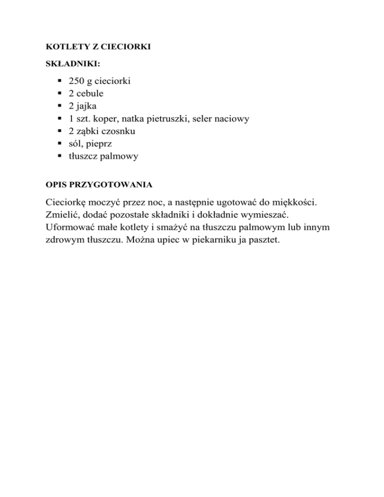 KOTLETY Z CIECIORKI SKŁADNIKI: 250 g cieciorki 2 cebule 2 jajka 1 szt. koper, natka pietruszki, seler naciowy 2 ząbki czosnku sól, pieprz tłuszcz palmowy OPIS PRZYGOTOWANIA Cieciorkę moczyć przez noc, a następnie ugotować do miękkości. Zmielić, dodać pozostałe składniki i dokładnie wymieszać. Uformować małe kotlety i smażyć na tłuszczu palmowym lub innym zdrowym tłuszczu. Można upiec w piekarniku ja pasztet.