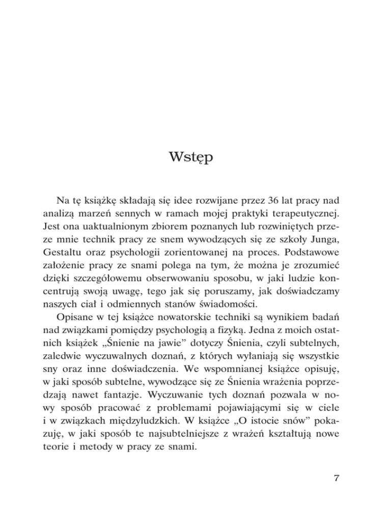 Spis treci Wstêp Na tę książkę składają się idee rozwijane przez 36 lat pracy nad analizą marzeń sennych w ramach mojej praktyki terapeutycznej. Jest ona uaktualnionym zbiorem poznanych lub rozwiniętych przeze mnie technik pracy ze snem wywodzących się ze szkoły Junga, Gestaltu oraz psychologii zorientowanej na proces. Podstawowe założenie pracy ze snami polega na tym, że można je zrozumieć dzięki szczegółowemu obserwowaniu sposobu, w jaki ludzie koncentrują swoją uwagę, tego jak się poruszamy, jak doświadczamy naszych ciał i odmiennych stanów świadomości. Opisane w tej książce nowatorskie techniki są wynikiem badań nad związkami pomiędzy psychologią a fizyką. Jedna z moich ostatnich książek „Śnienie na jawie” dotyczy Śnienia, czyli subtelnych, zaledwie wyczuwalnych doznań, z których wyłaniają się wszystkie sny oraz inne doświadczenia. We wspomnianej książce opisuję, w jaki sposób subtelne, wywodzące się ze Śnienia wrażenia poprzedzają nawet fantazje. Wyczuwanie tych doznań pozwala w nowy sposób pracować z problemami pojawiającymi się w ciele i w związkach międzyludzkich. W książce „O istocie snów” pokazuję, w jaki sposób te najsubtelniejsze z wrażeń kształtują nowe teorie i metody w pracy ze snami. 7 Arnold Mindell TWÓRCA SNÓW Jestem wdzięczny C. G. Jungowi za umiejętności pozwalające ujawniać znaczenie snów. Osobiście nigdy go nie spotkałem, ale regularnie widuję się z nim w moich snach. Dziękuję Barbarze Hannah za to, że nauczyła mnie zauważać, w jaki sposób sny są obecne w danej chwili. To ona skierowała mnie do Marii Louise von Franz, jednej z ważniejszych uczennic Junga. Marie Louise była mistrzynią w pracy ze snami. Z kolei dr Franz Riklin pomógł mi zrozumieć, jak sny oddziałują na codzienne życie. Wymienieni nauczyciele wraz z innymi członkami społeczności analityków jungowskich uczyli mnie, w jaki sposób stosować w praktyce idee Junga. Wiele z tych idei, zarówno wspomnianych nauczycieli, jak i samego Junga, nigdy nie zostało opublikowanych. Możliwe, że szereg z tych pomysłów nieświadomie włączyłem lub wplotłem w koncepcje prezentowane w niniejszej książce. Chciałbym podziękować wszystkim moim nauczycielom za przekazaną wiedzę oraz za wpływ, jaki na mnie wywarli. 8